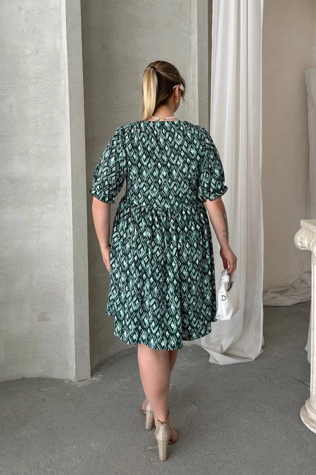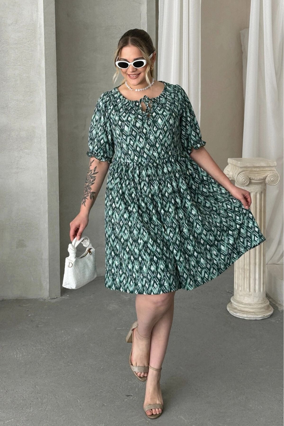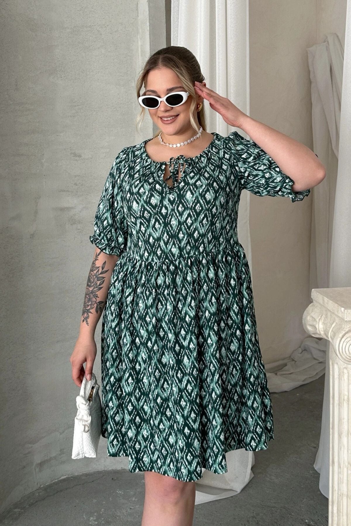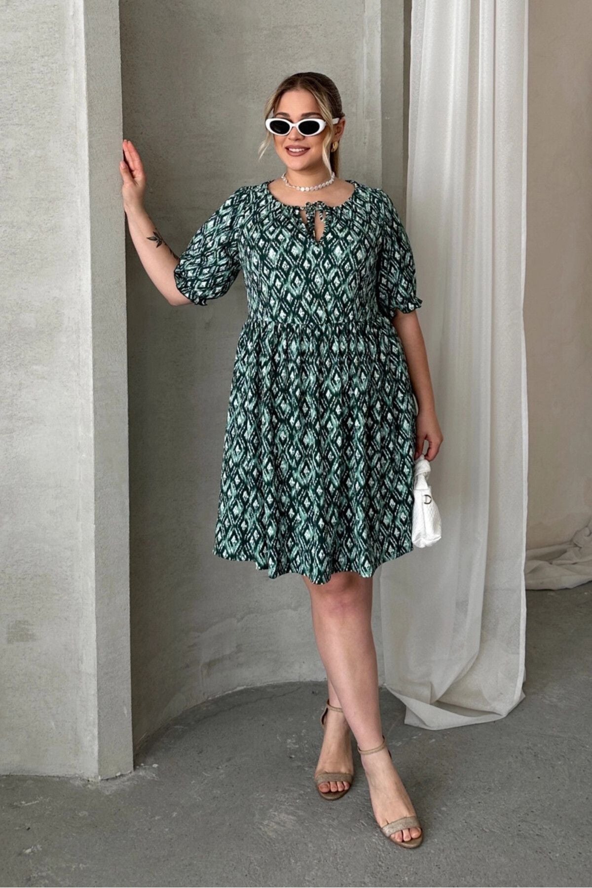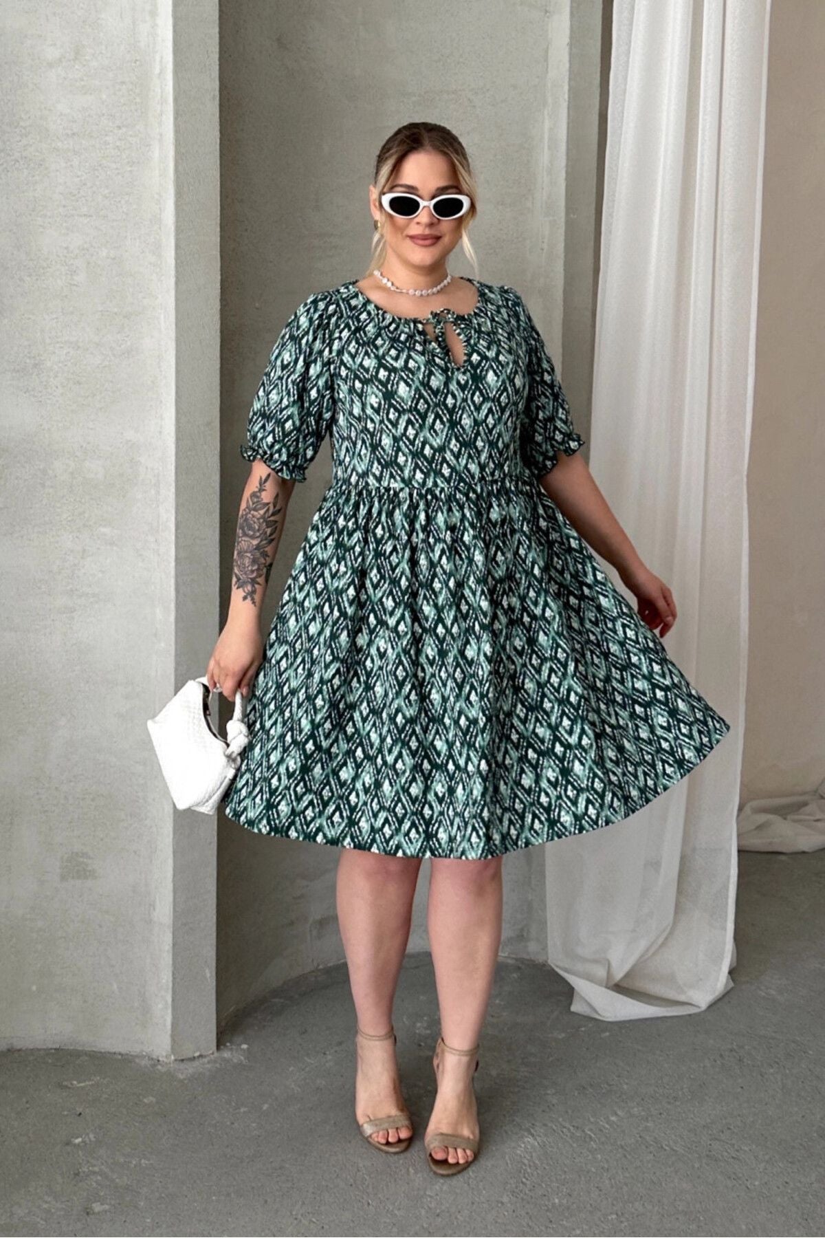 שמלה במידות גדולות פרטי קשירה בחזית חצי שרוול עם הדפס מיני 101-8