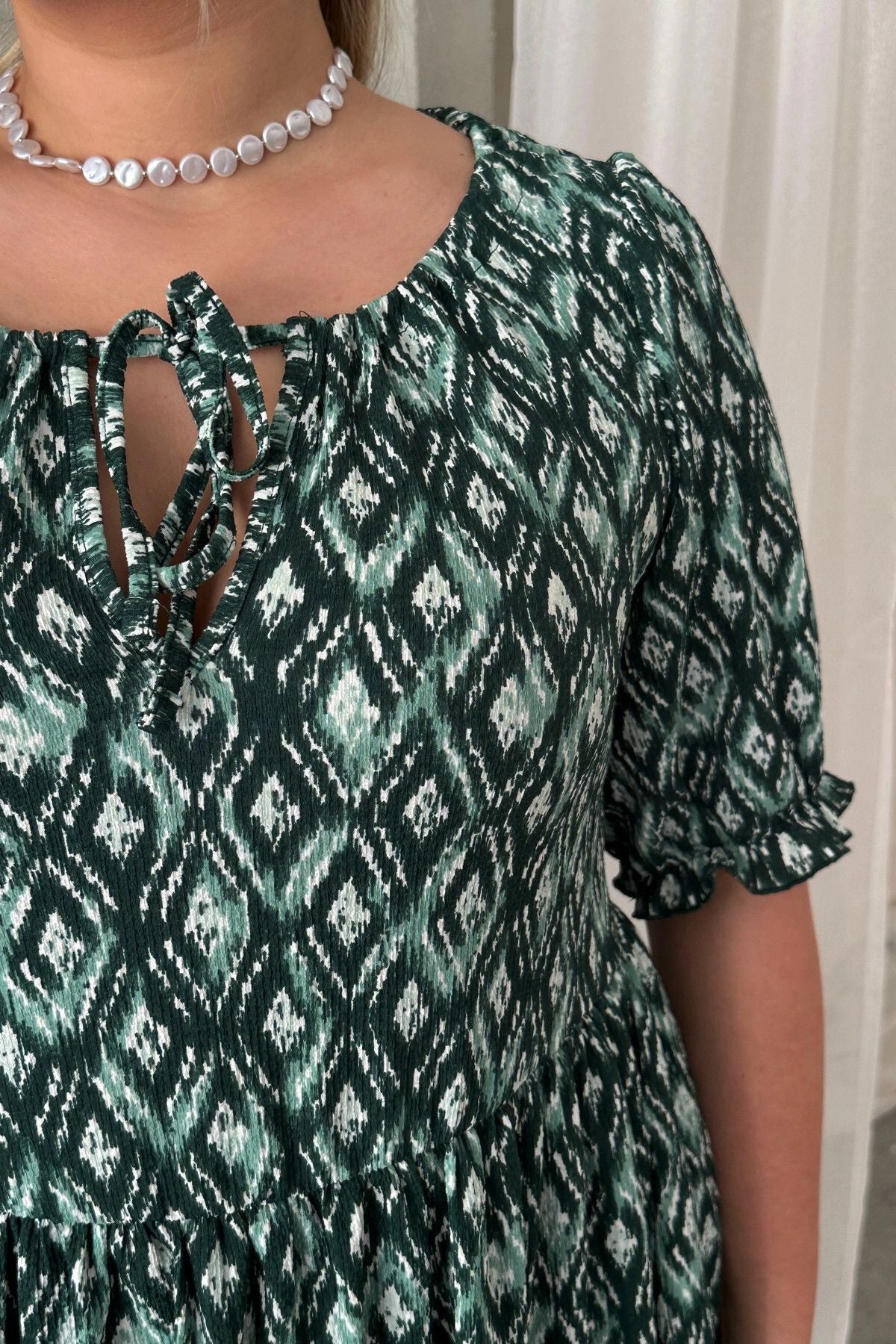 - תיאור מוצר: שמלה עם הדפס ופרטי קשירה בחזית לחוויית לבישה נוחה.