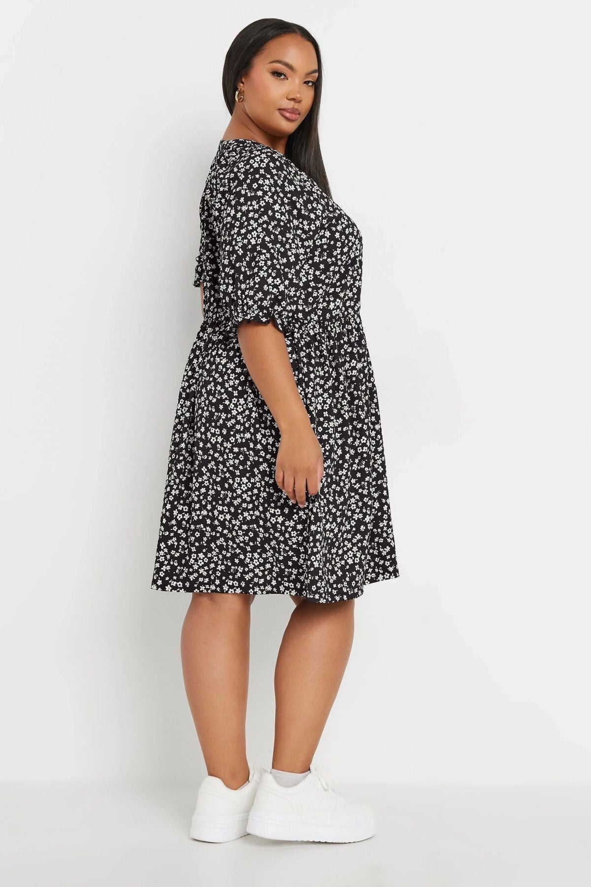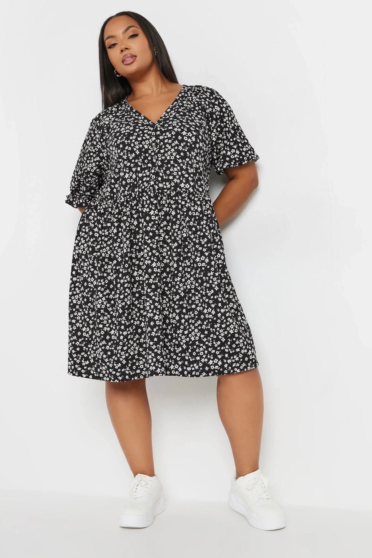 שמלה קצרה במידות גדולות צווארון V קשירה בחזית עם כפתורים שרוולים עם גומי 137950