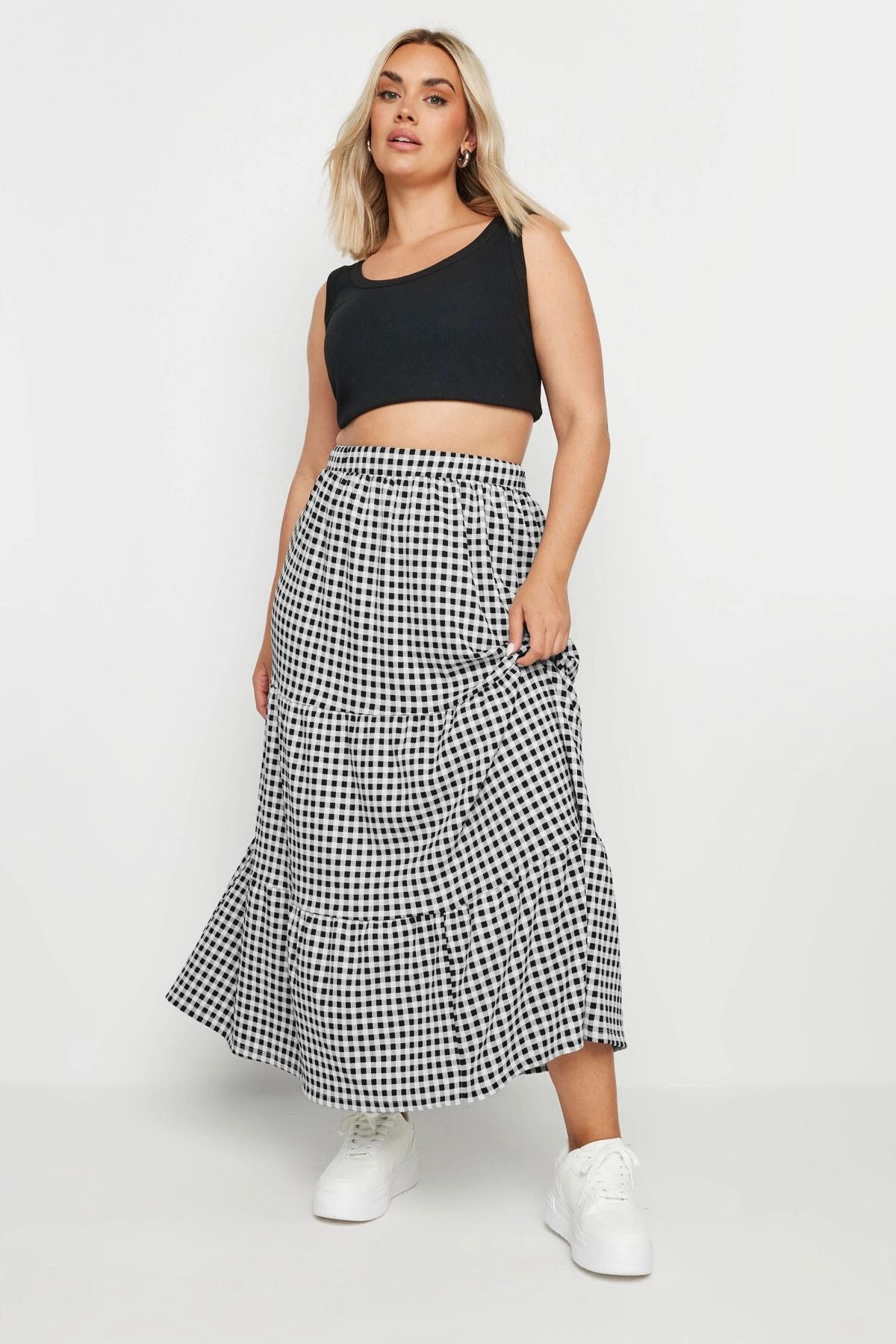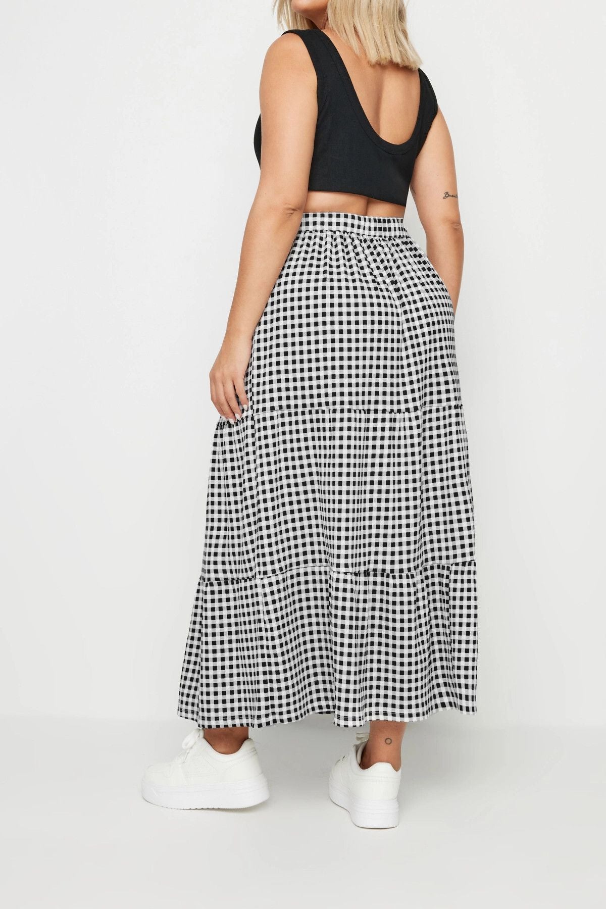• תיאור מוצר: אפשרות מושלמת לכל תוכניות הקיץ היומיות שלכם, חצאית מקסי חדשה זו מיוצרת מבד ג'רסי במרקם. דוגמת המשבצות, העיצוב בשכבות ורצועת המותן האלסטית מעניקים לה מראה בולט. בשילוב פריט עליון ללא שרוולים וסנדלים מתקבל מראה קיצי שתרצו ללבוש שוב ושוב. דוגמה זו, שעליכם להוסיף לקולקציה, מועמדת להיות הפריט האהוב במלתחה שלכם.