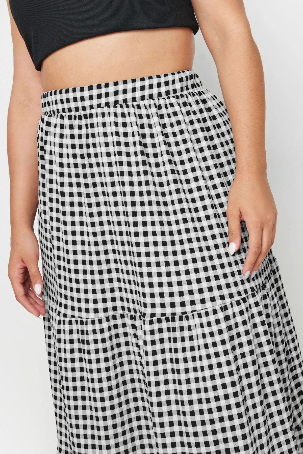 • פרטי הדגם: דוגמת משבצות, עיצוב בשכבות, מקסי, רצועת מותן אלסטית