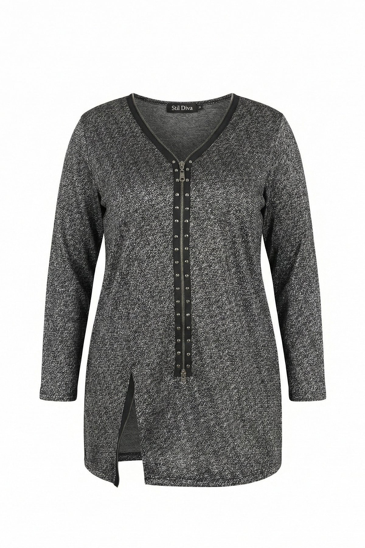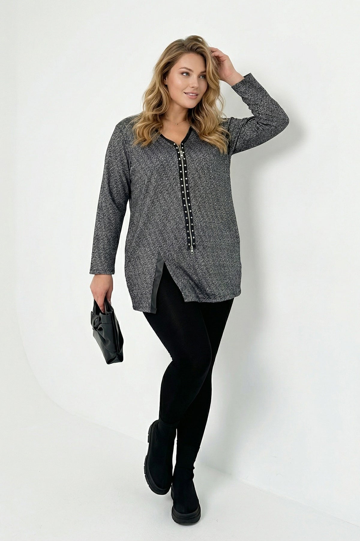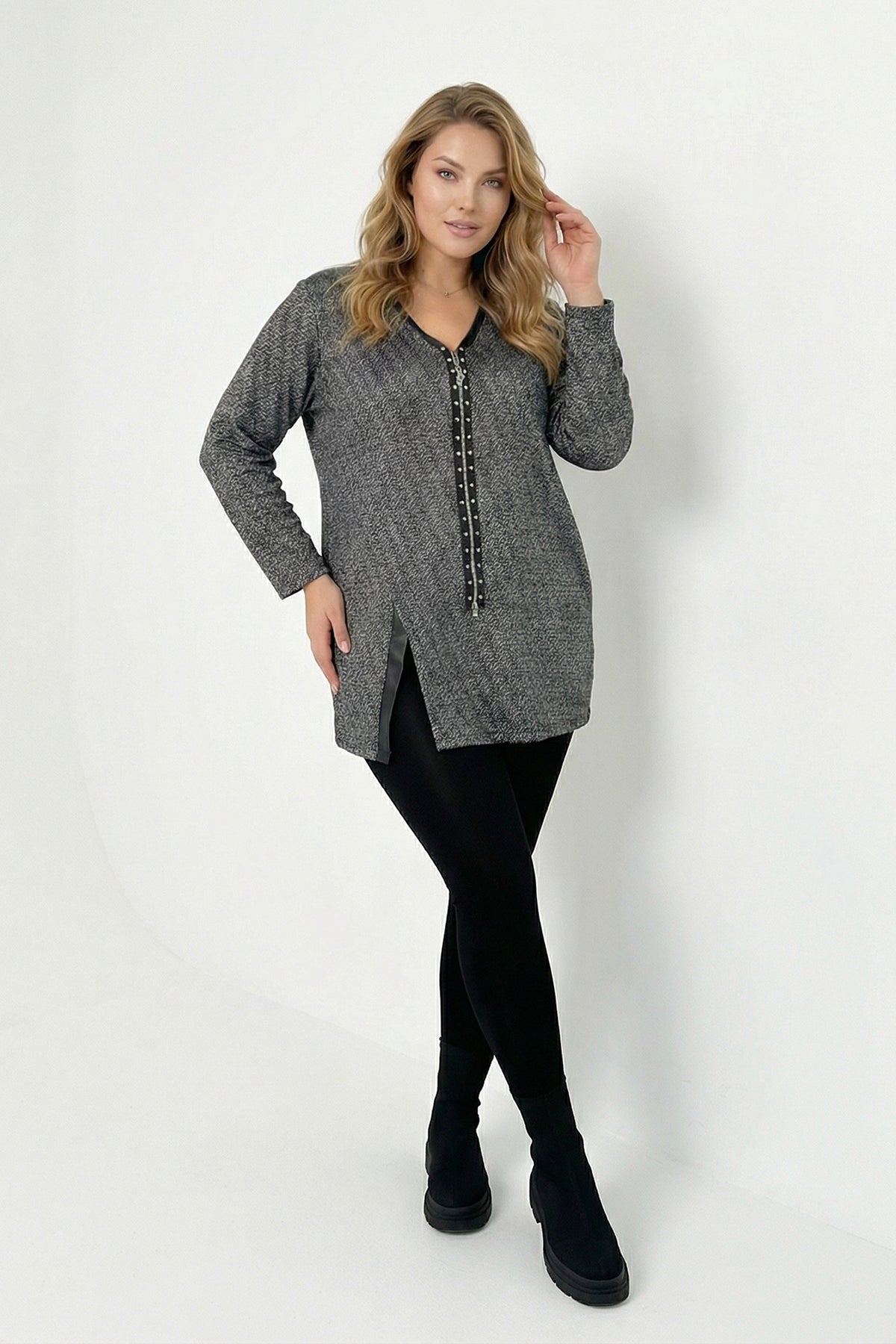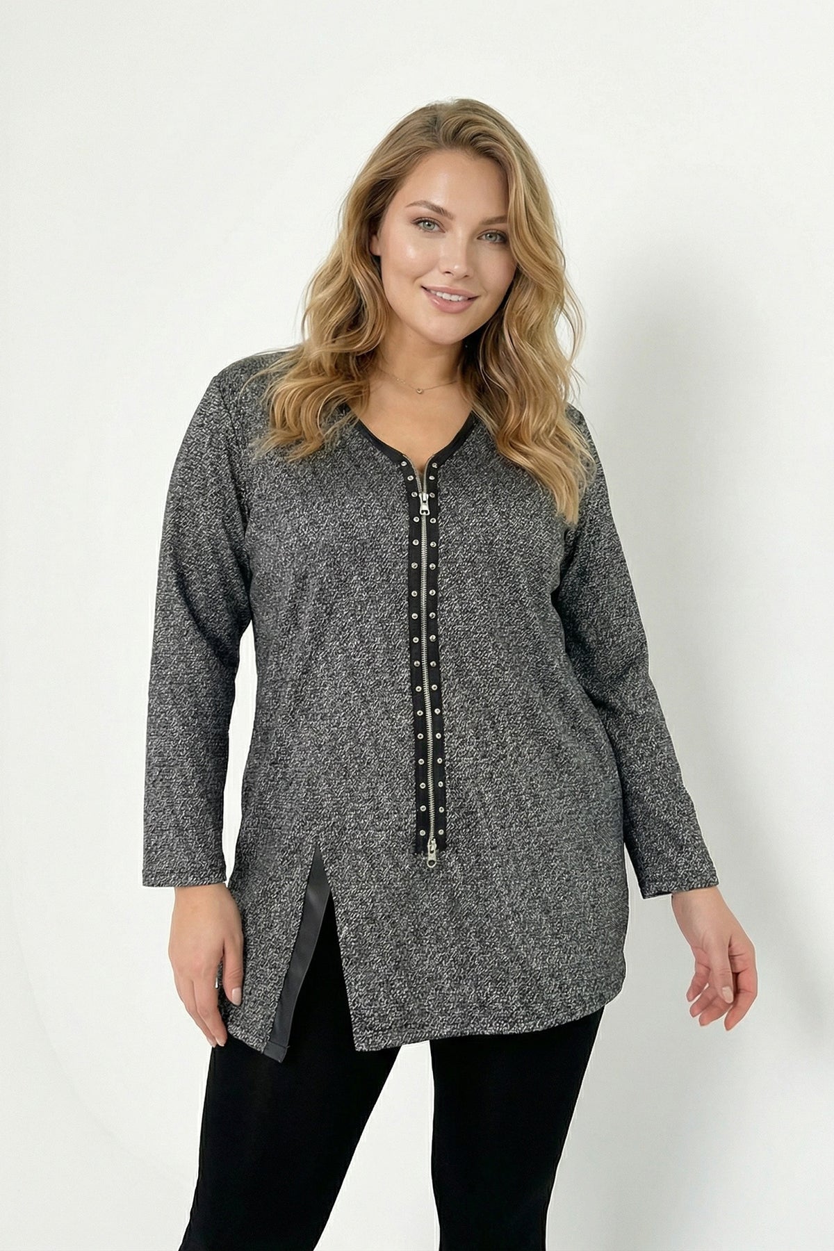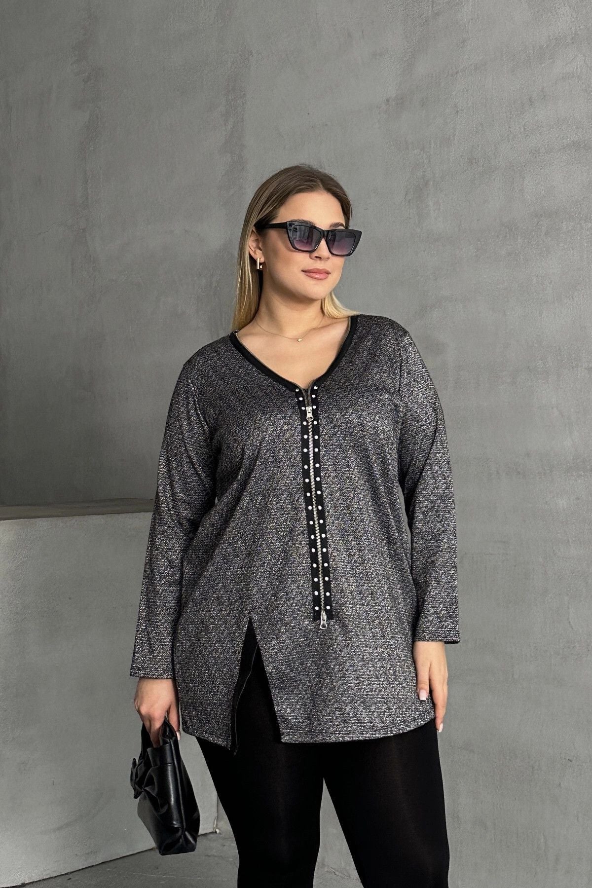חולצה במידות גדולות צווארון וי רוכסן קדמי