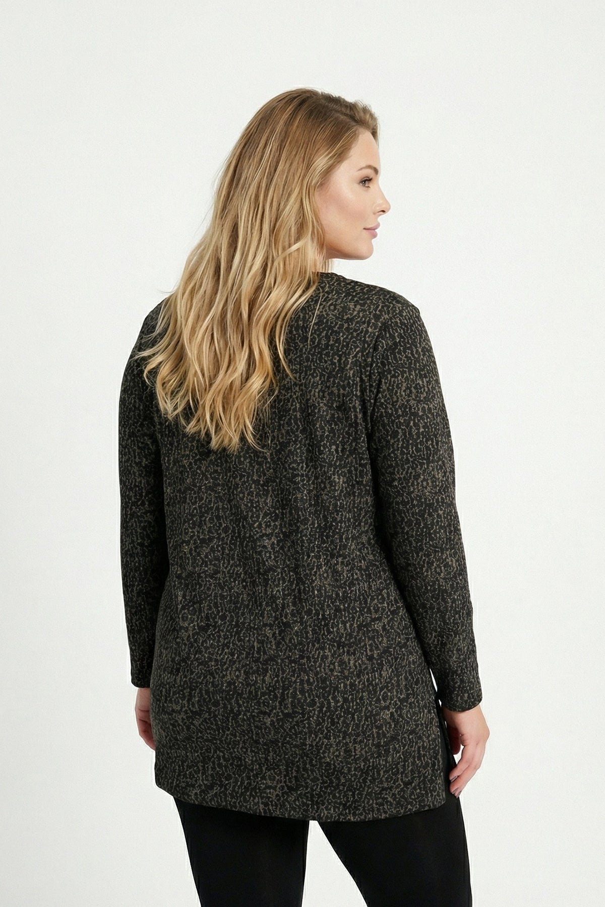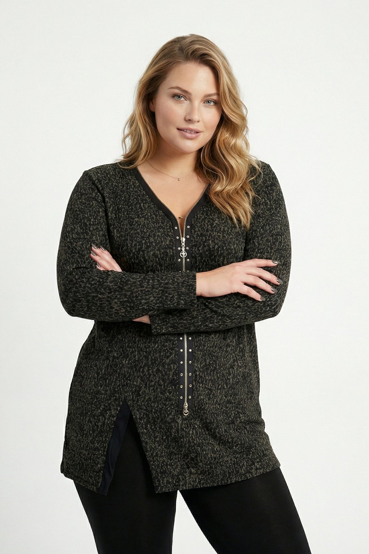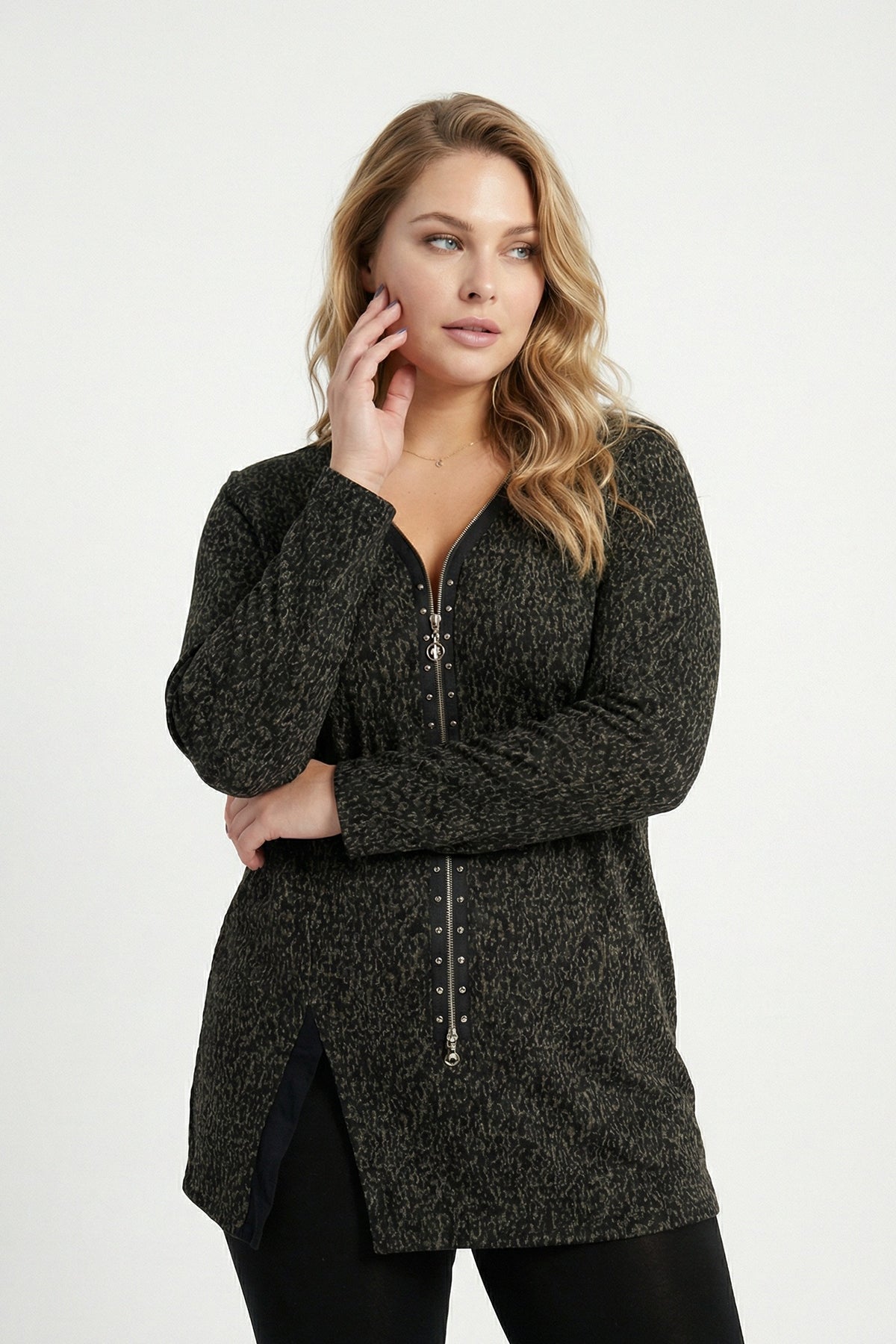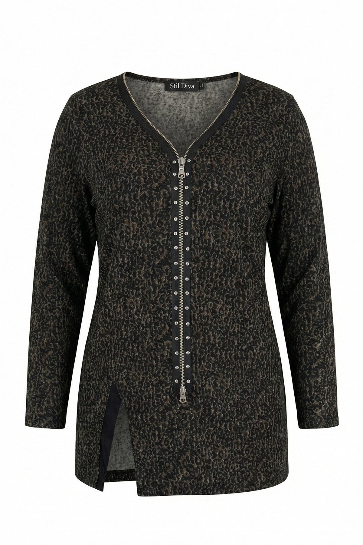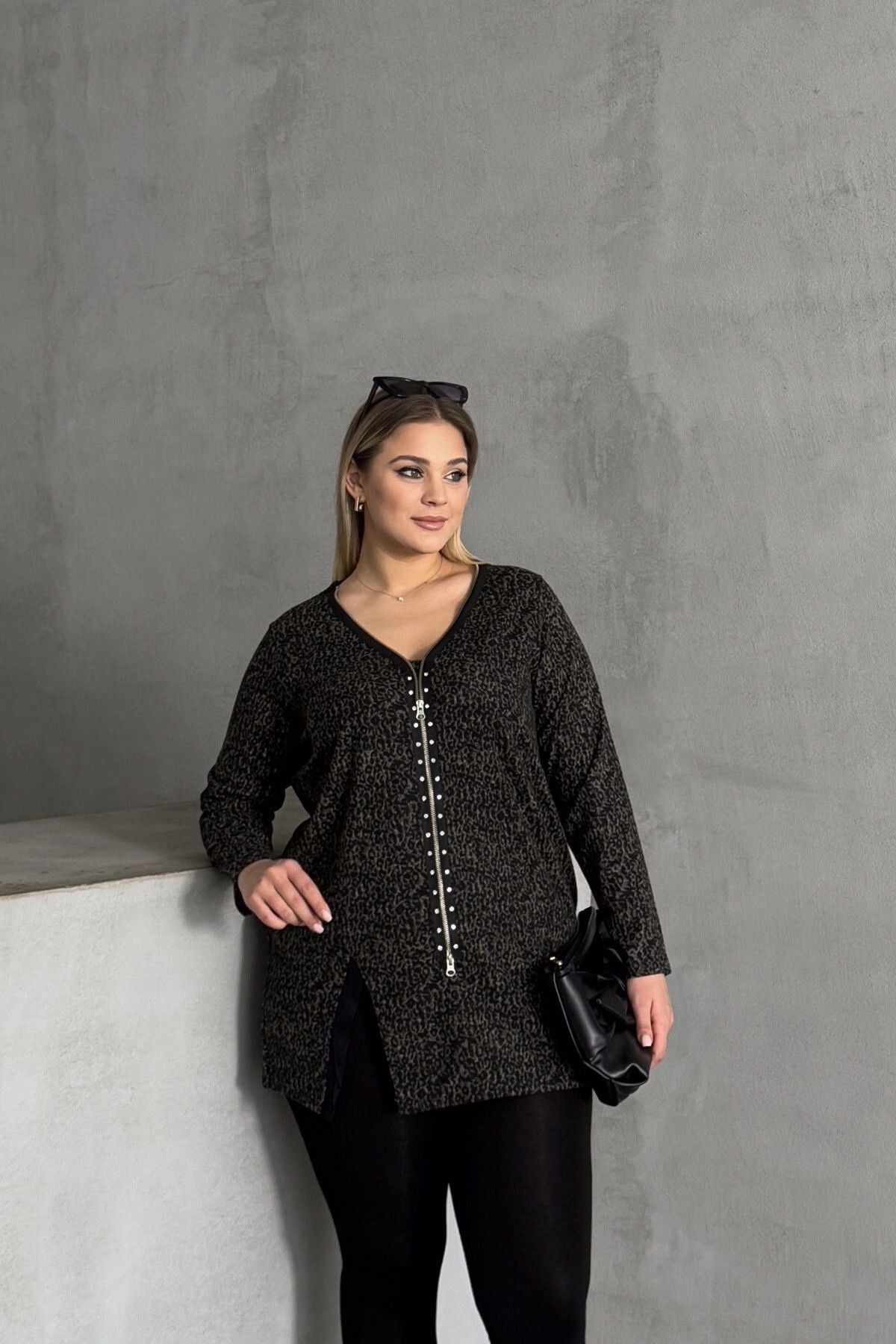 - פרטי הדגם: צווארון וי, רוכסן קדמי, שרוול ארוך, חזית אסימטרית עם שסע, עם הדפס נמר