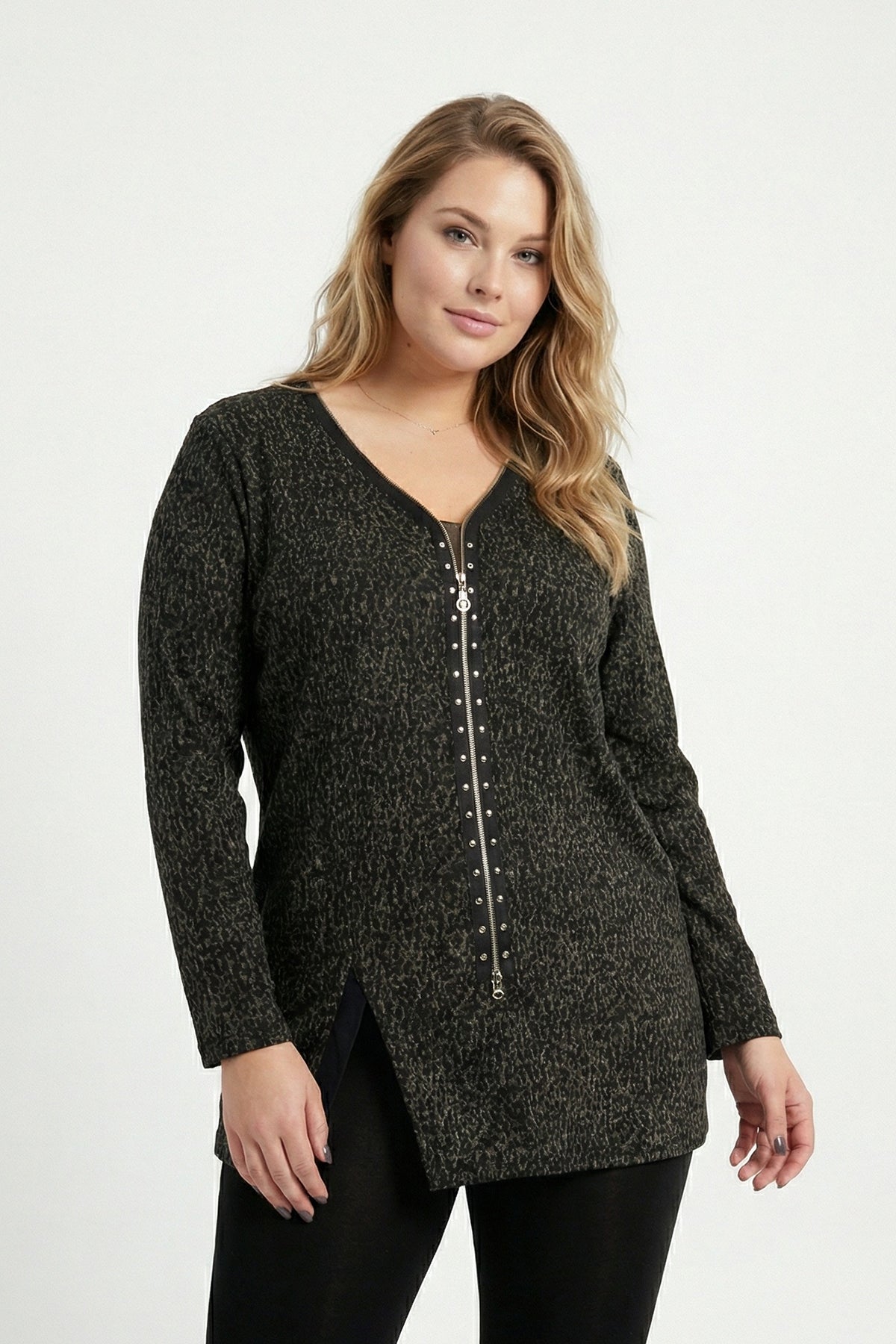 חולצה במידות גדולות צווארון וי רוכסן קדמי עם הדפס