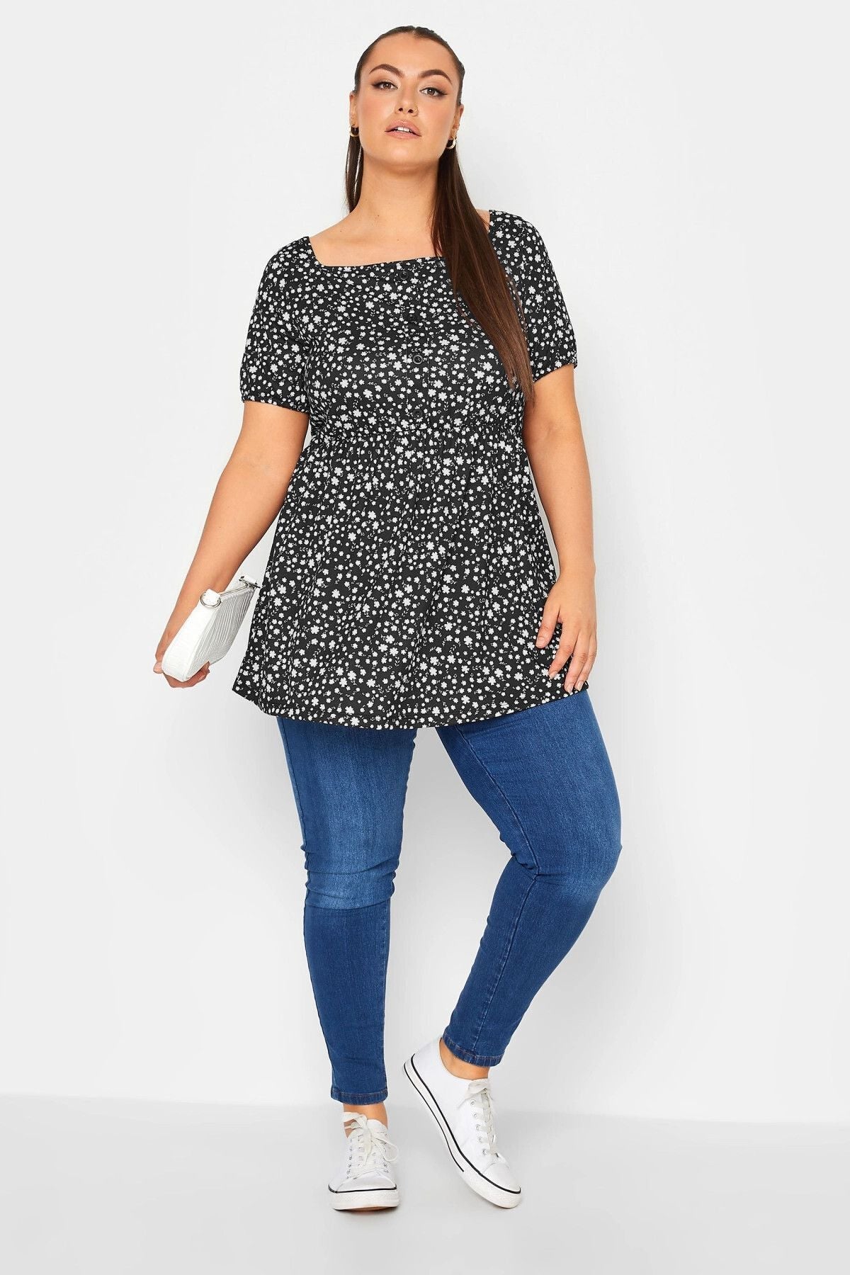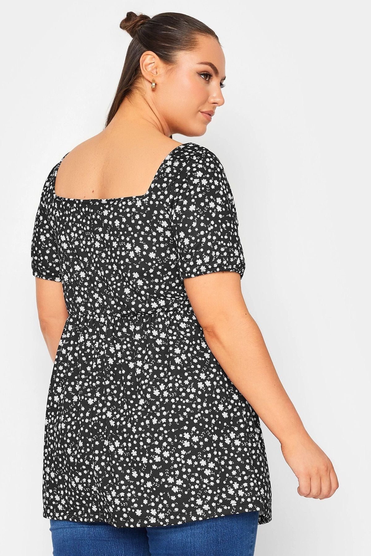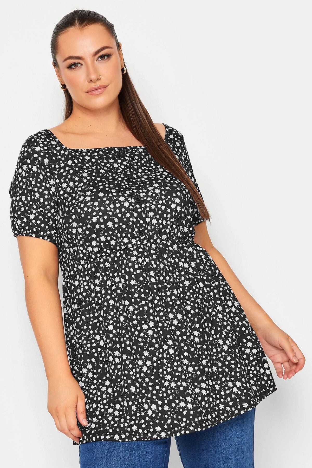 חולצה במידות גדולות כפתורים דקורטיביים צווארון מרובע עם הדפס בד גמיש 215849