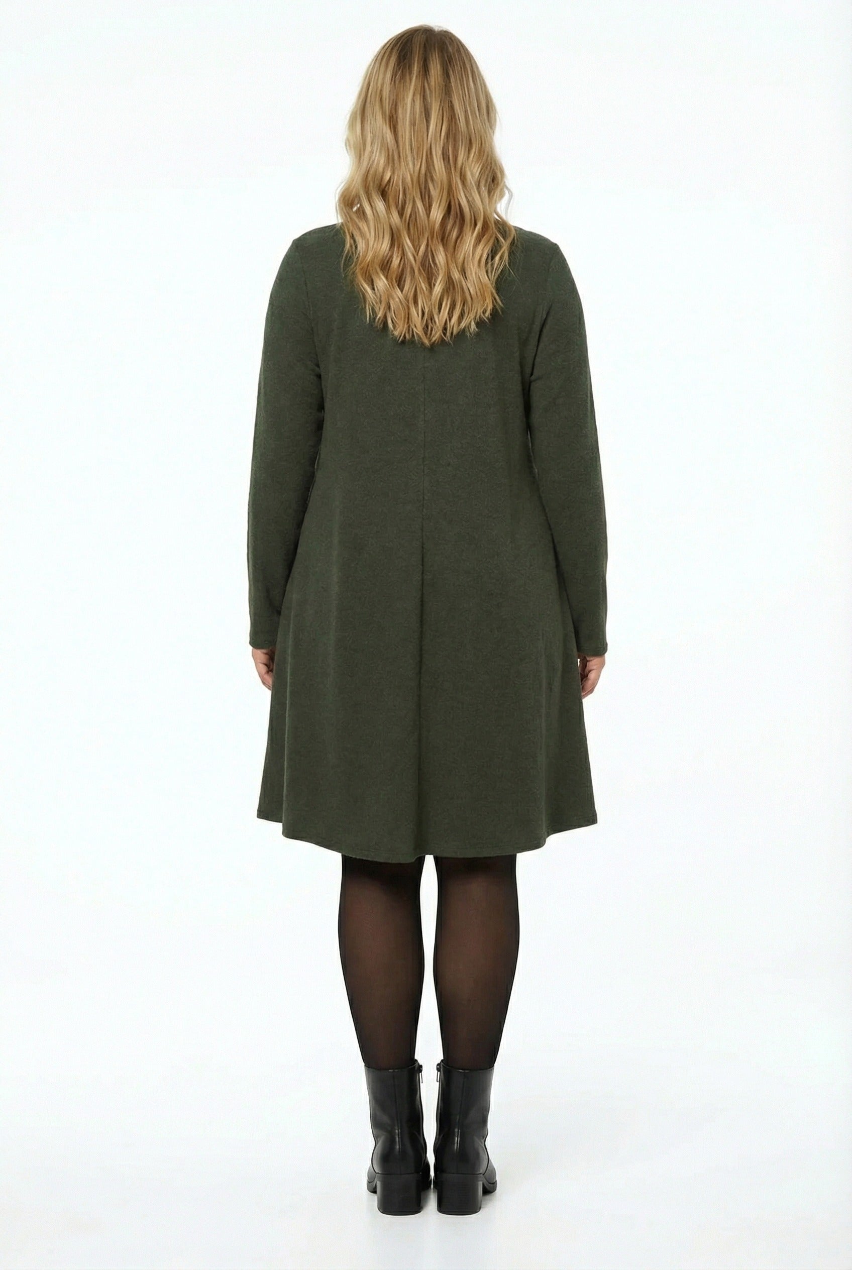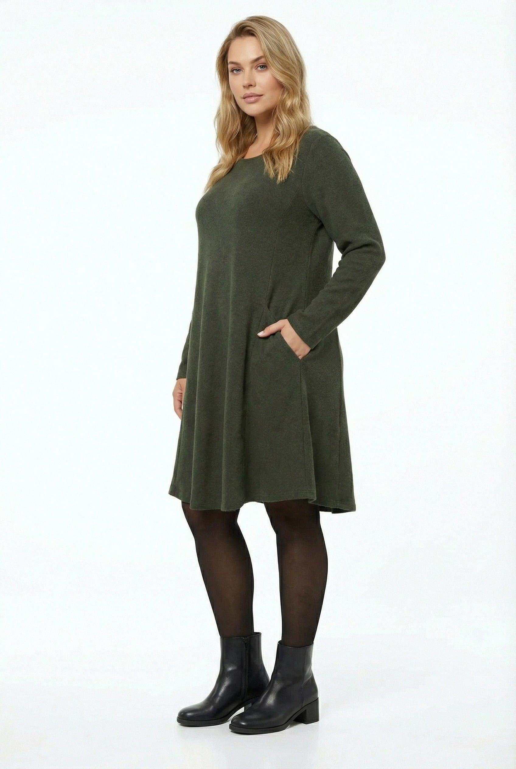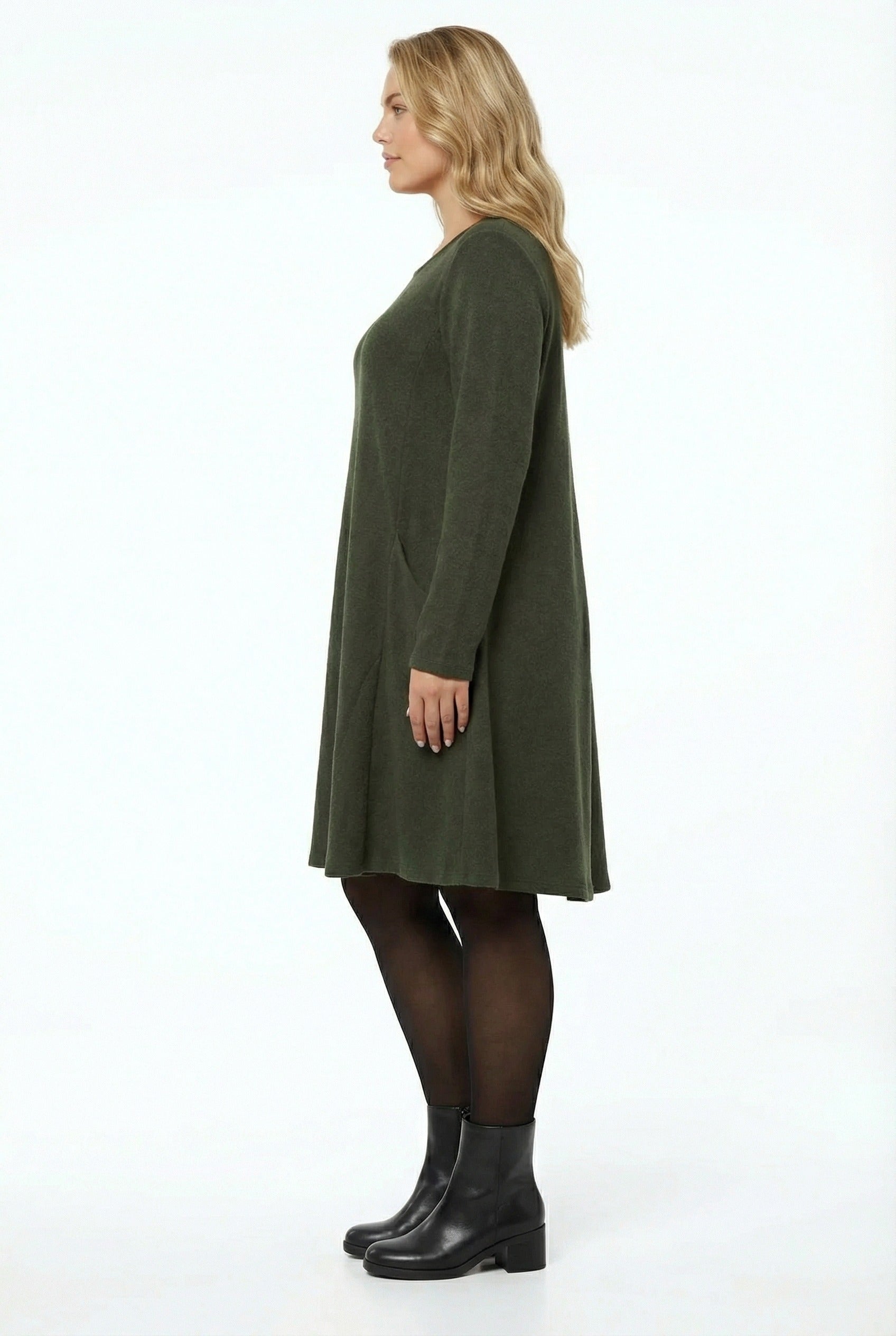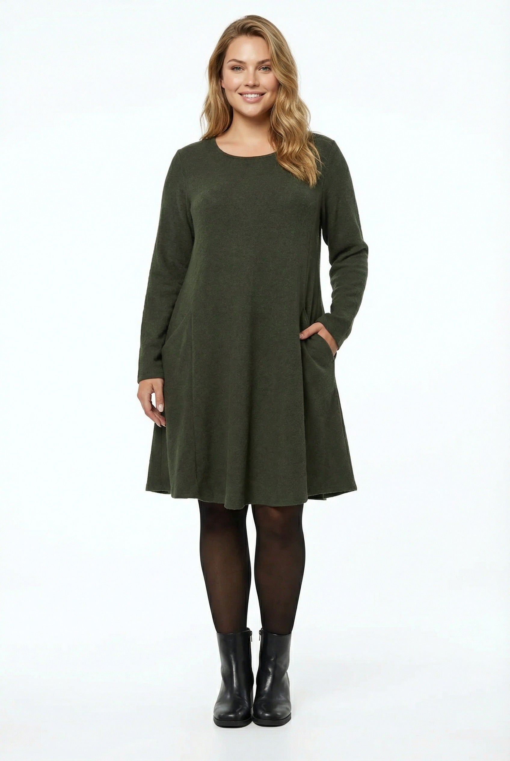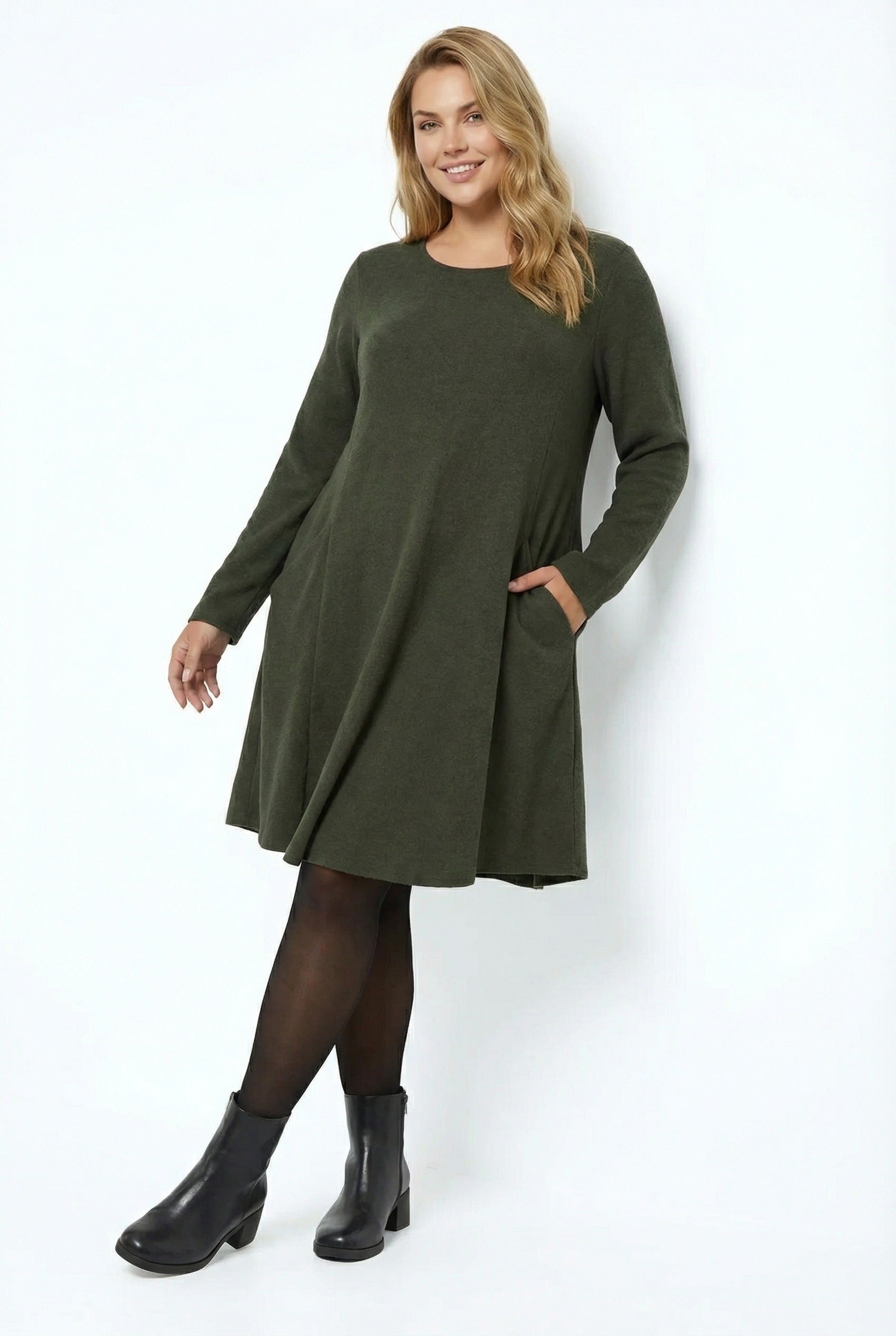 שמלה במידות גדולות שרוול ארוך צווארון עגול רחב (U) עם כיסים מעל הברך 285079