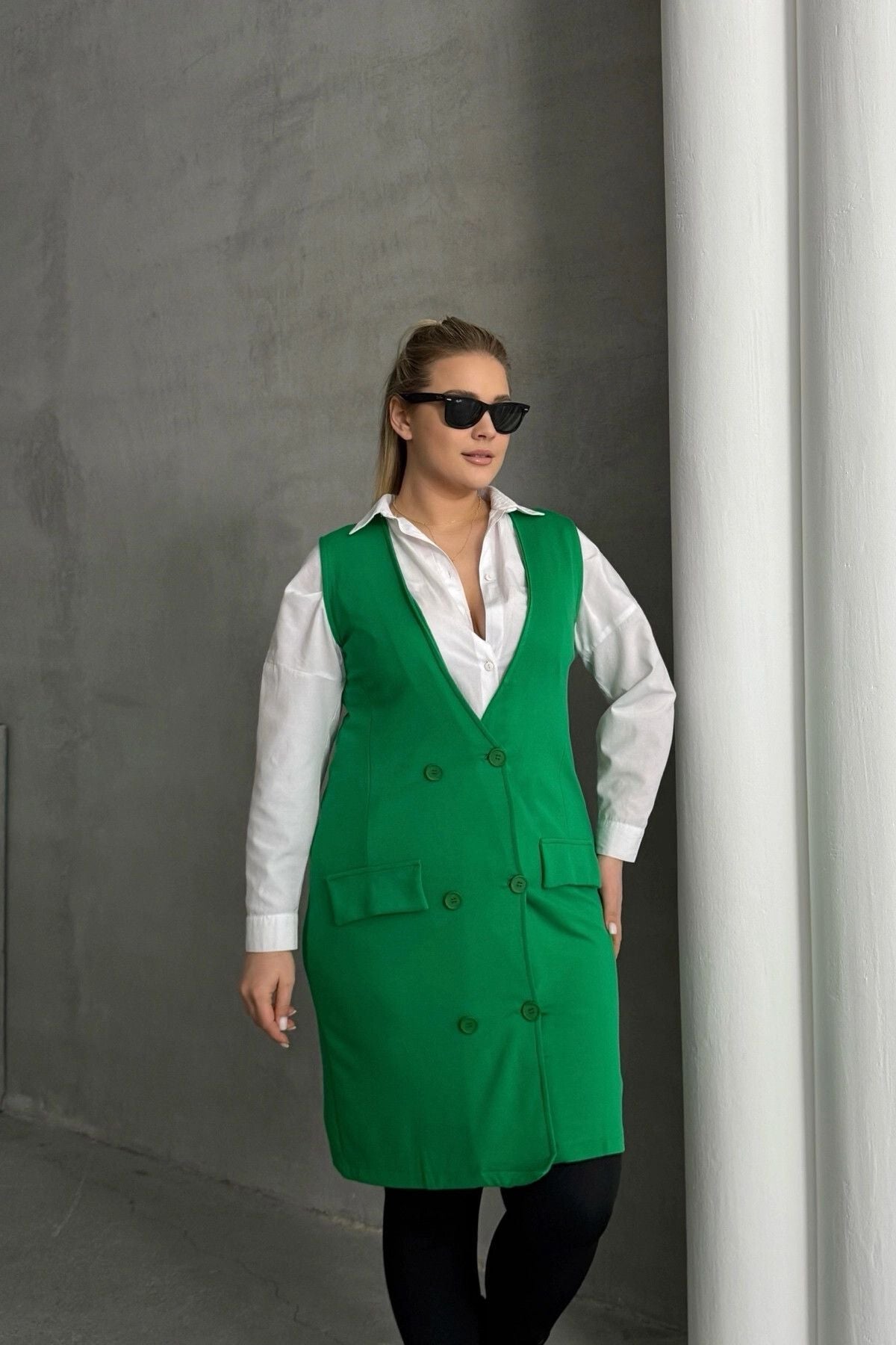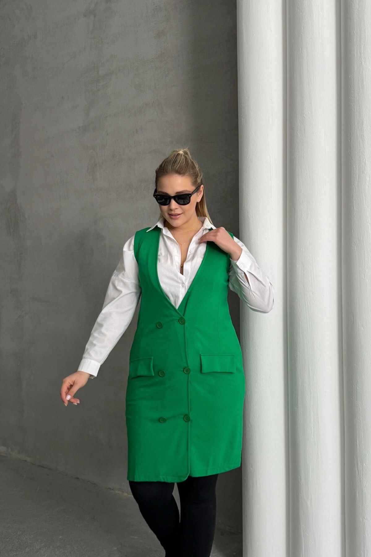 - פרטי הדגם: צווארון V, ללא שרוולים, כפתורים כפולים, מראה כיסים, סגנון וסט