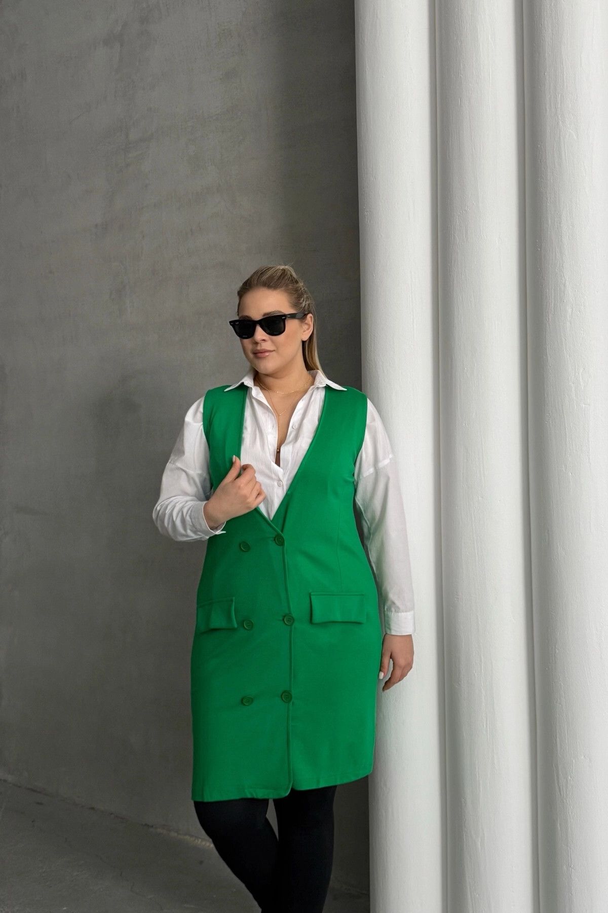 - תיאור מוצר: וסט ירוק אלגנטי זה משלב מראה מקצועי עם עיצוב מודרני. צווארון הV יוצר מראה מעודן, ושורת הכפתורים הכפולה מוסיפה נגיעה קלאסית. אזורי מראה הכיסים מעניקים יתרון גם בסגנון וגם בפרקטיות. בזכות הגזרה ללא שרוולים, ניתן לשלבו עם חולצות מכופתרות, בלוז או סריגים. מתאים למראה יומיומי בעבודה וגם לאירועים מיוחדים. קל לתחזוקה וניתן לכביסה במכונה.
