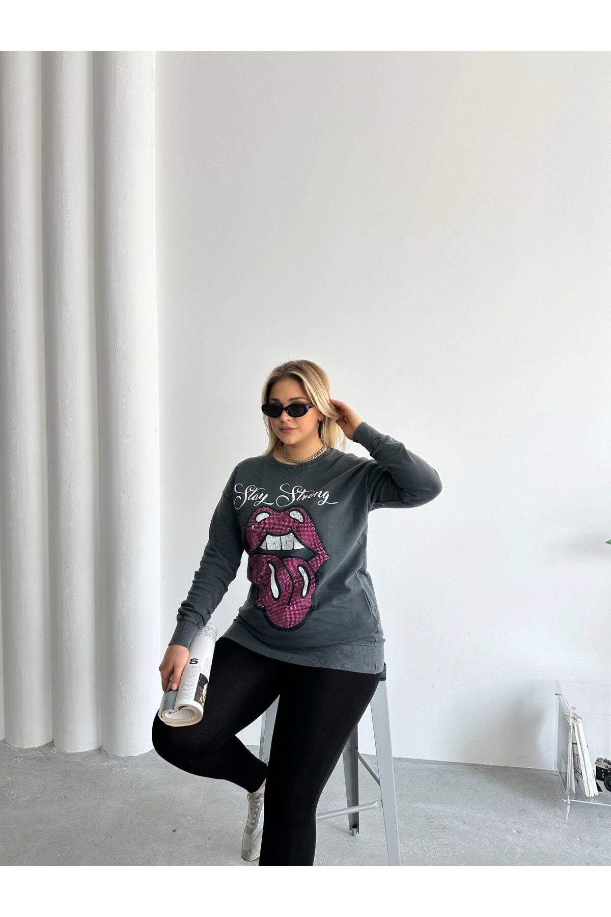 • תיאור מוצר: סווטשירט זה מביא נגיעה רוקרית עם עיטורי האבנים וסלוגן 'Stay Strong'. דוגמת הלשון מושכת את העין, ומשלבת בין נוחות לבין אמירה אופנתית. מתאים לשילוב עם טייץ או ג'ינס למראה יומיומי נינוח.