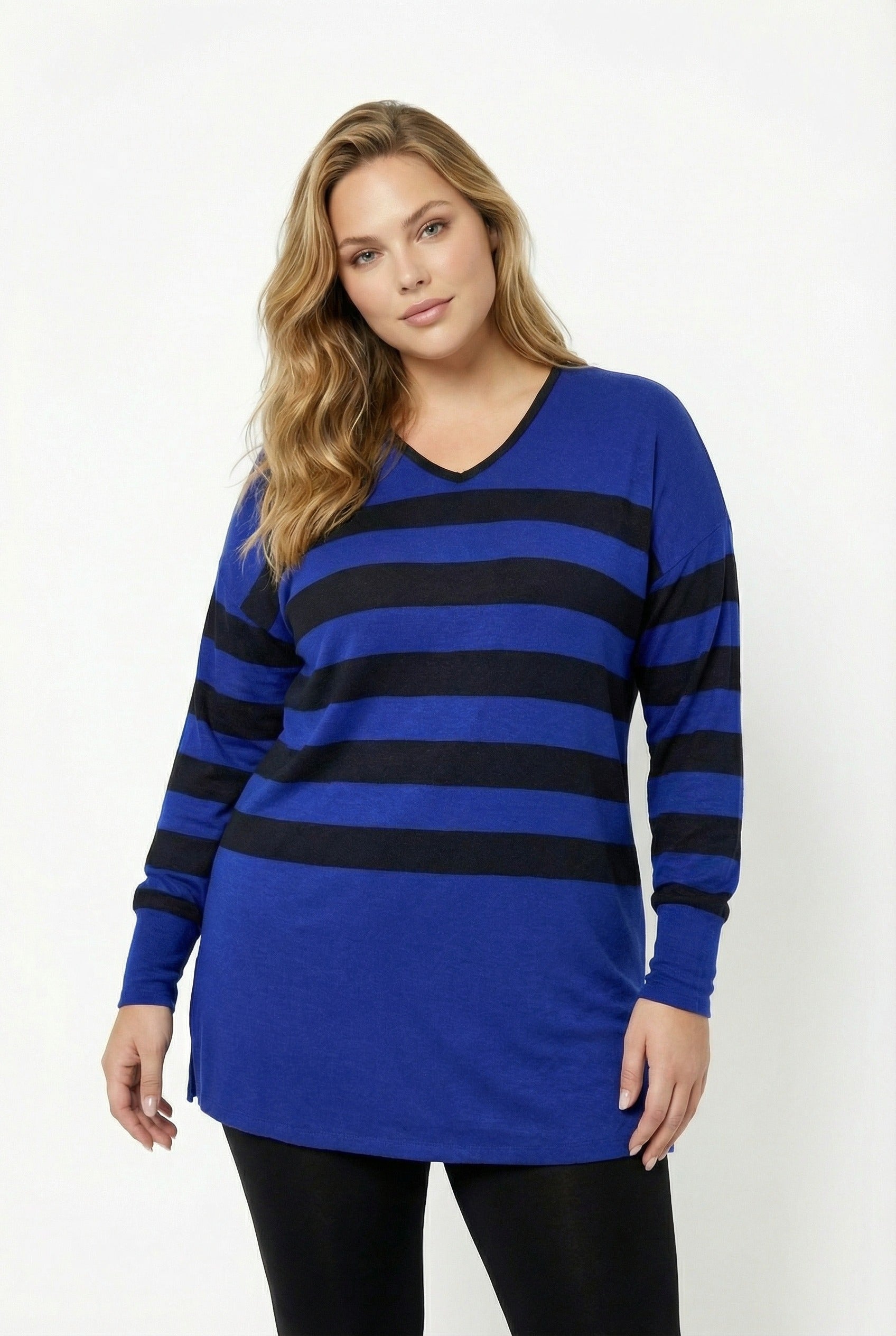 חולצה במידות גדולות צווארון V דוגמת פסים שסעים בצדדים שרוול ארוך 301567