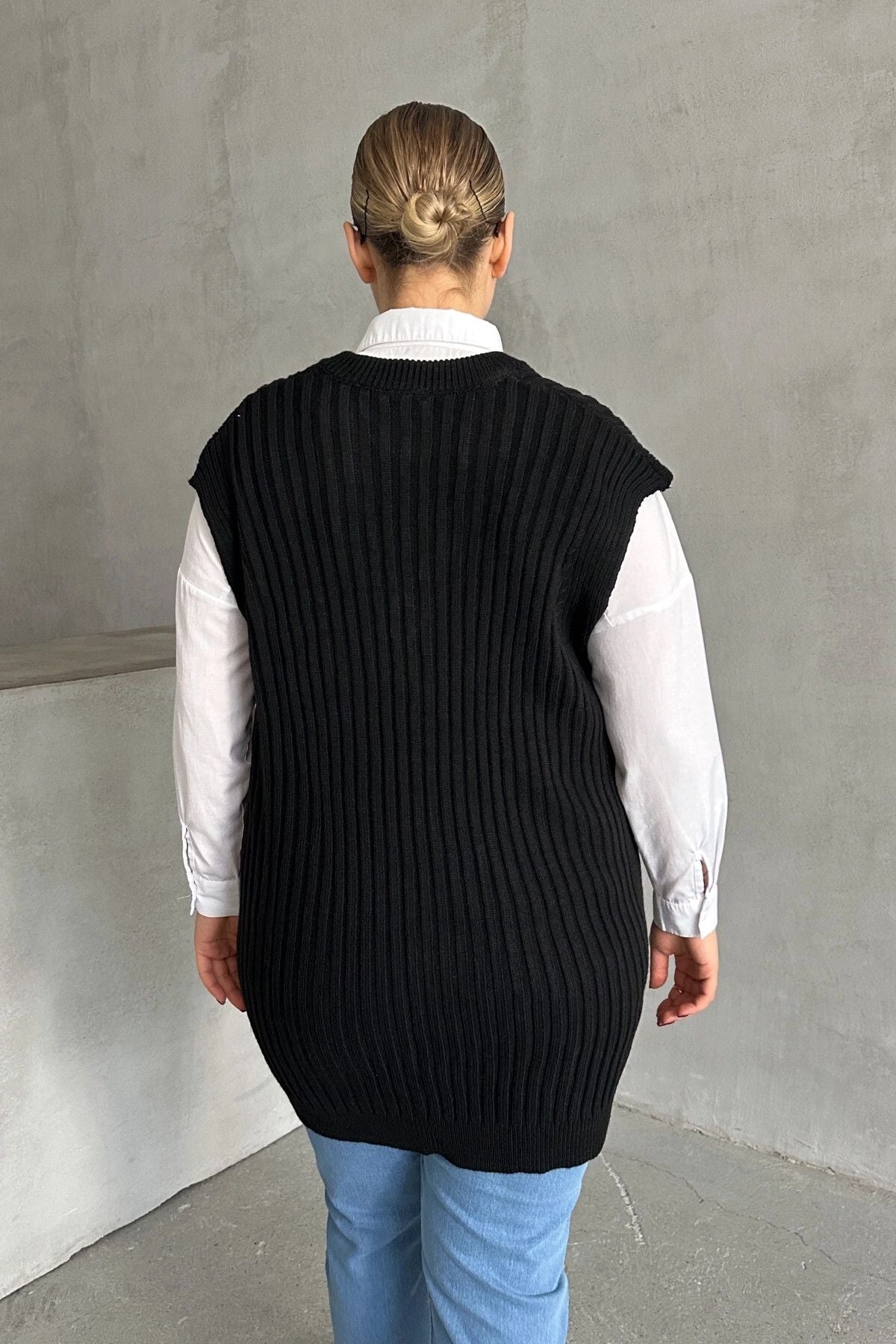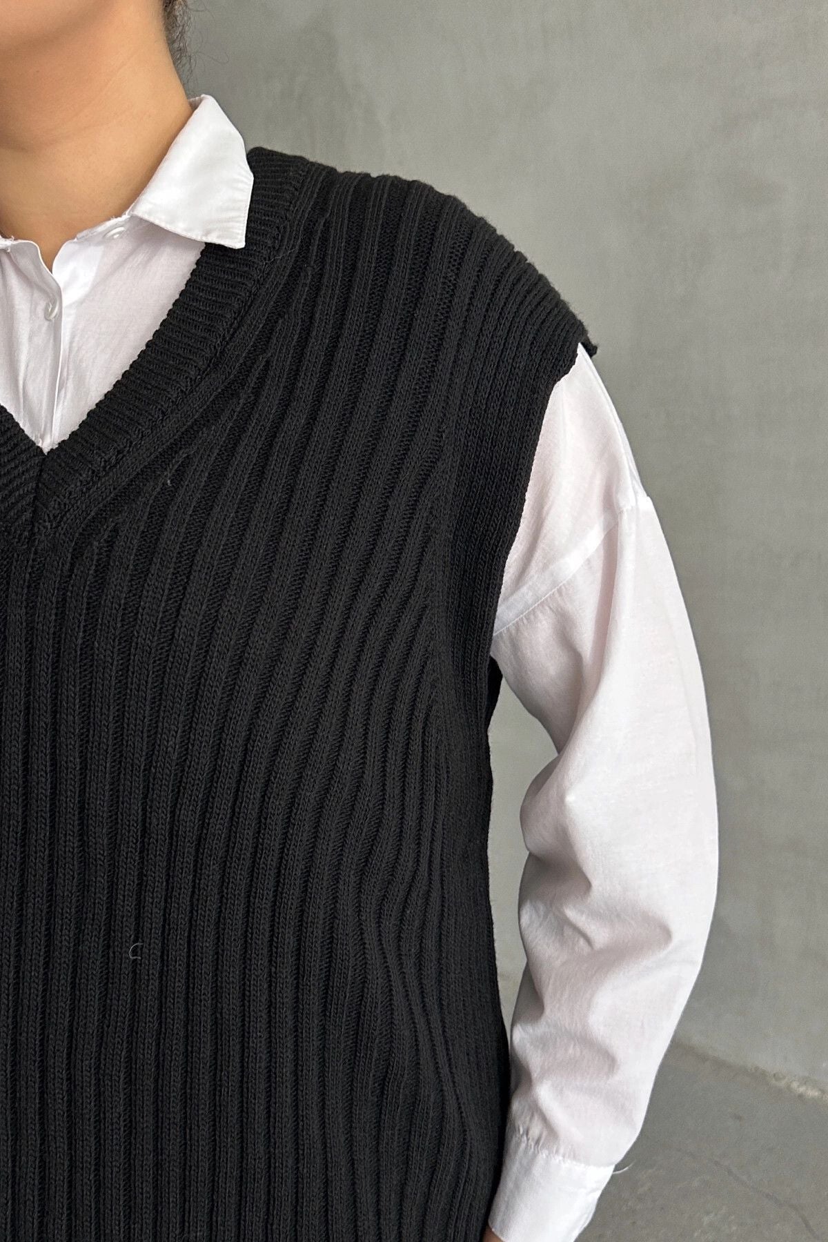 - פרטי הדגם: צווארון V, שרוול קצר, סוודר טריקו