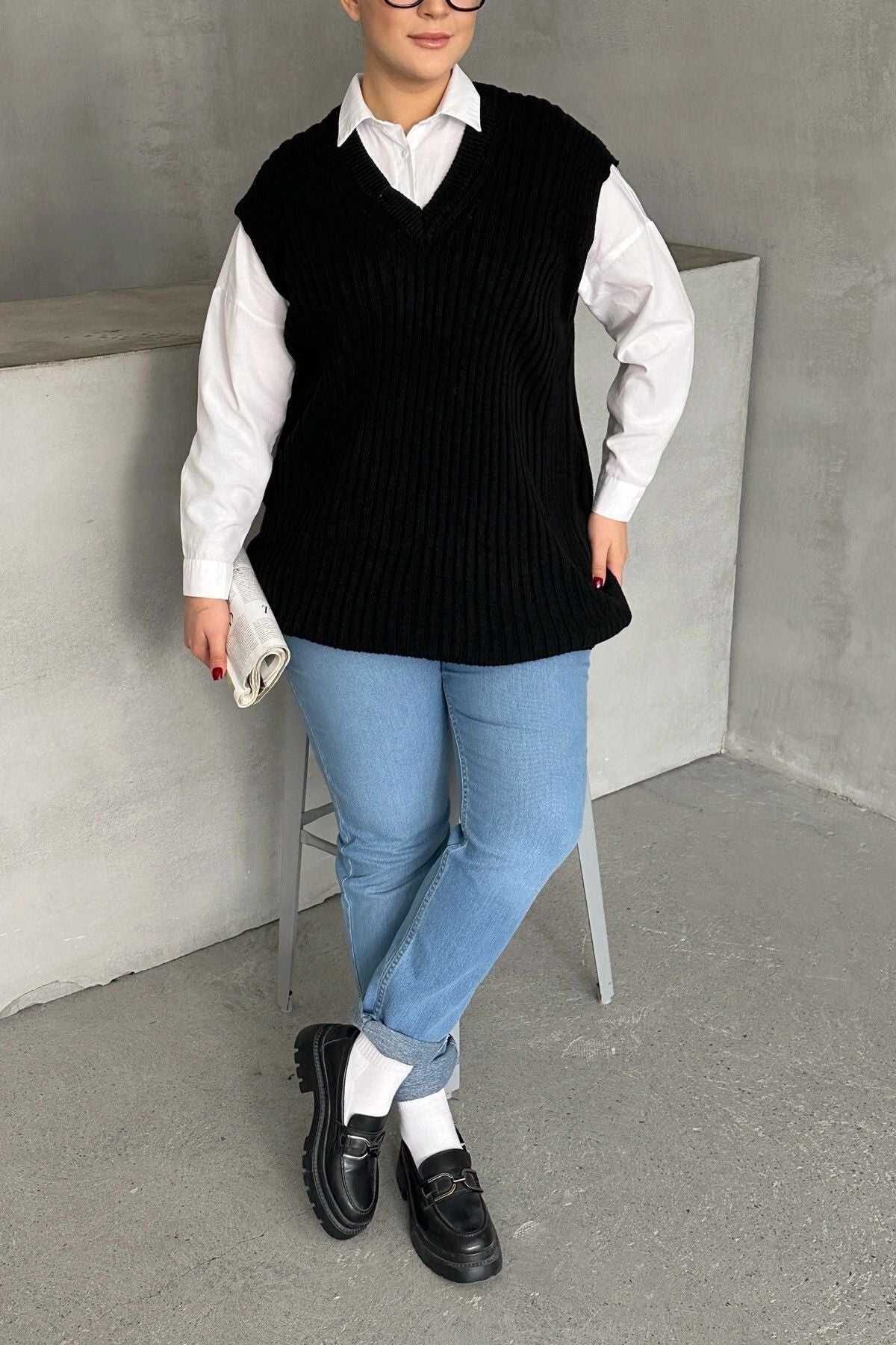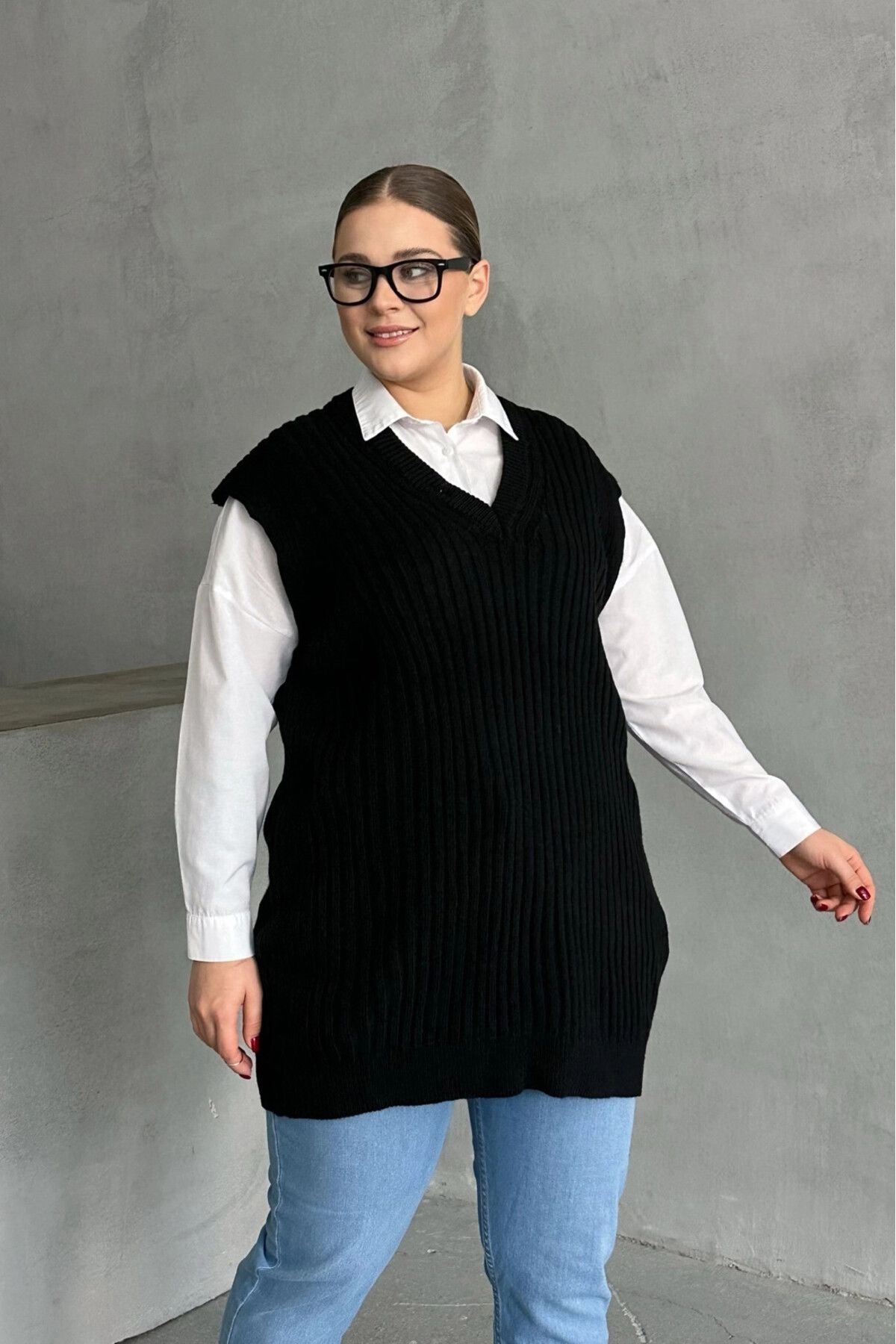 סוודר במידות גדולות צווארון V שרוול קצר טריקו 302134