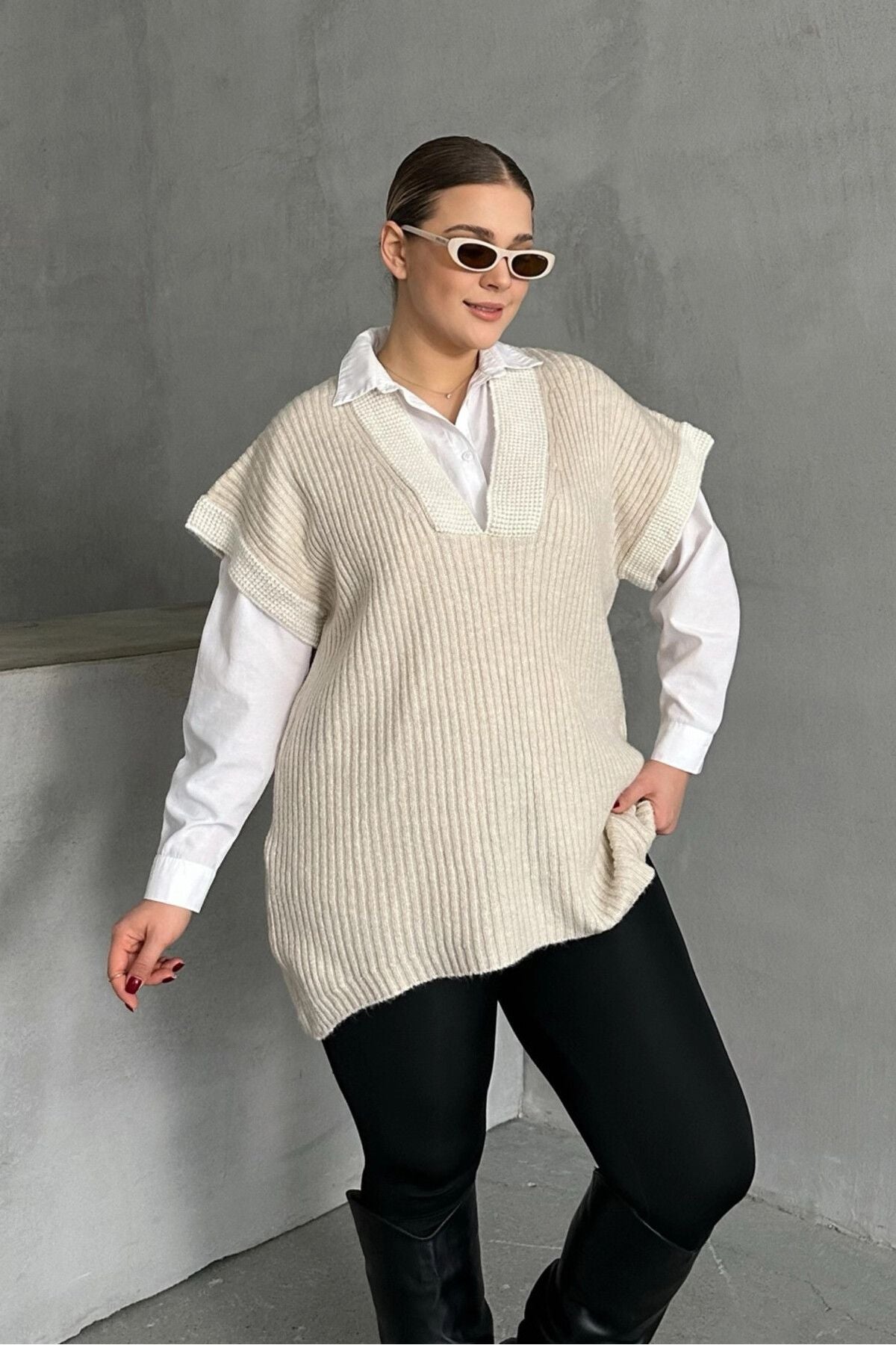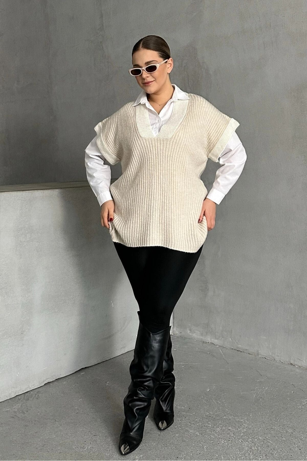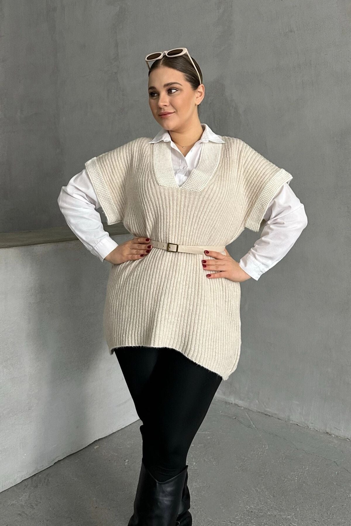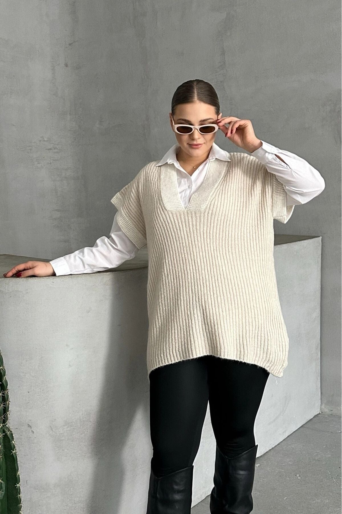 סוודר במידות גדולות צווארון V שרוול קצר טריקו 302137