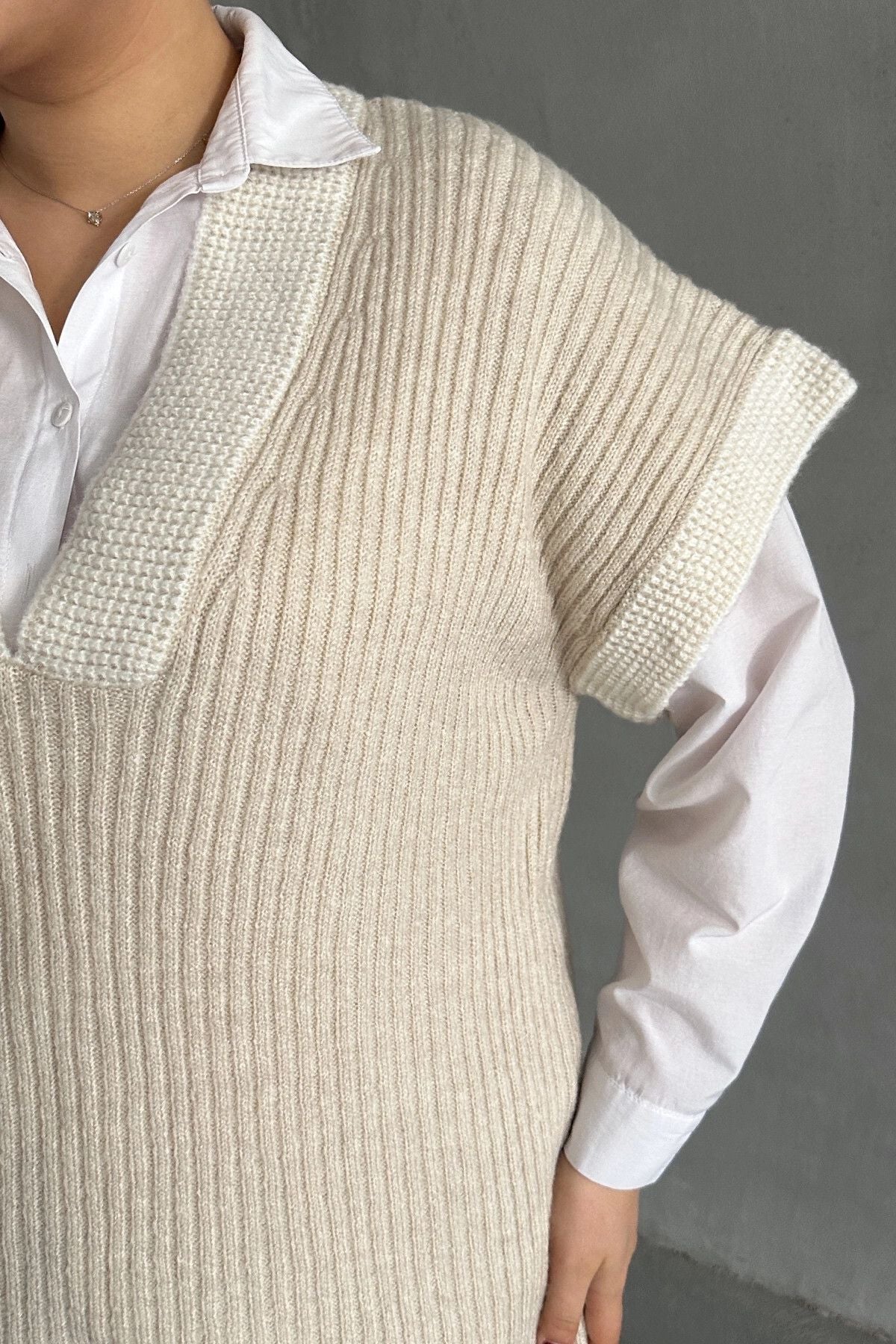 - פרטי הדגם: צווארון V, שרוול קצר, סוודר טריקו עם פרטי עבודה בקצוות הצווארון והשרוולים
