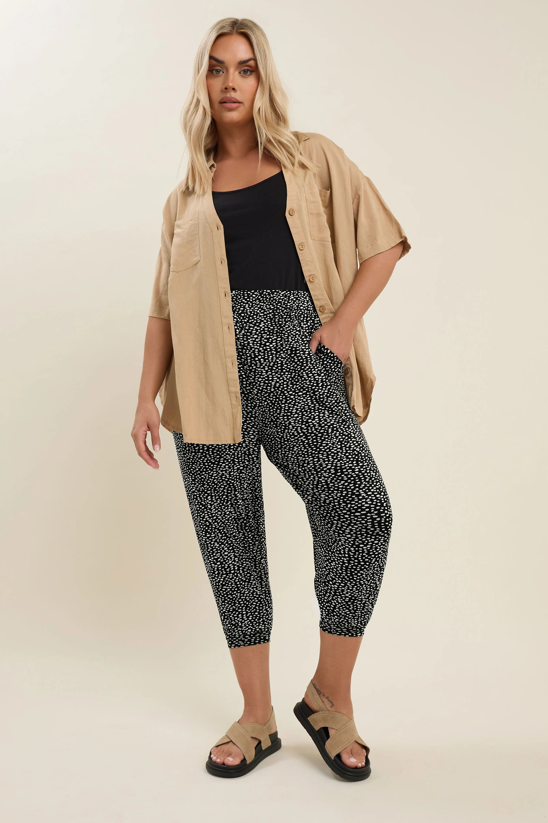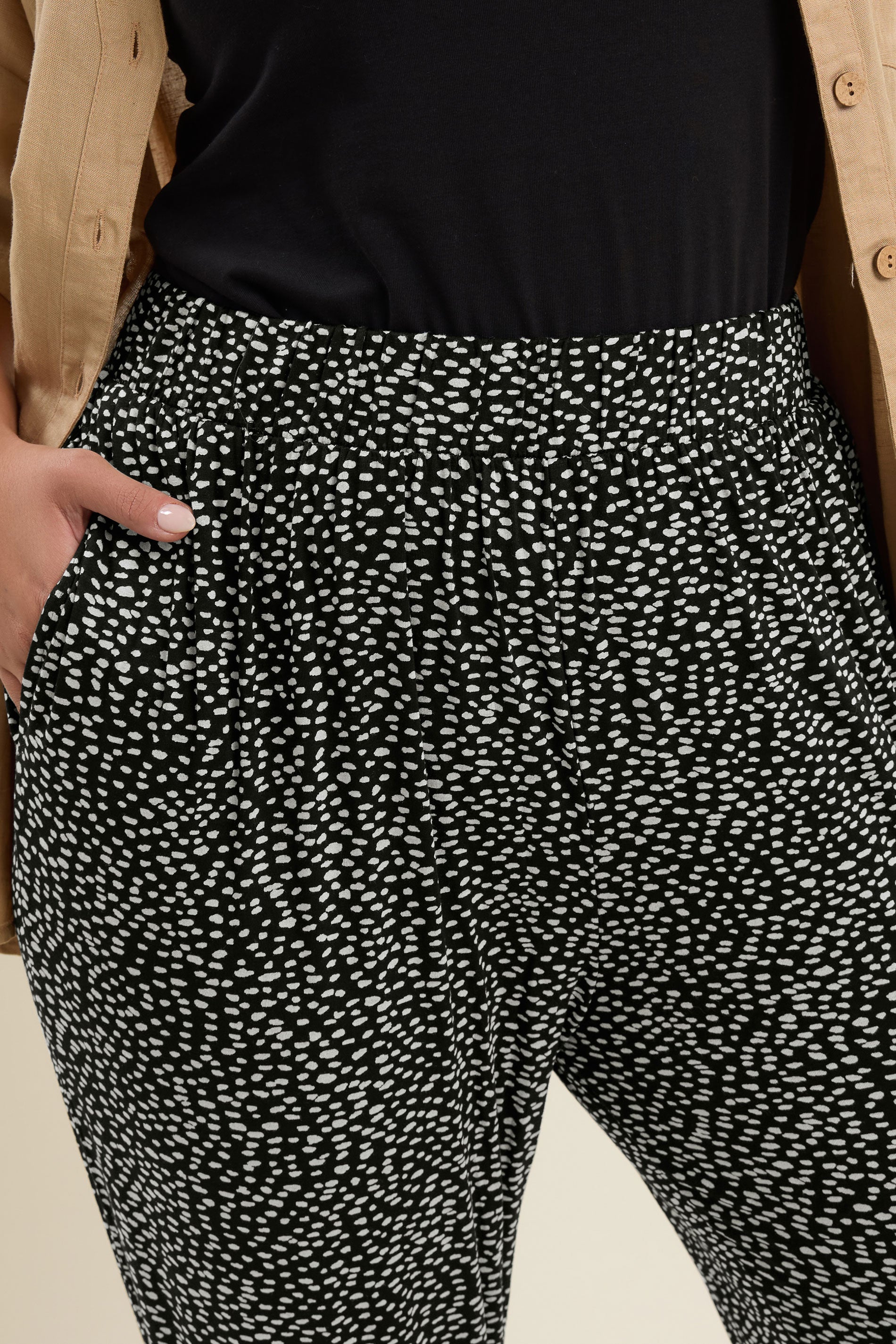 • פרטי הדגם: דוגמת נקודות, גומי במותן, אורך קפרי, שני כיסים בצדדים