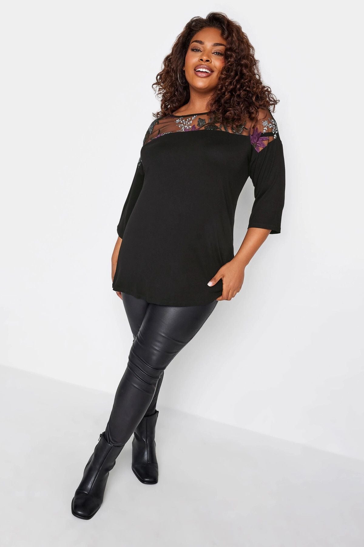 חולצה במידות גדולות עם צווארון עגול שרוול שלושה רבעים ודוגמת טול 302657