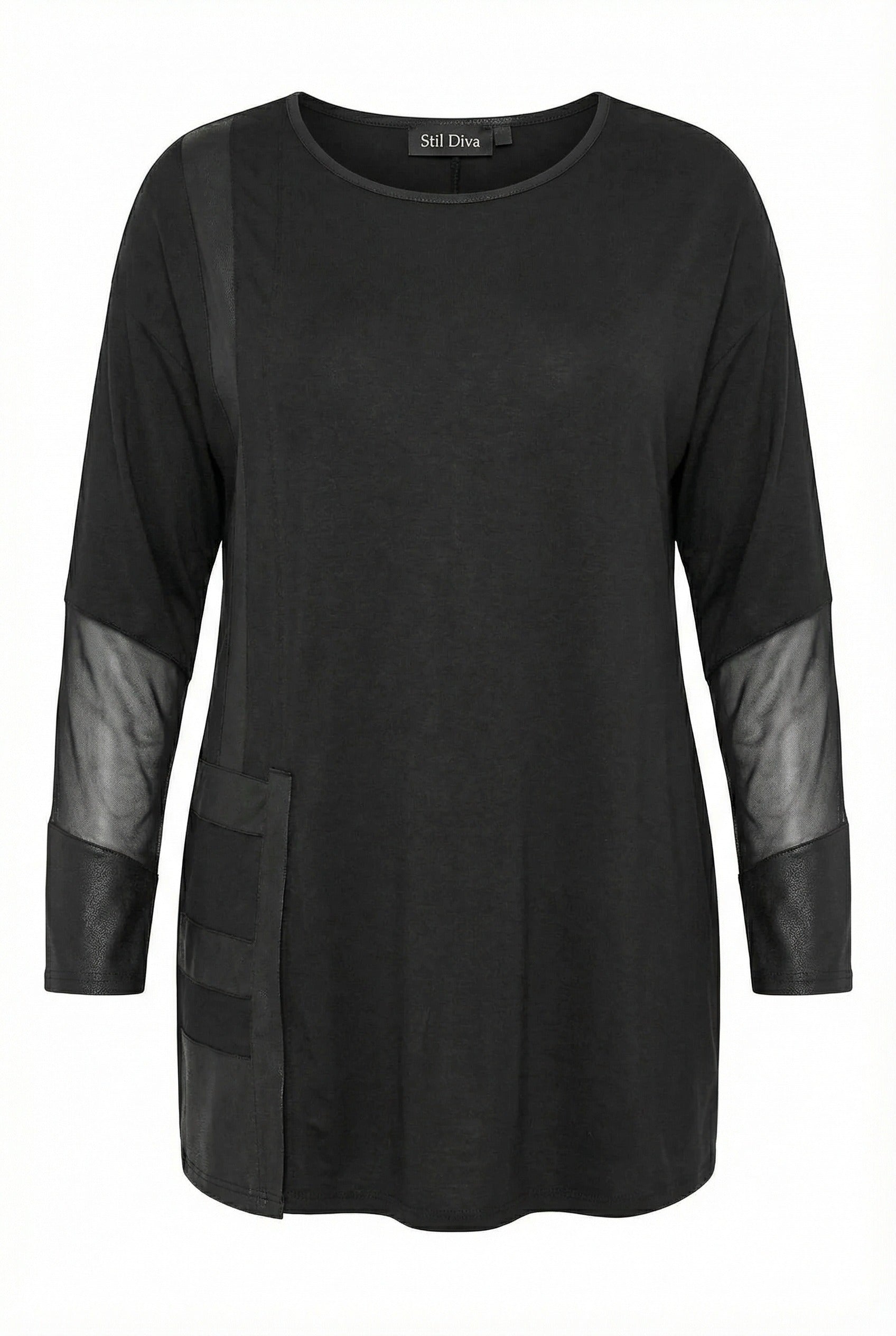 - פרטי הדגם: צווארון עגול, שרוול ארוך, פרטי שרוול רשת, פרטי דמוי עור, פרטי סריגה