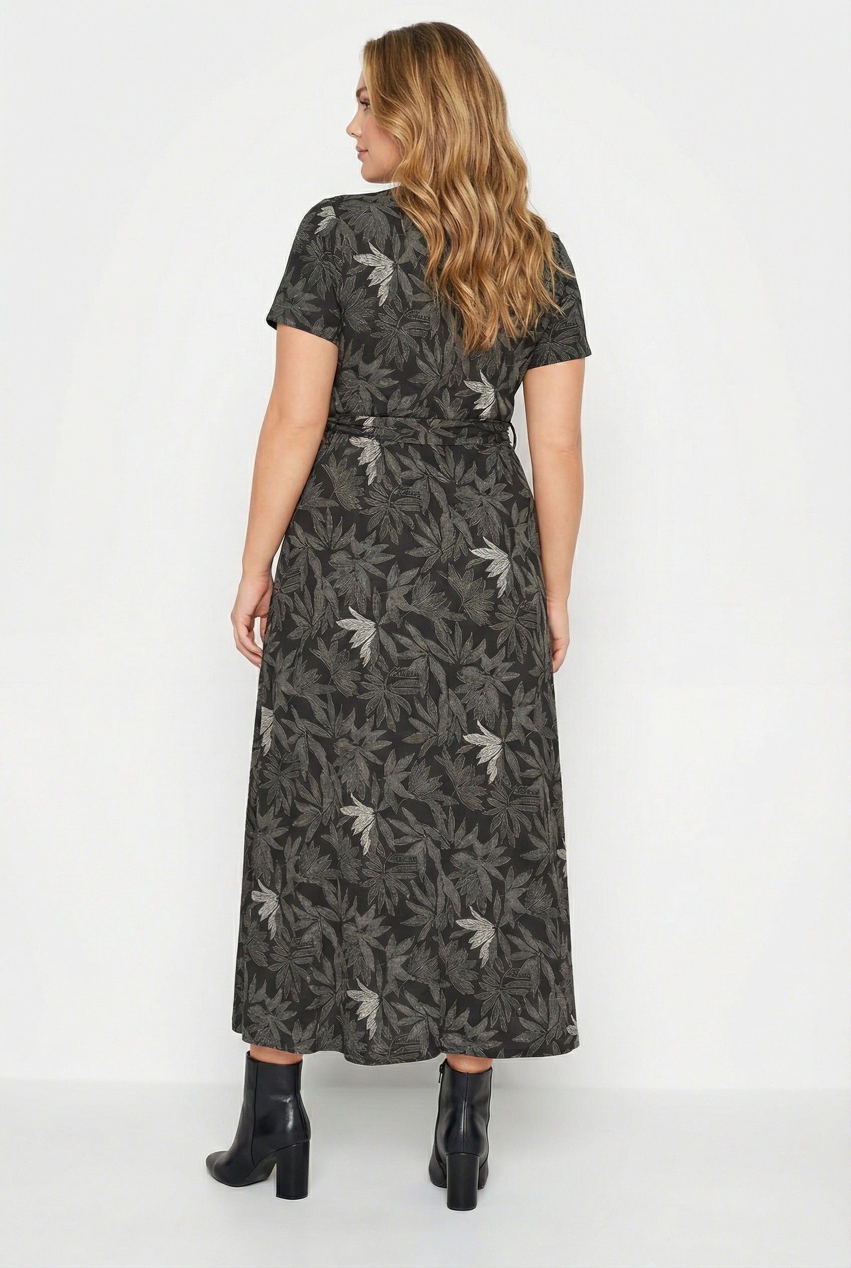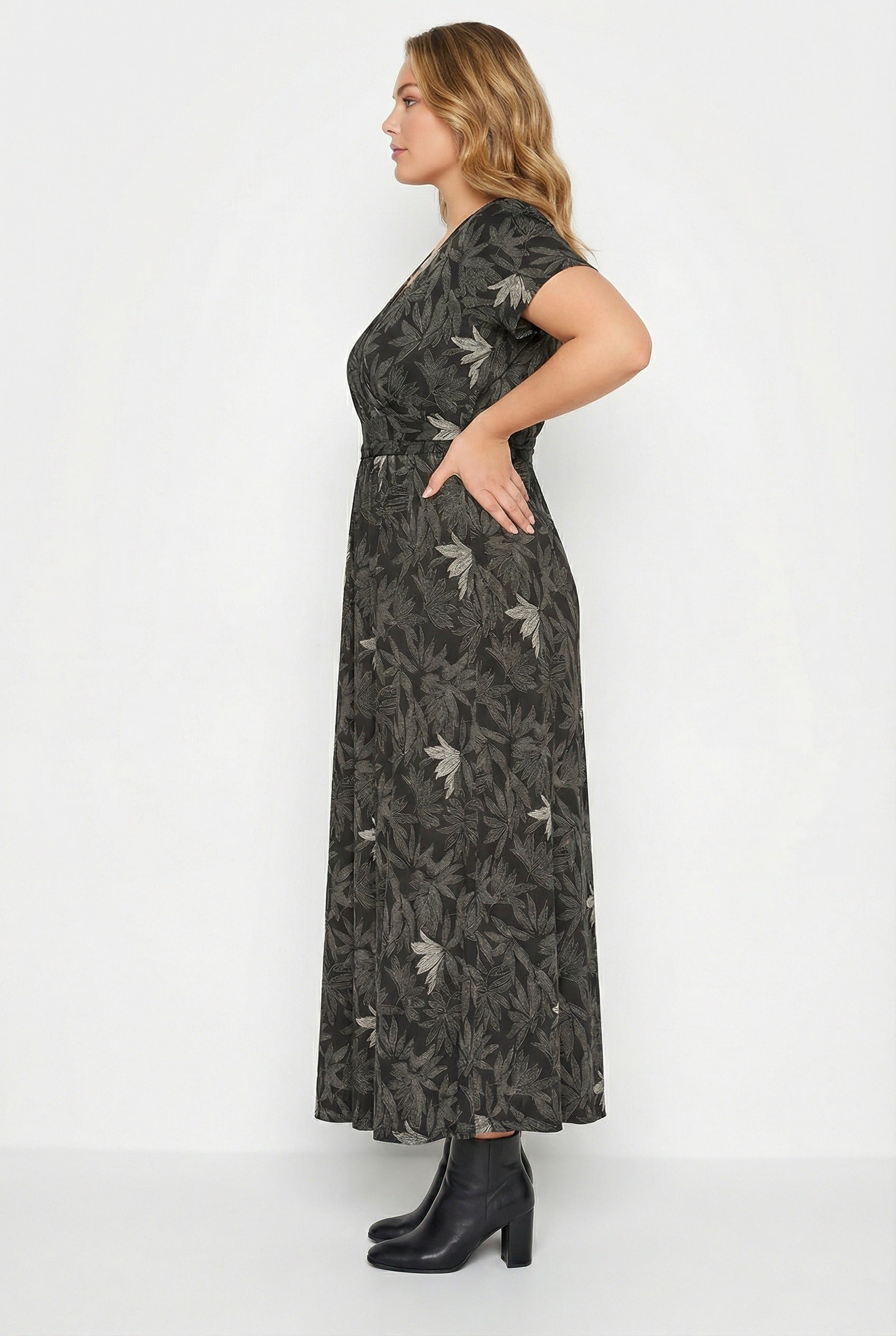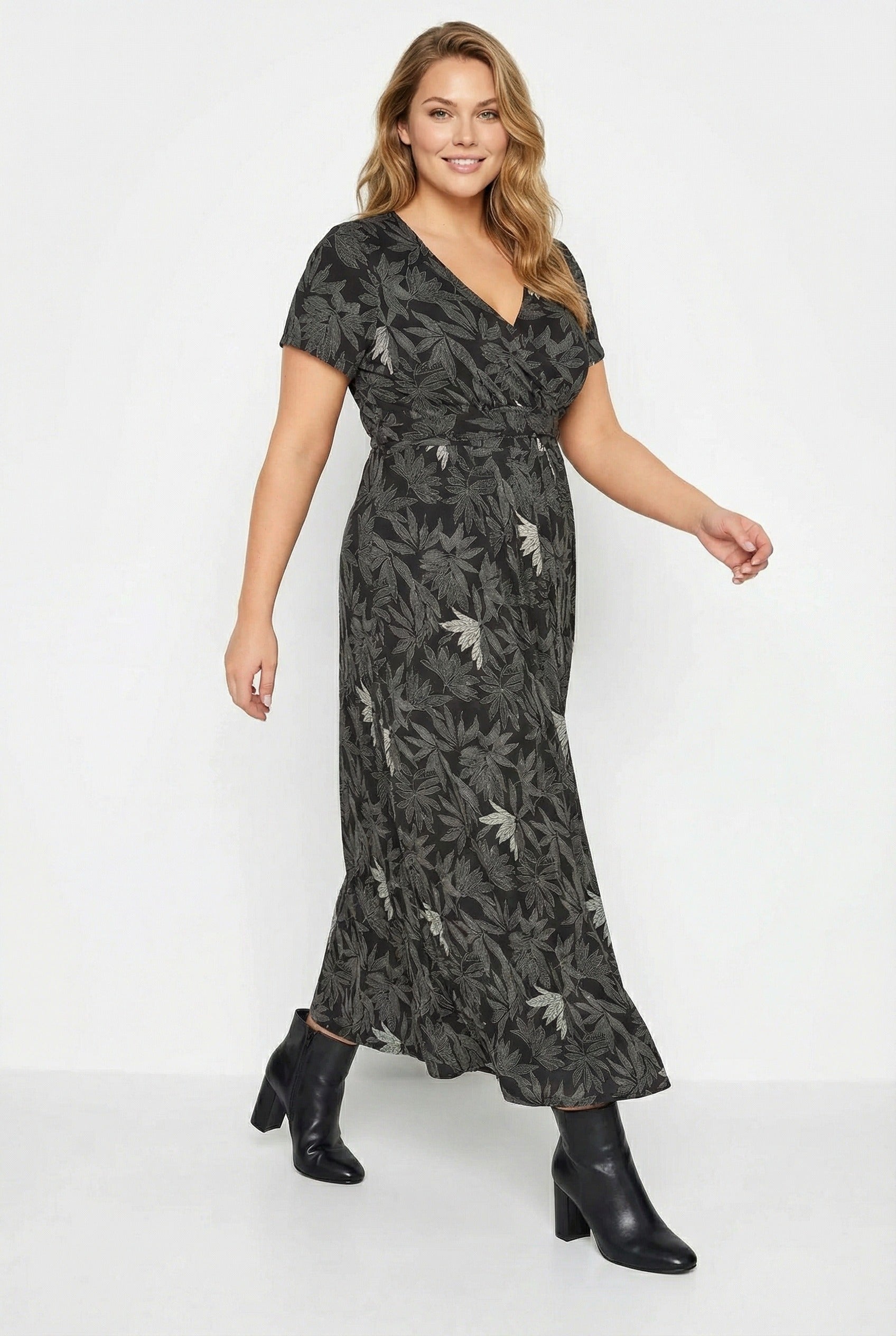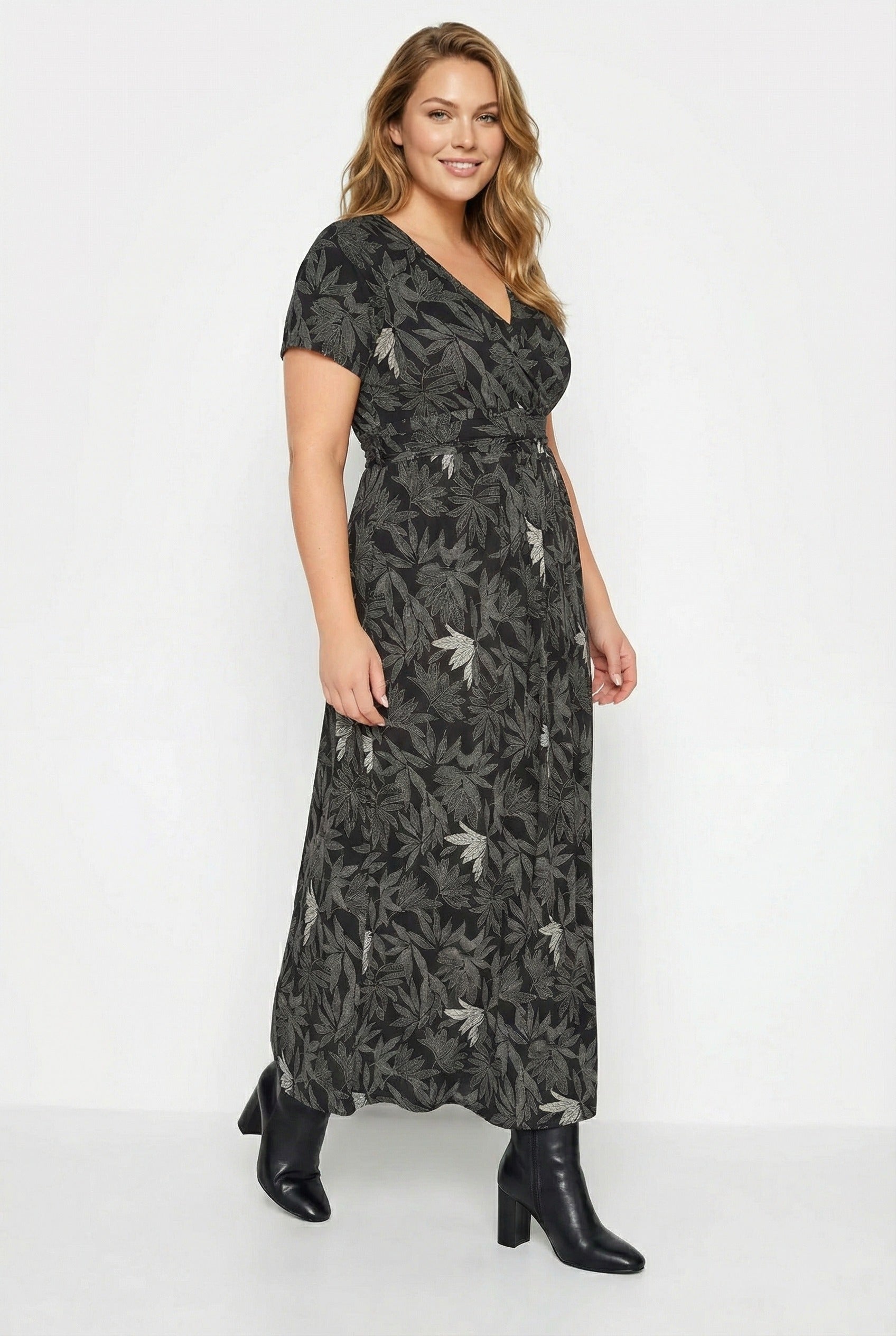 - פרטי הדגם: דוגמת פרחים, חזית מעטפת, מקסי, שרוול קצר