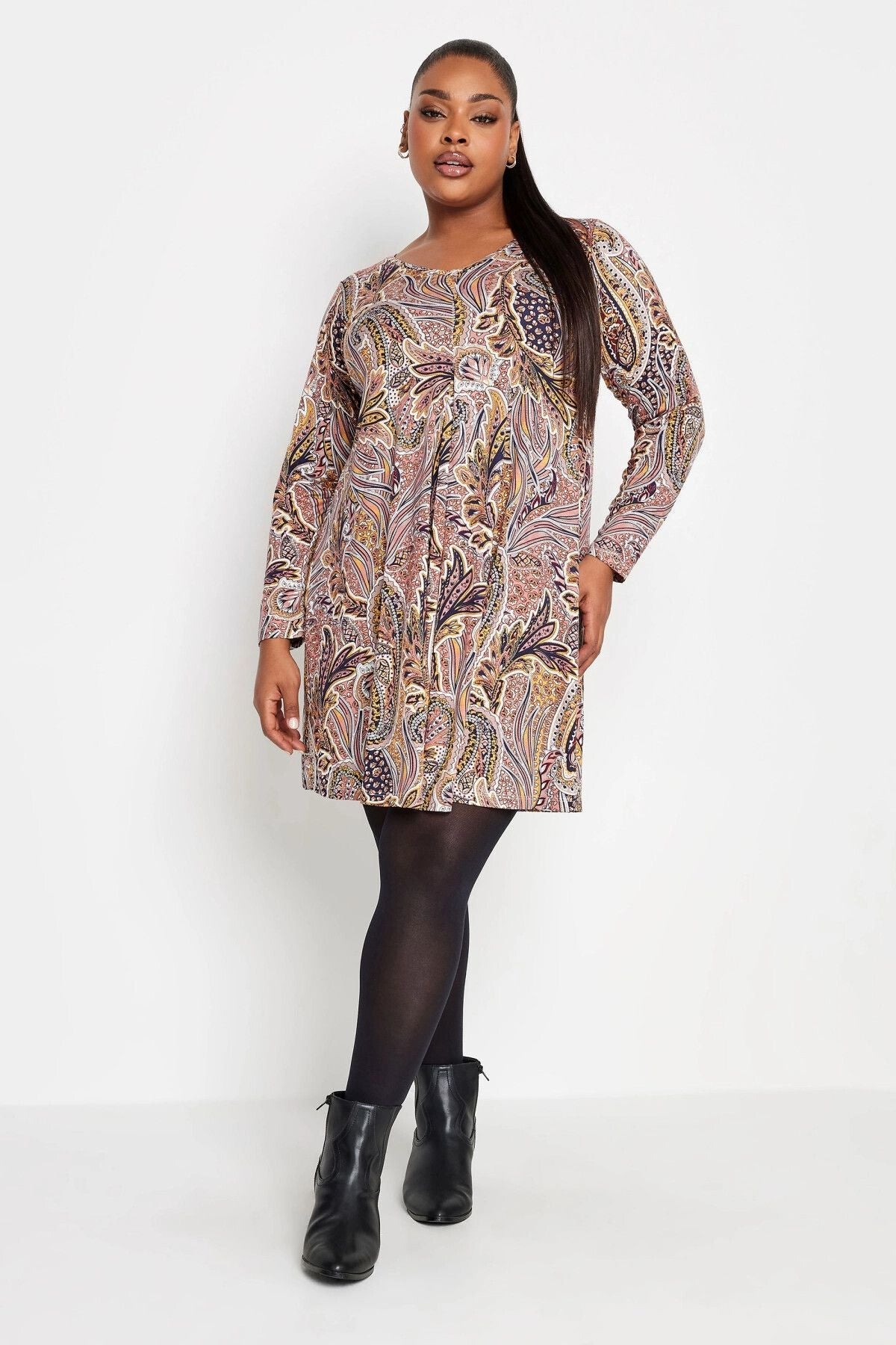 שמלה קצרה במידות גדולות צווארון V שרוול ארוך דוגמת פרחים 302735