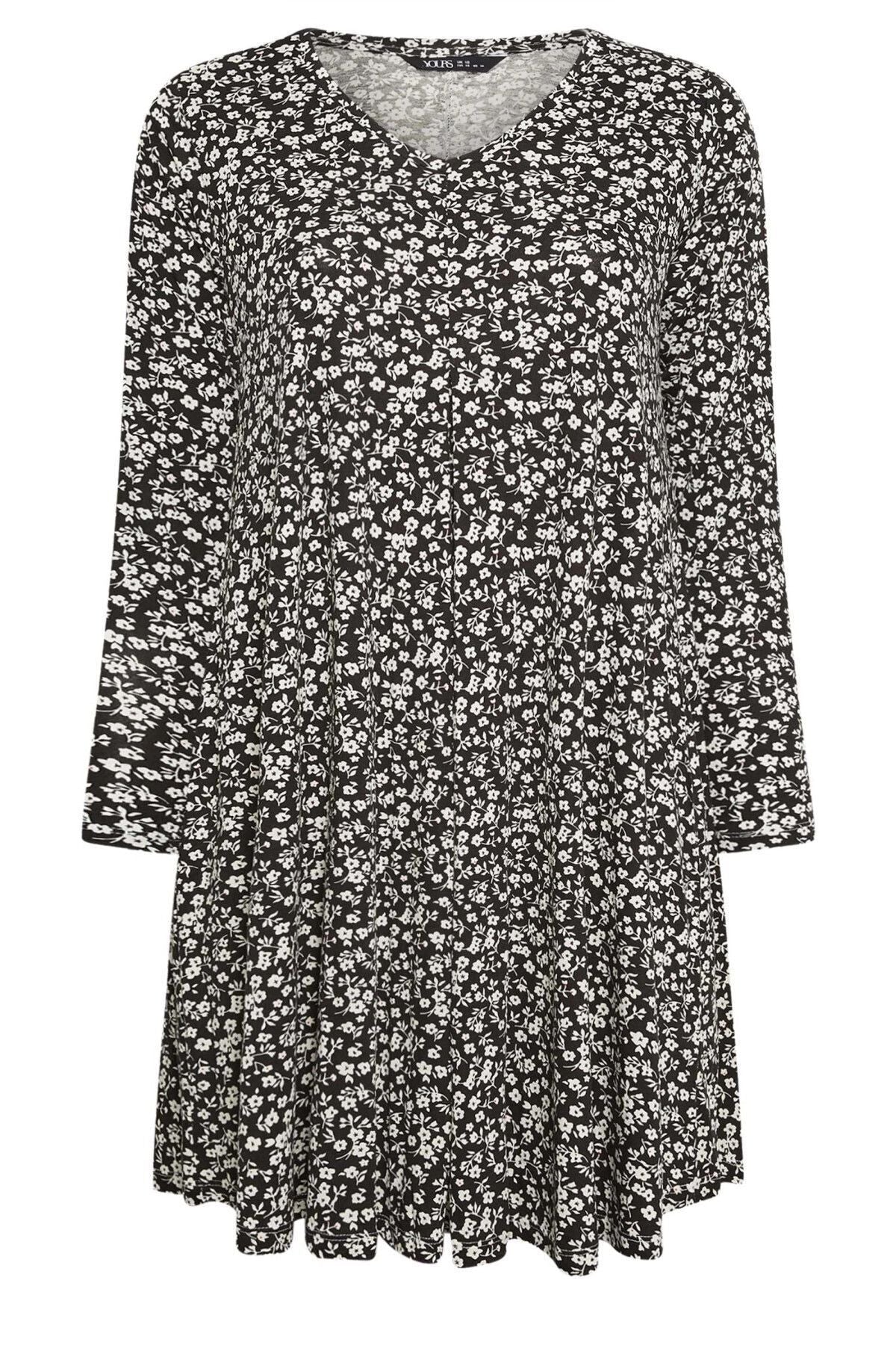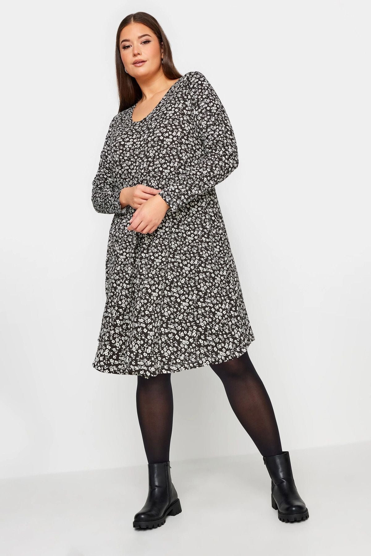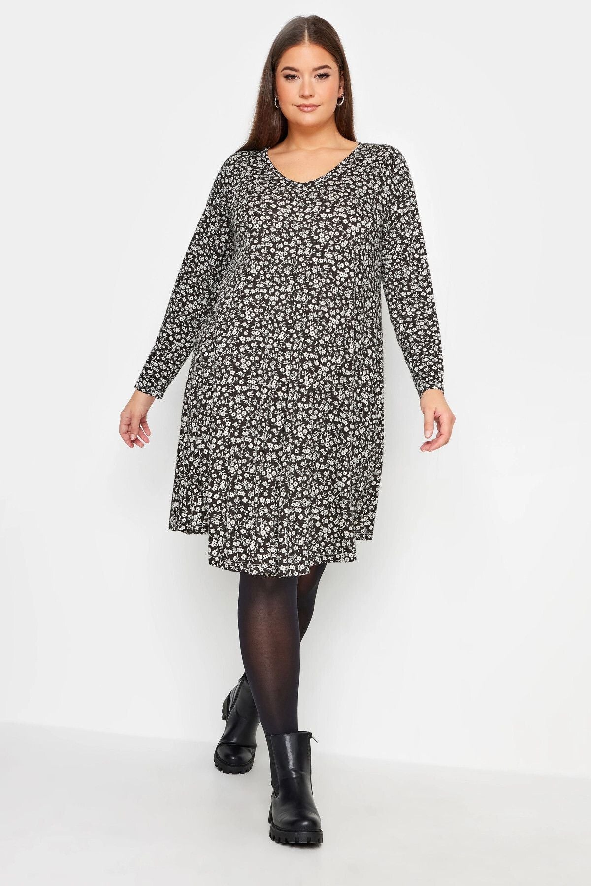 שמלה קצרה במידות גדולות שרוול ארוך צווארון V דוגמת פרחים 302740
