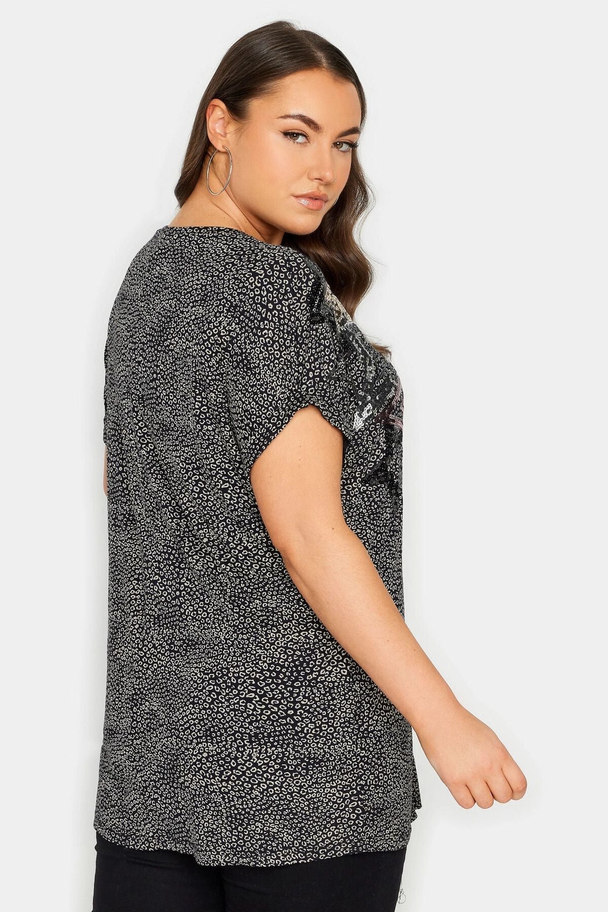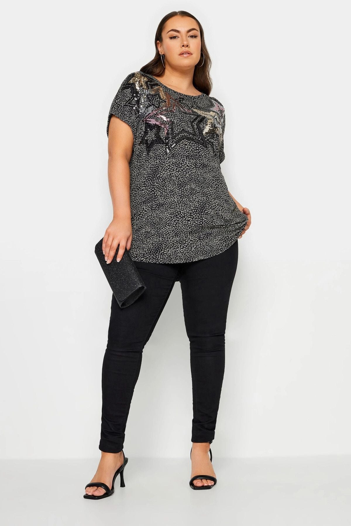 טישירט במידות גדולות צווארון עגול קצר מעוטרת באבנים דוגמת כוכב 302856