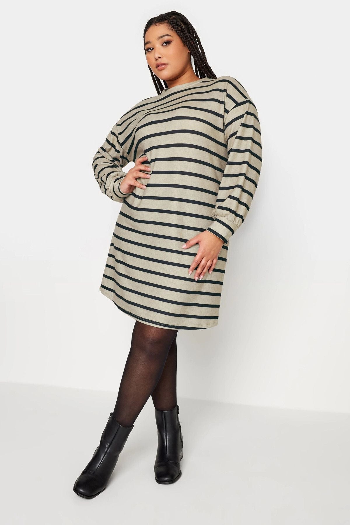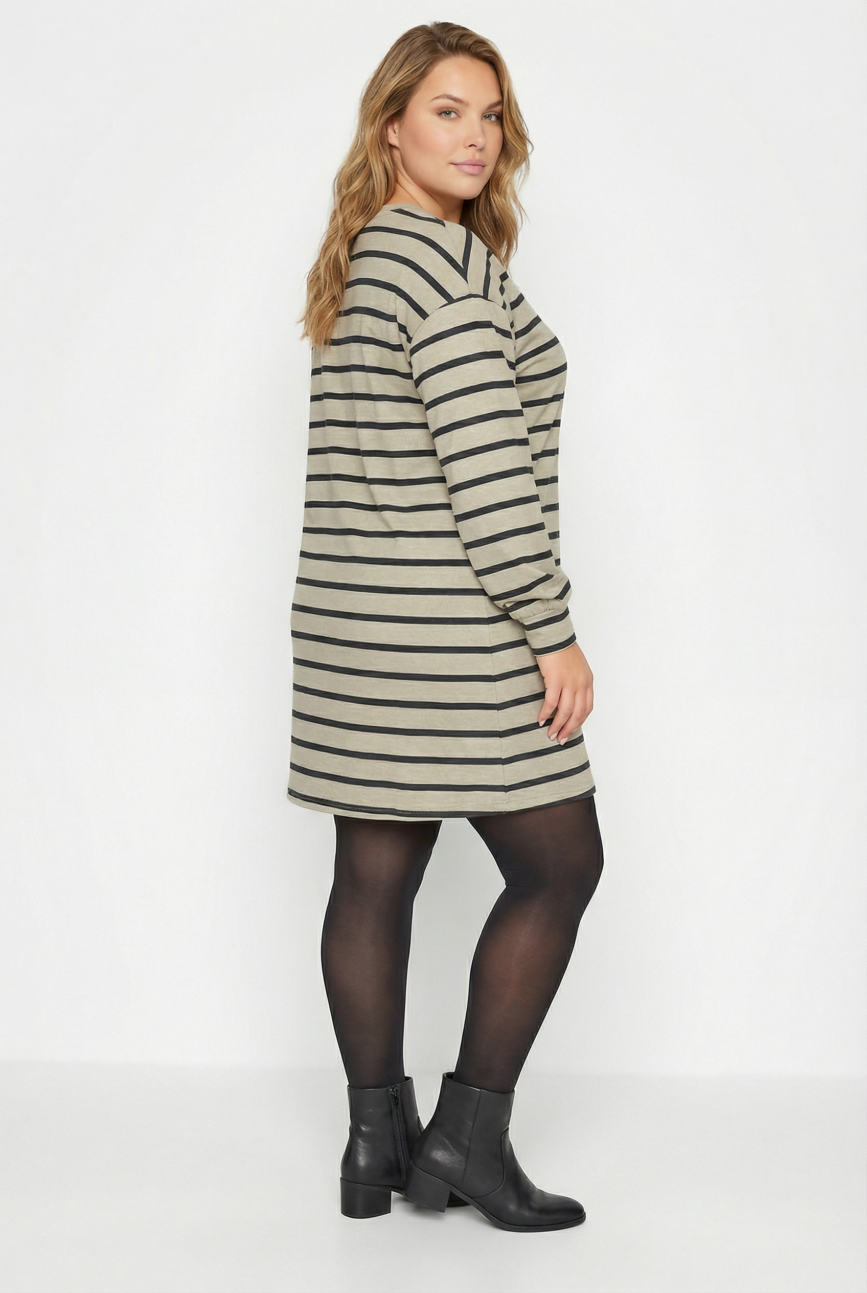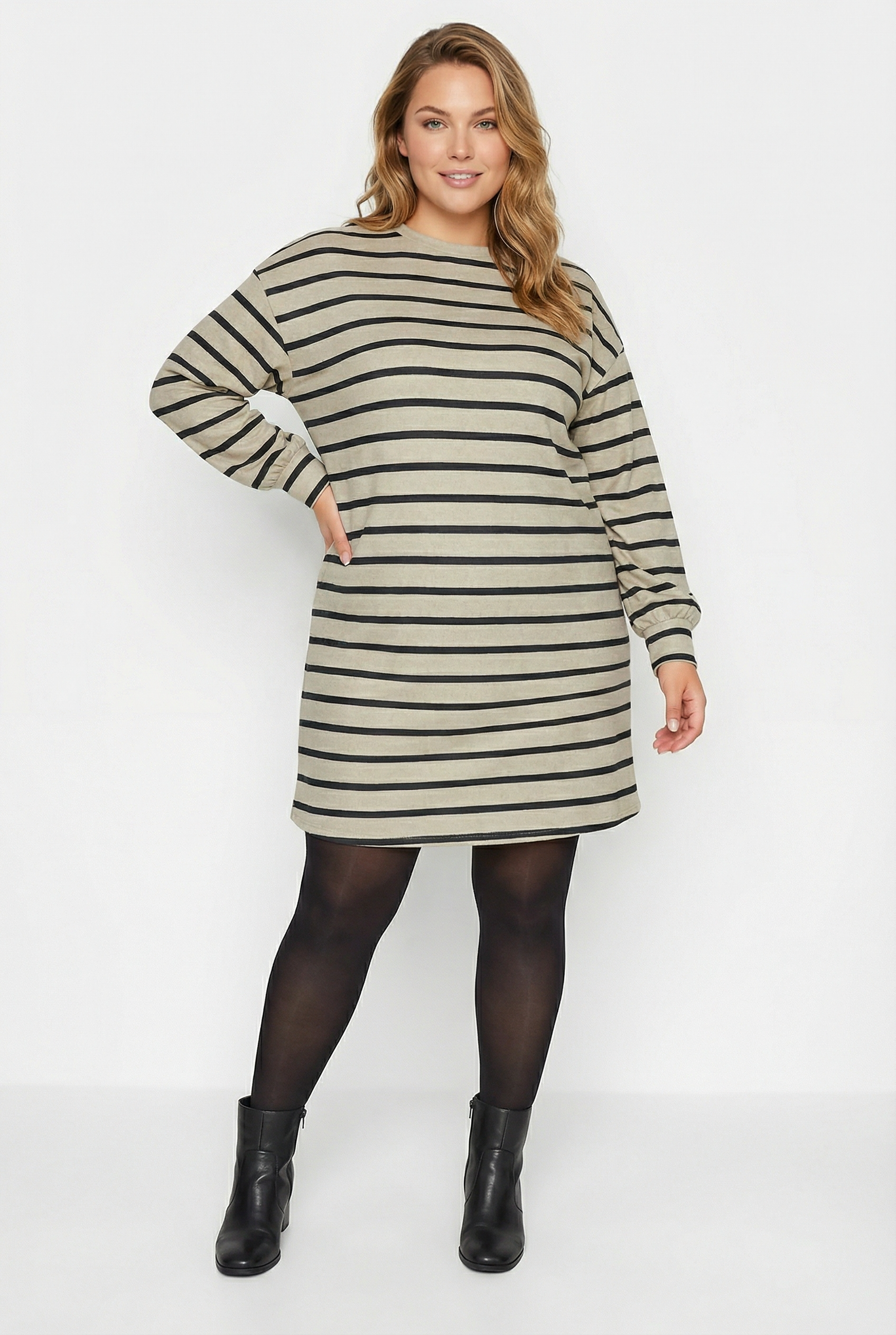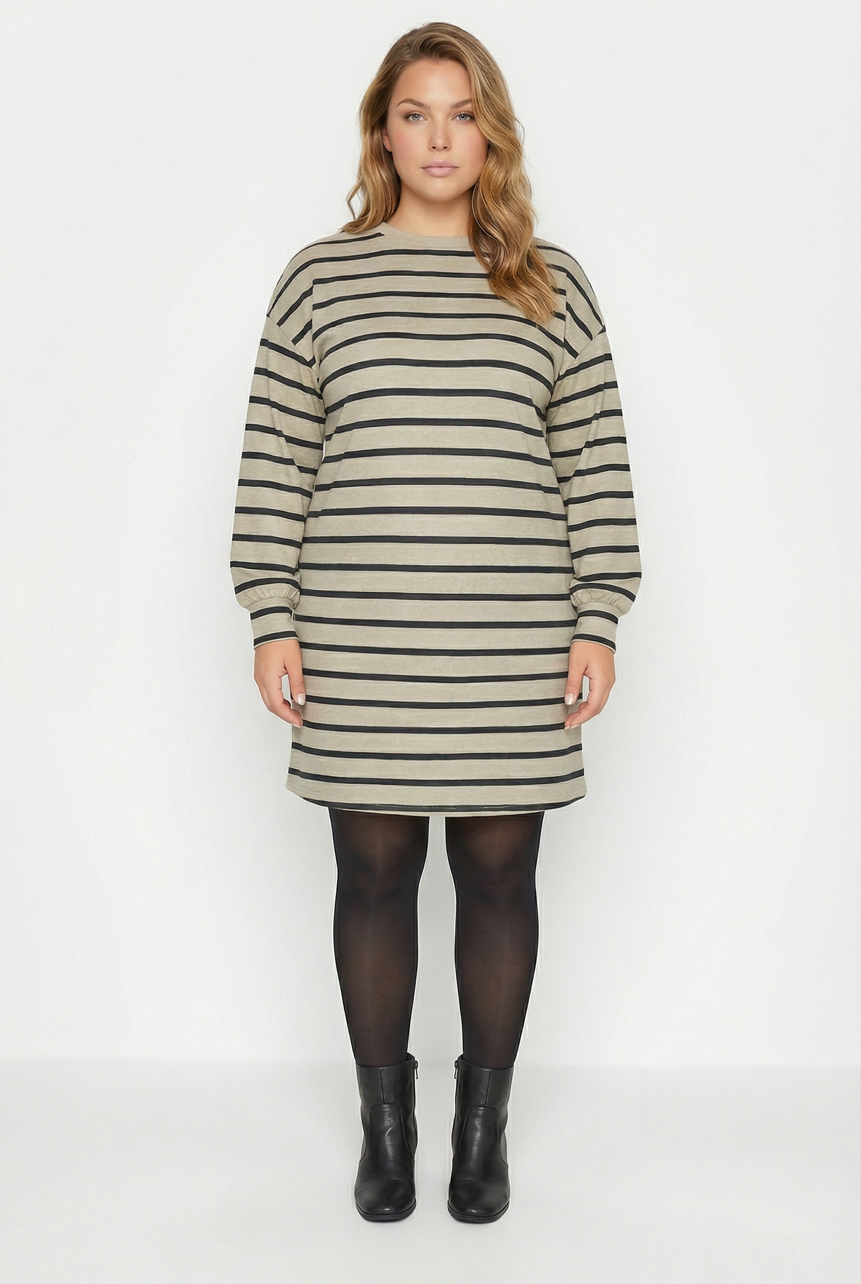שמלה במידות גדולות צווארון עגול שרוול ארוך דוגמת פסים מיני 302882