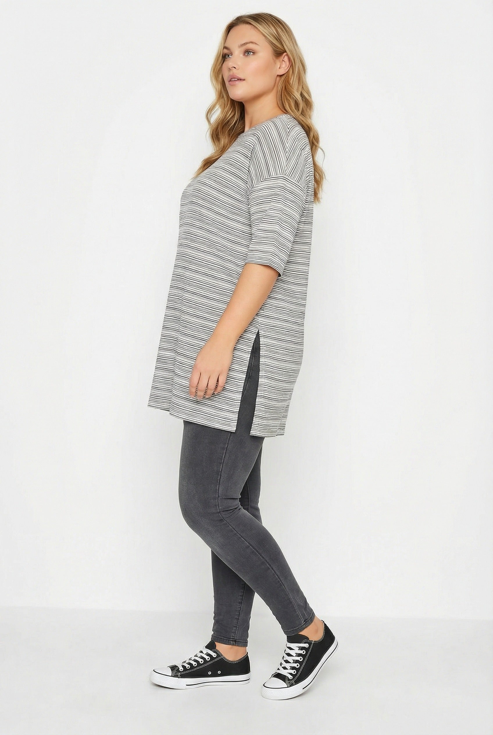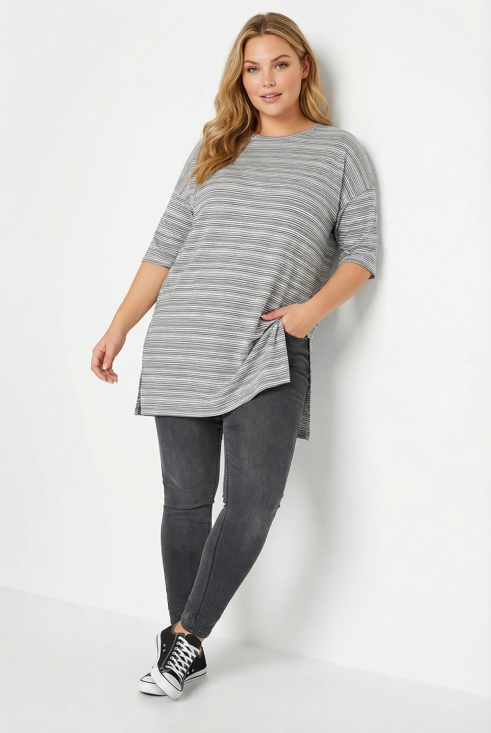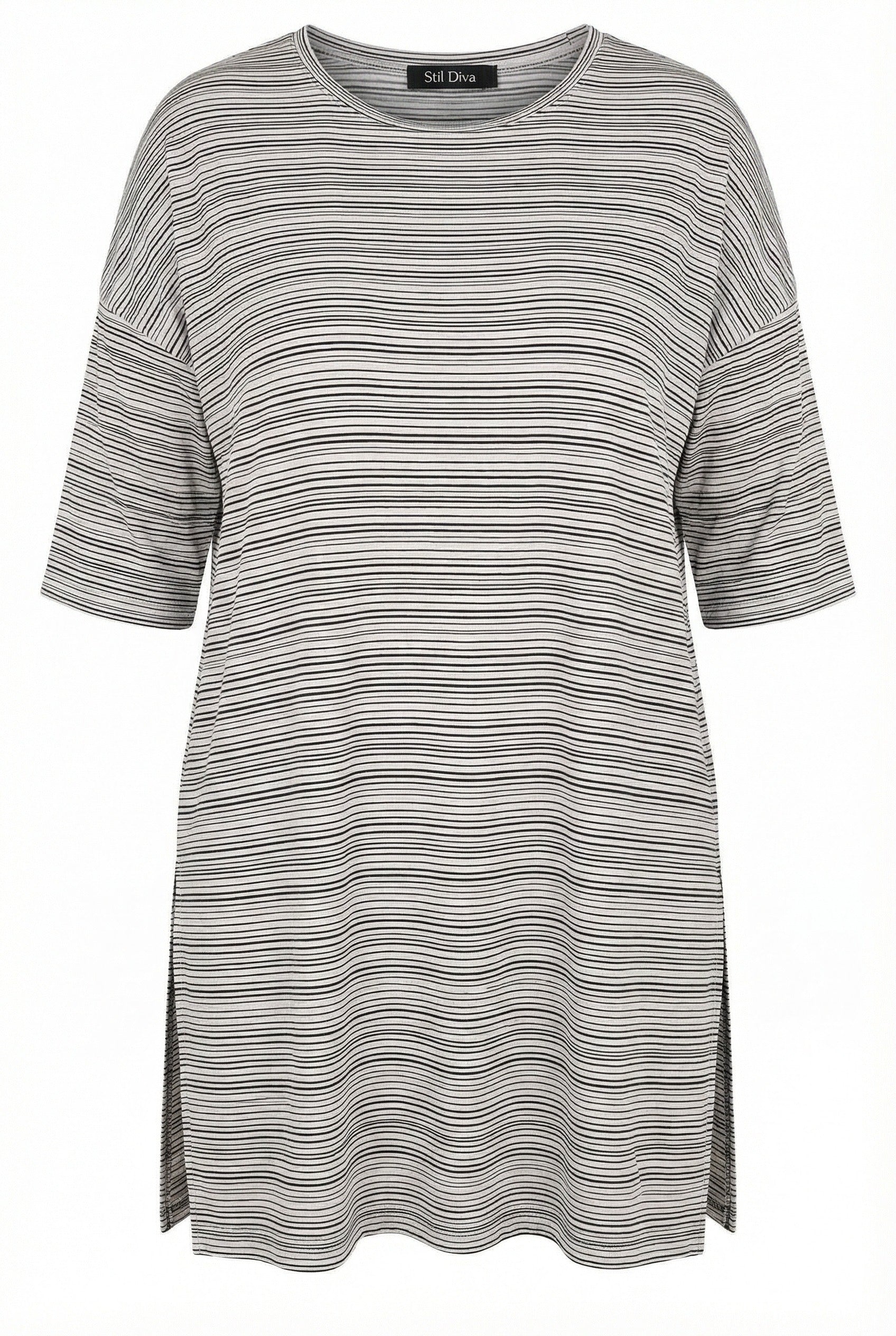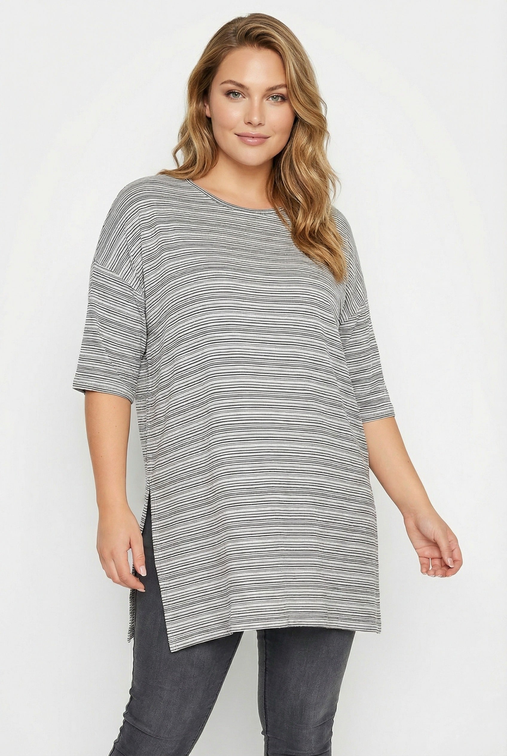 טישירט ארוכה במידות גדולות שרוול 3/4 צווארון עגול דוגמת פסים שסעים בצדדים 302946