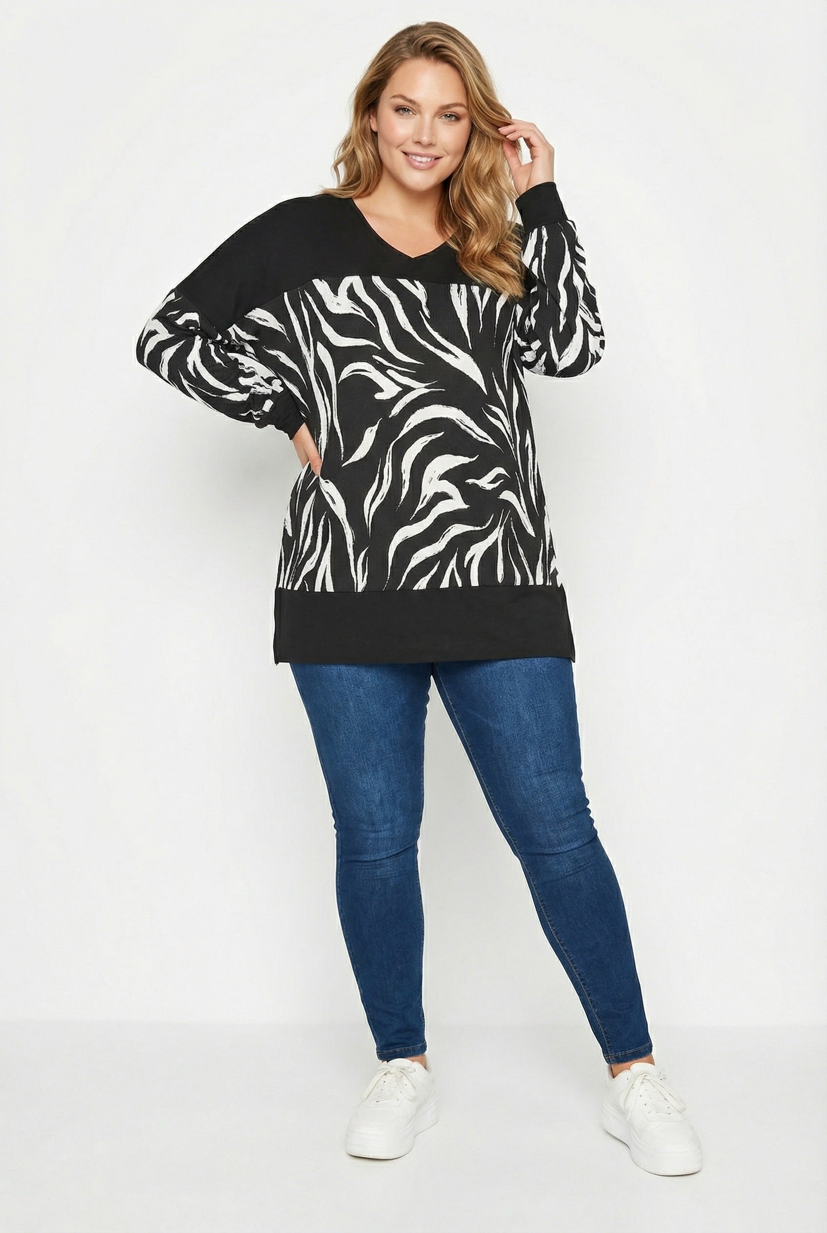 חולצה במידות גדולות עם הדפס גזרה ארוכה בד גמיש