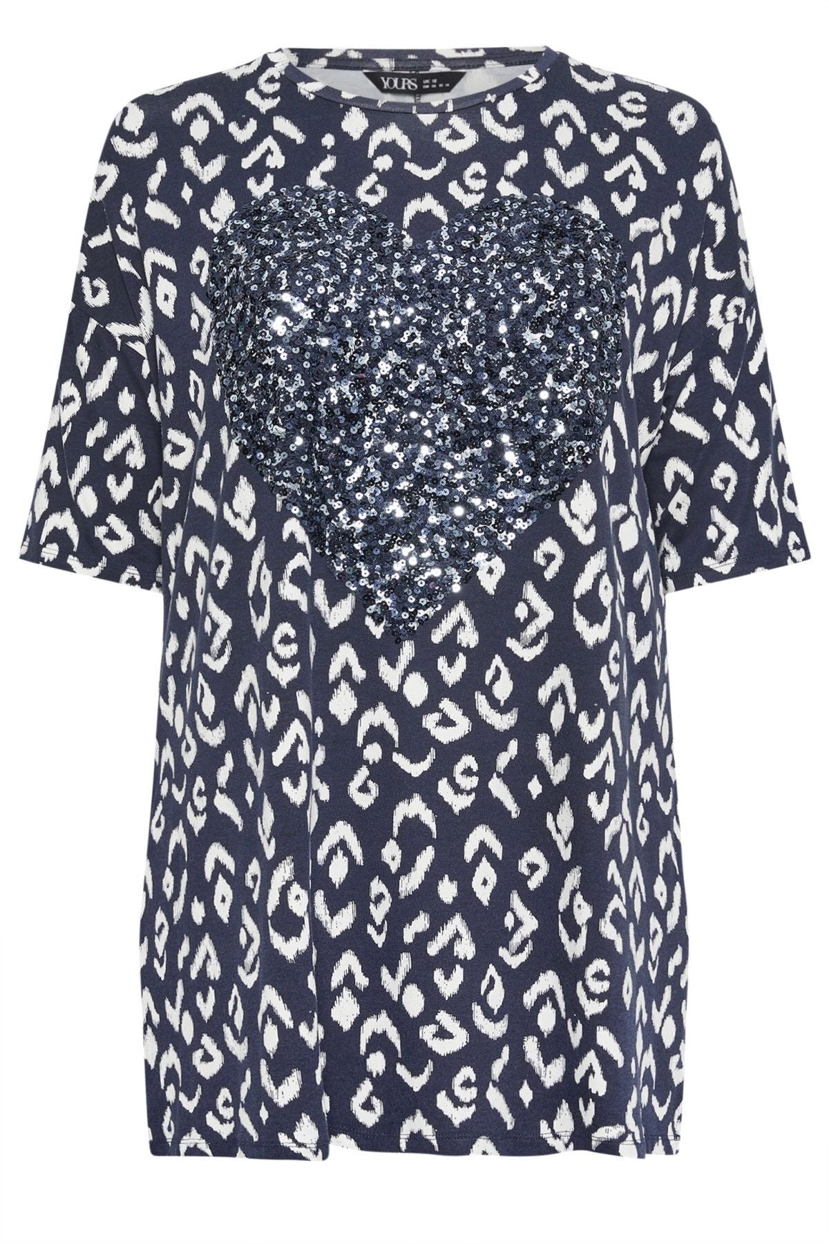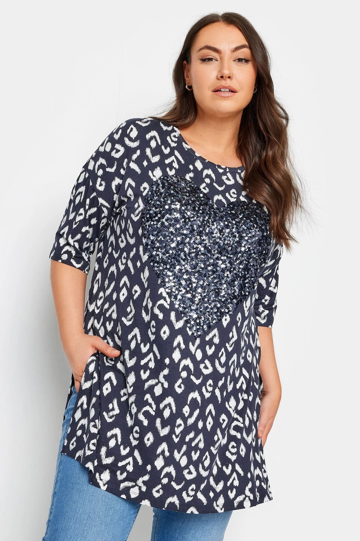 • פרטי הדגם: עיטורי פאייטים בצורת לב, הדפס אבסטרקטי, שרוול שלושה רבעים, צווארון עגול, שסעים בצדדים
