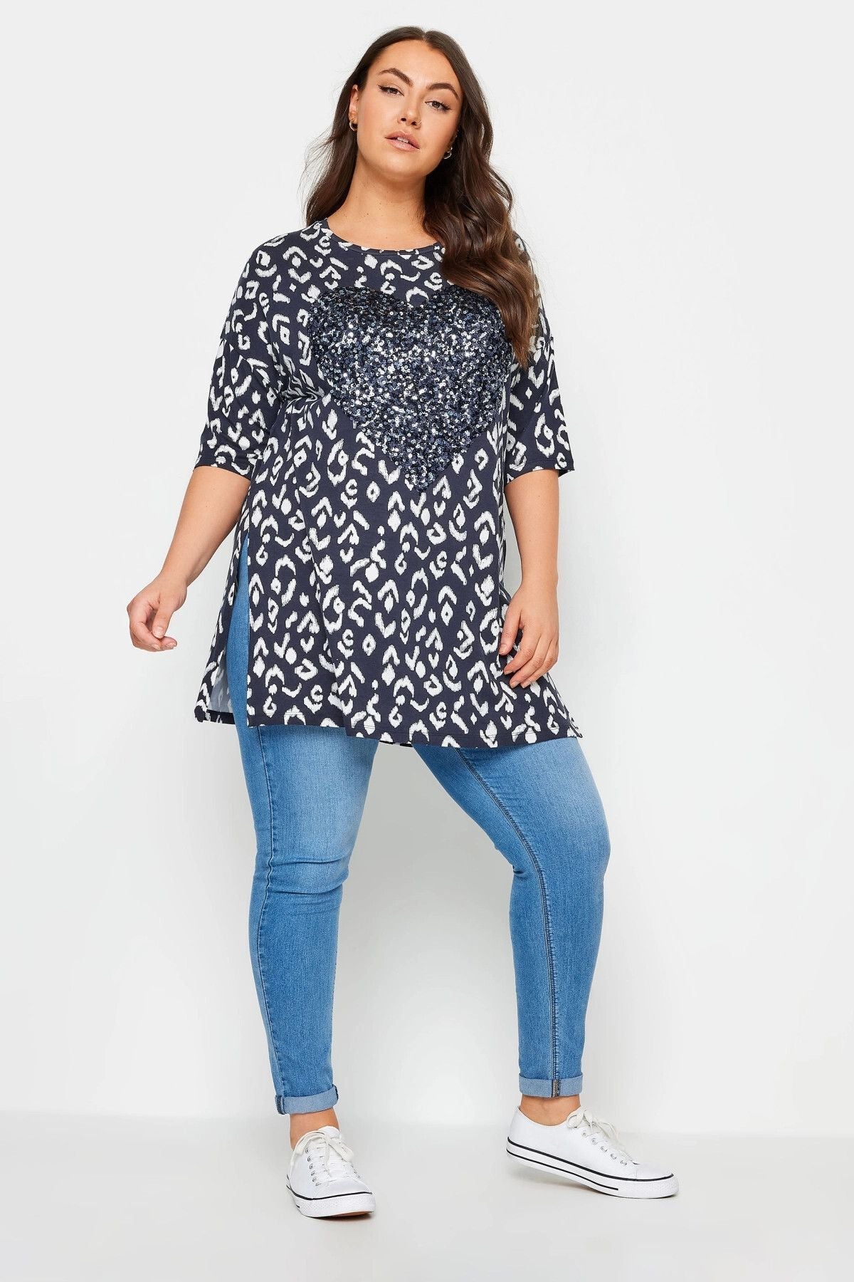 חולצה במידות גדולות עם צווארון עגול עיטורי פאייטים ושסעים בצדדים 303078