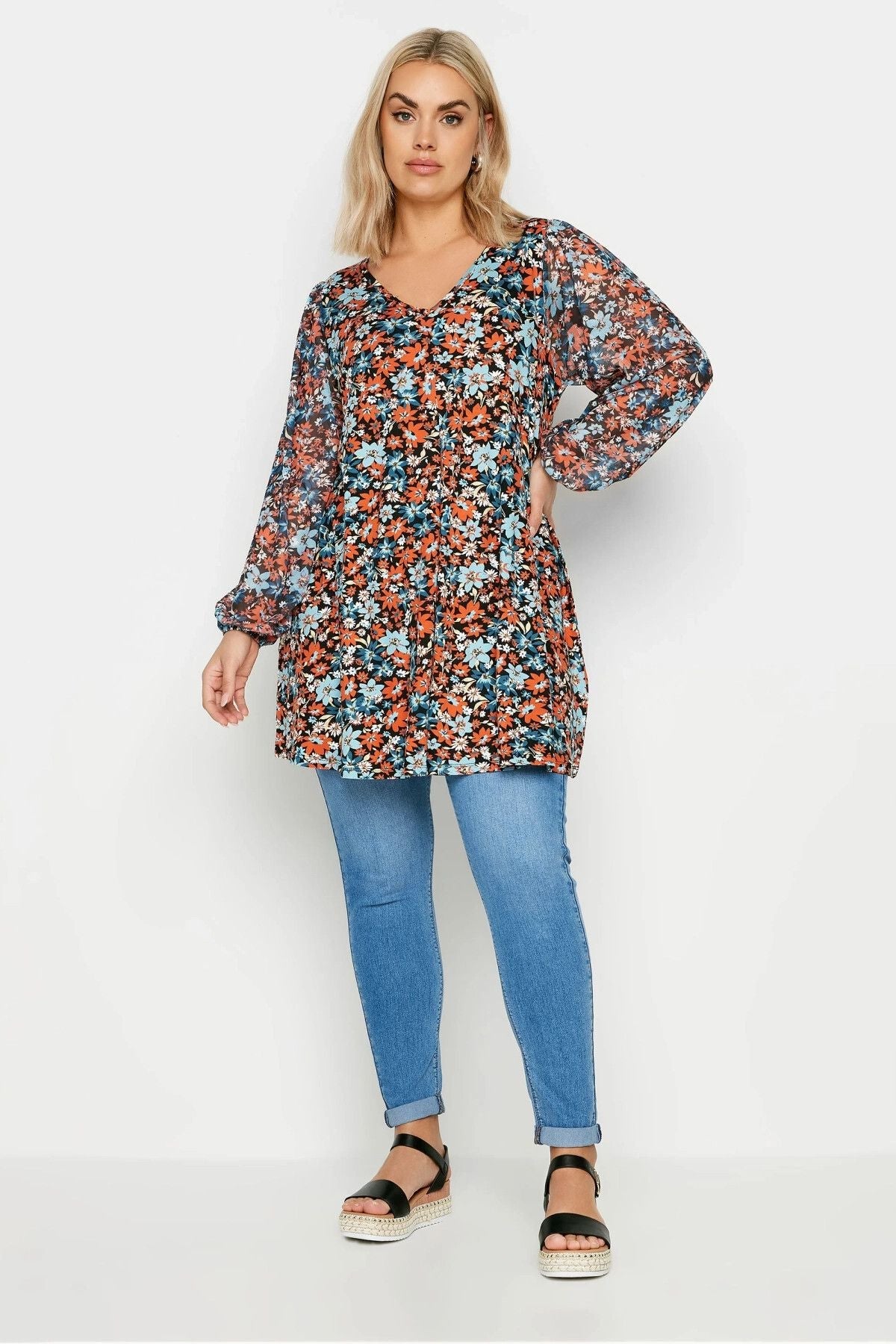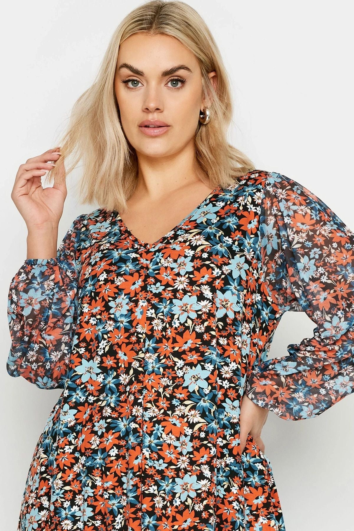 - פרטי הדגם: צווארון V, שרוול רשת ארוך, דוגמת פרחים