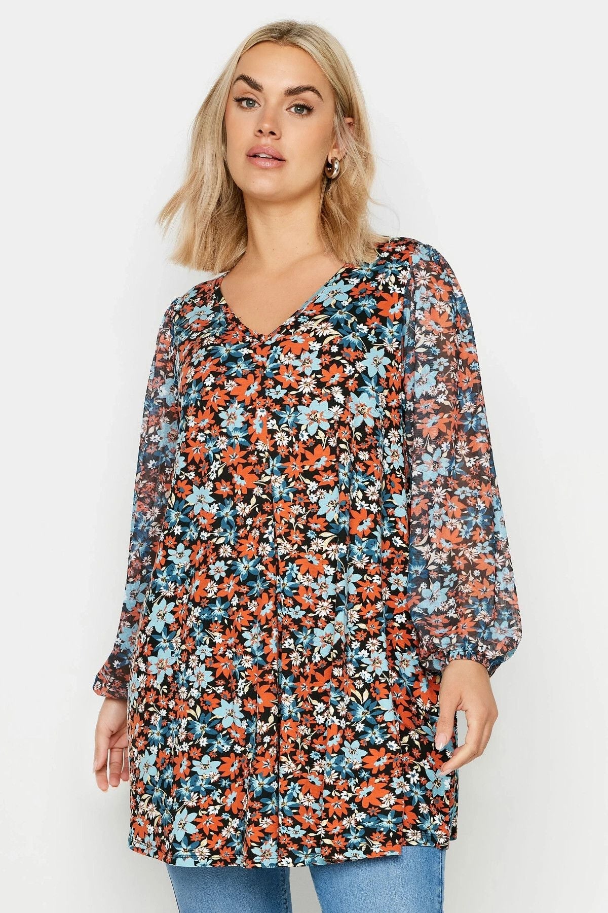 חולצה במידות גדולות שרוולים ארוכים צווארון V פרטי טול 303116