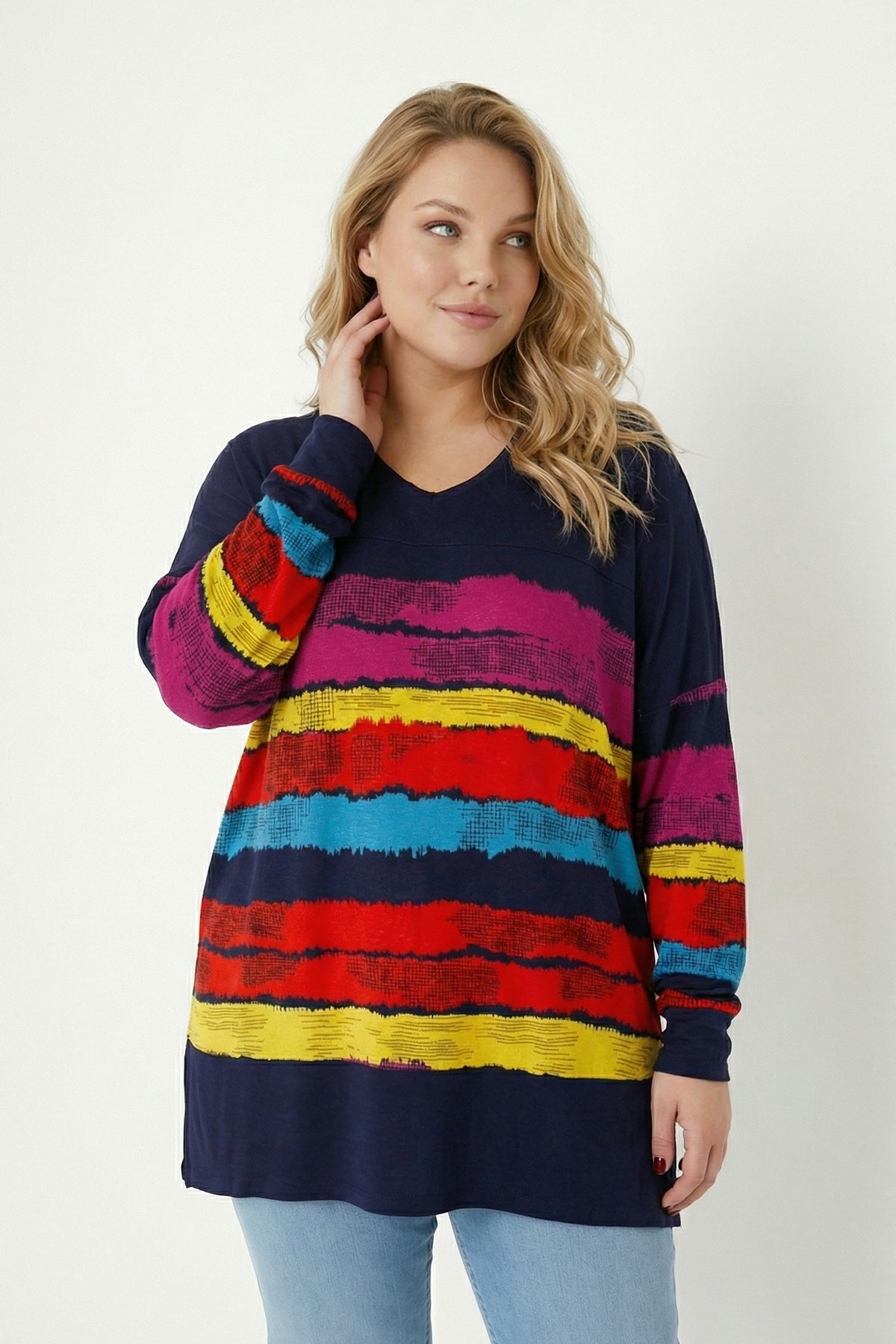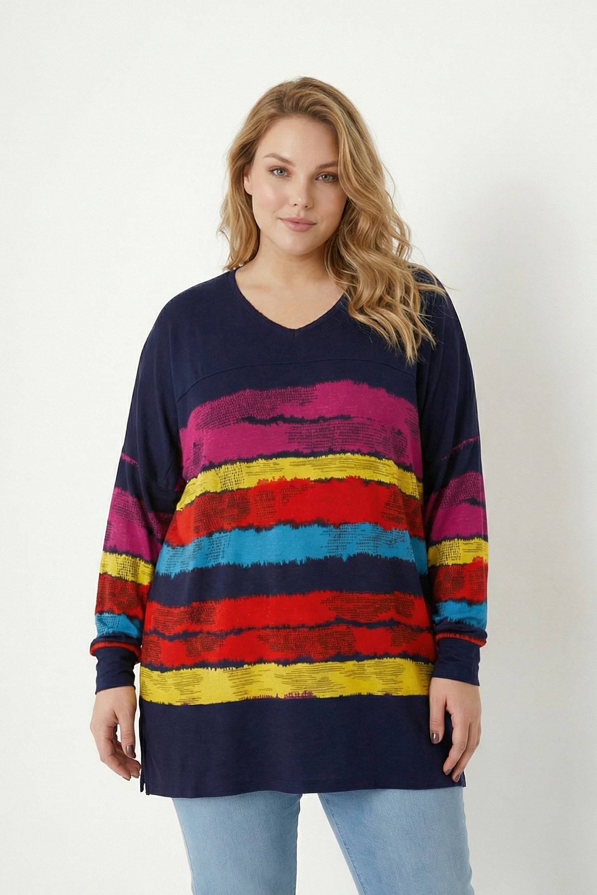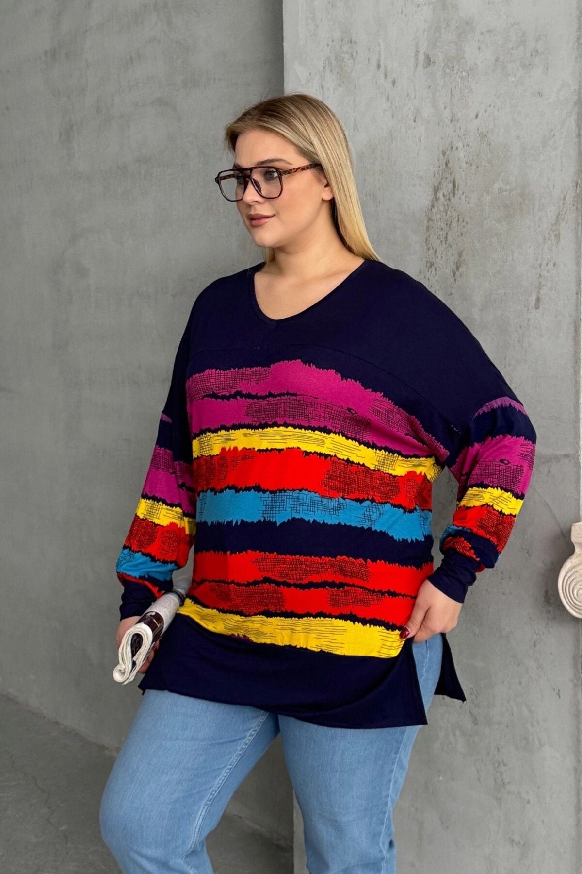 חולצה במידות גדולות צווארון וי דוגמת פסים צבעוניים