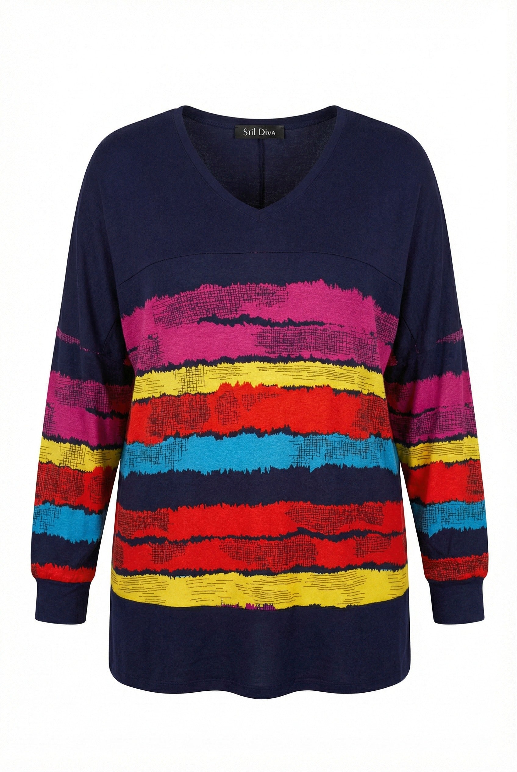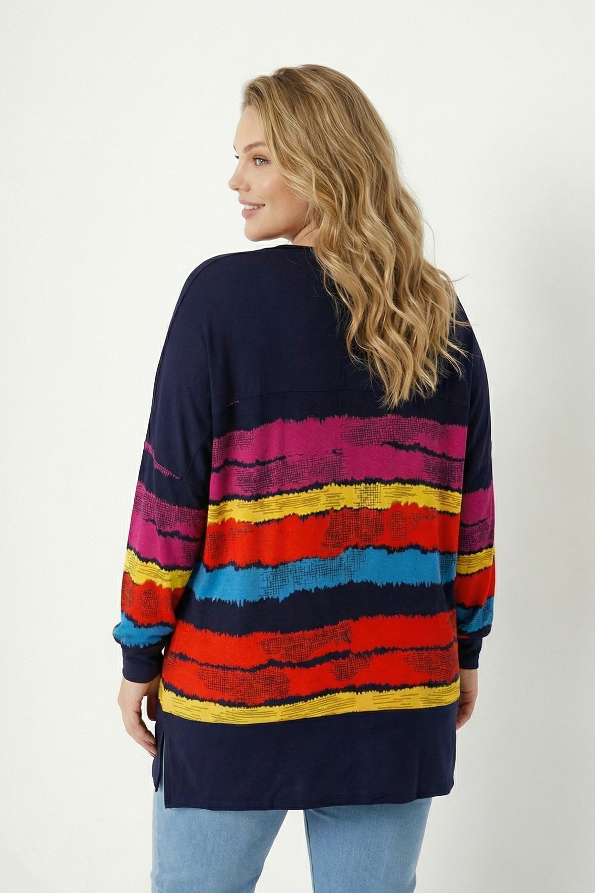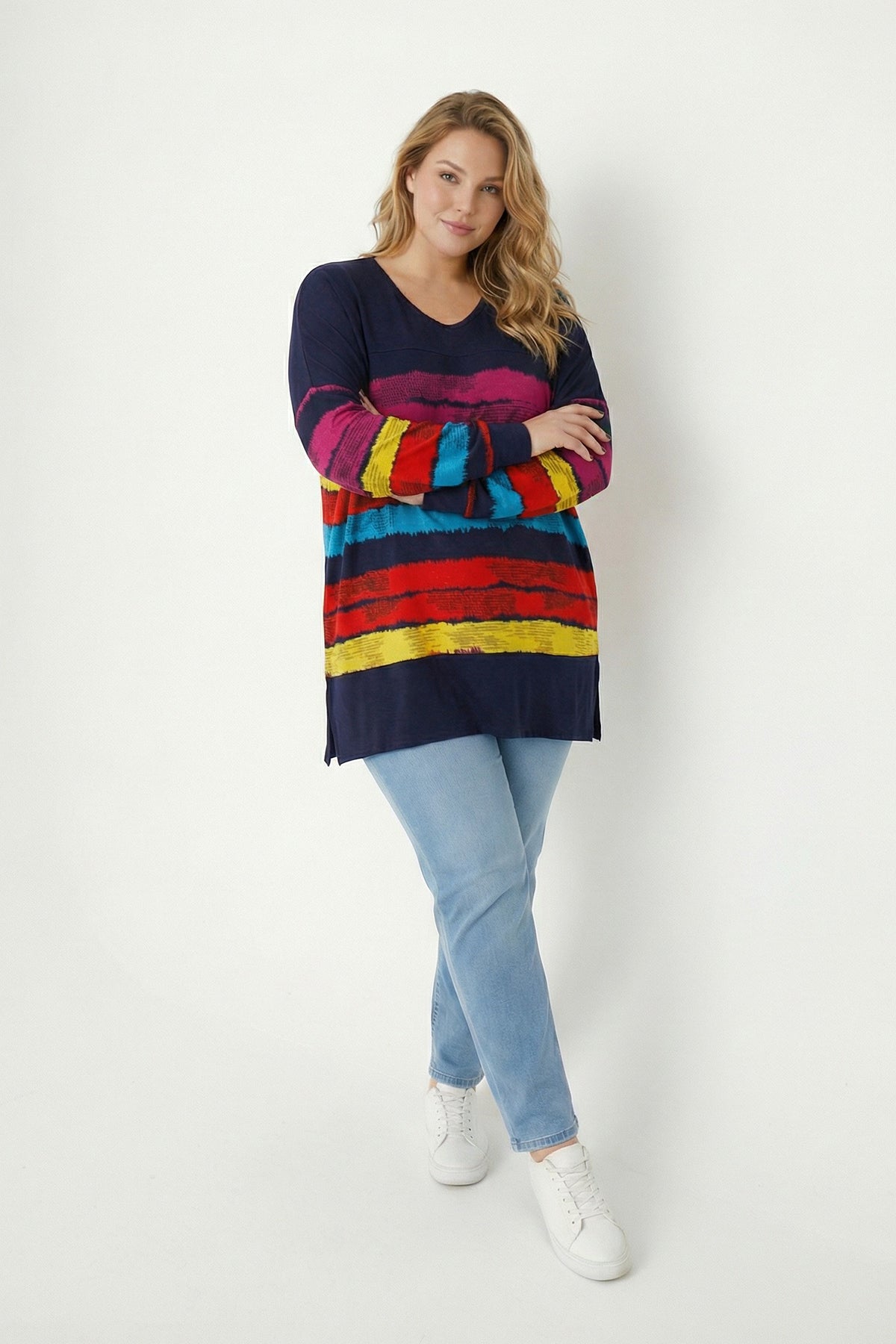 חולצה במידות גדולות צווארון וי דוגמת פסים צבעוניים