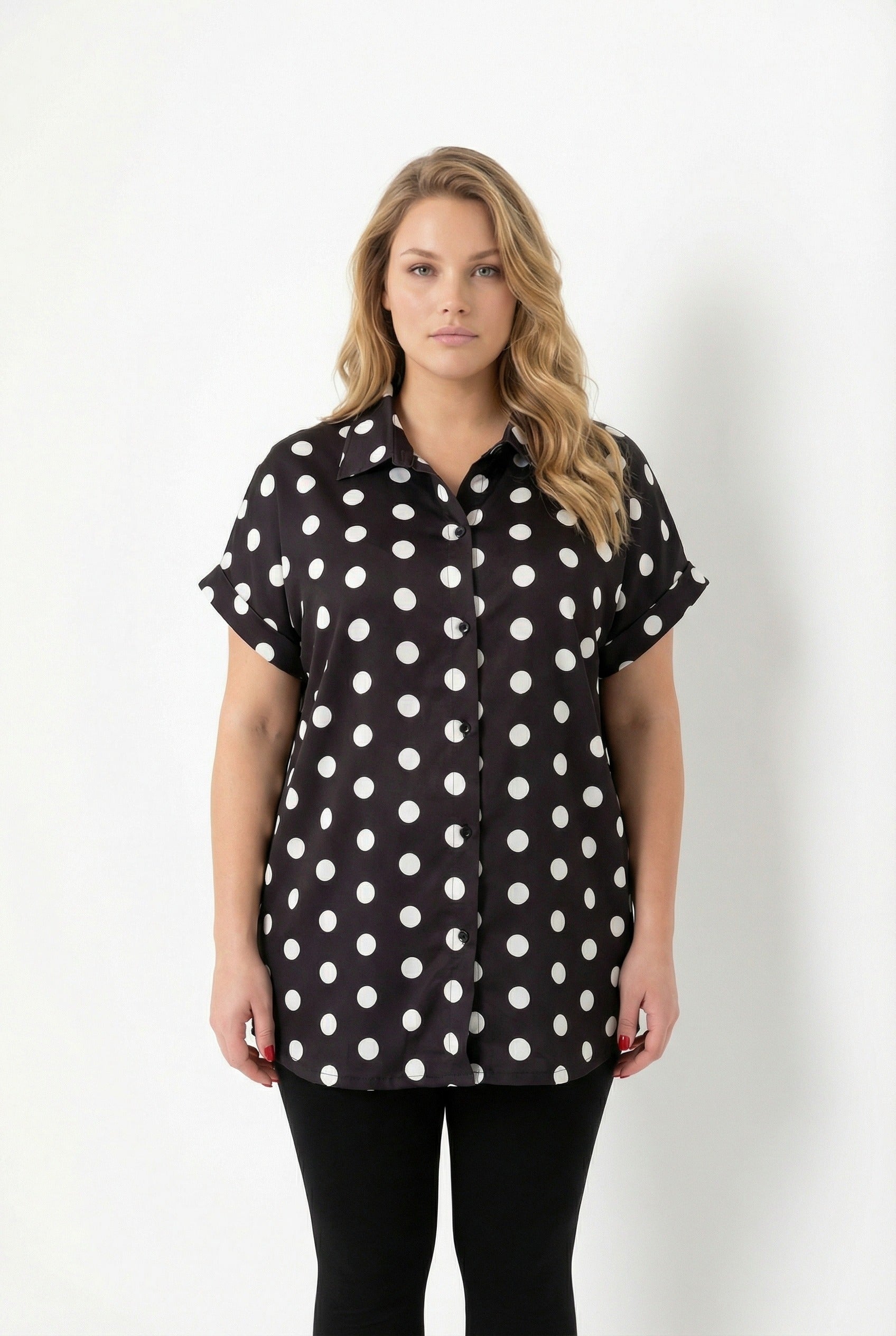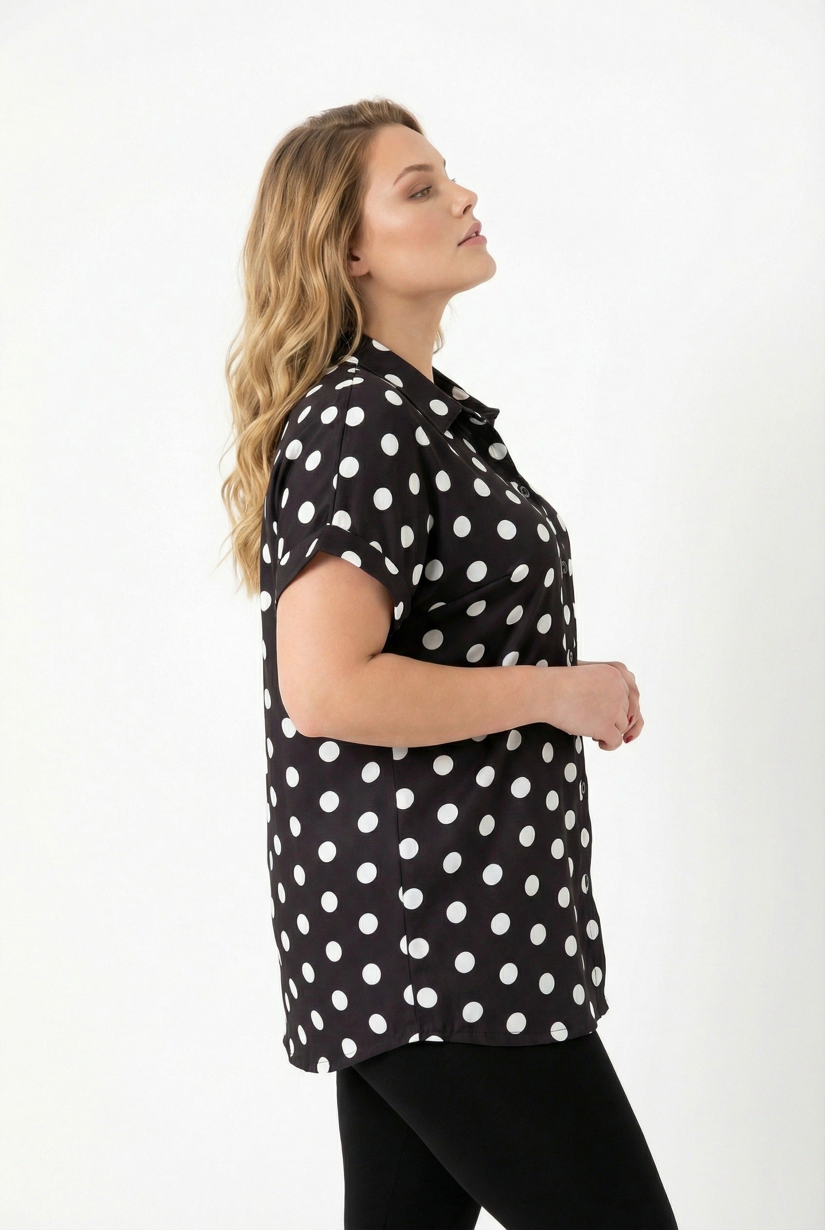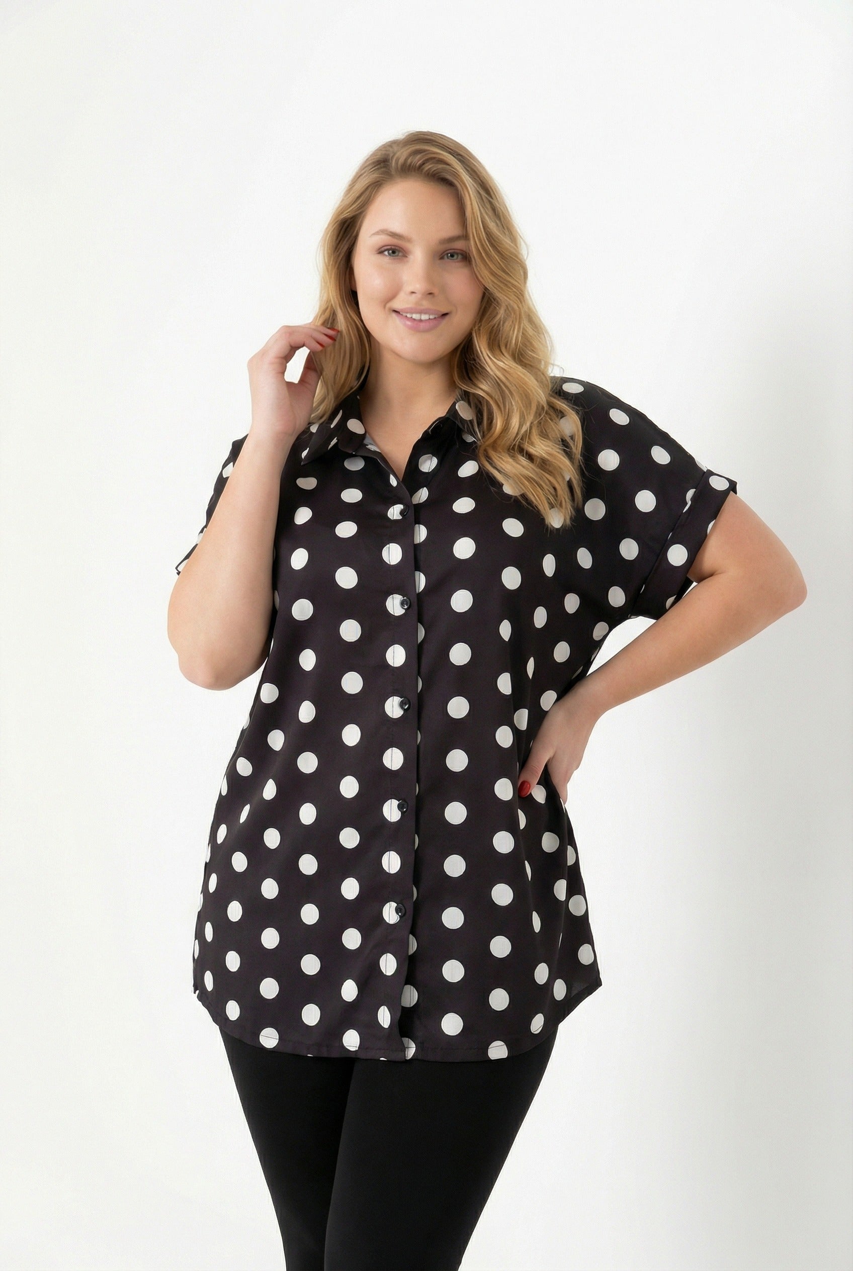 חולצה מכופתרת במידות גדולות עם כפתורים שרוול קצר דוגמת נקודות 303460