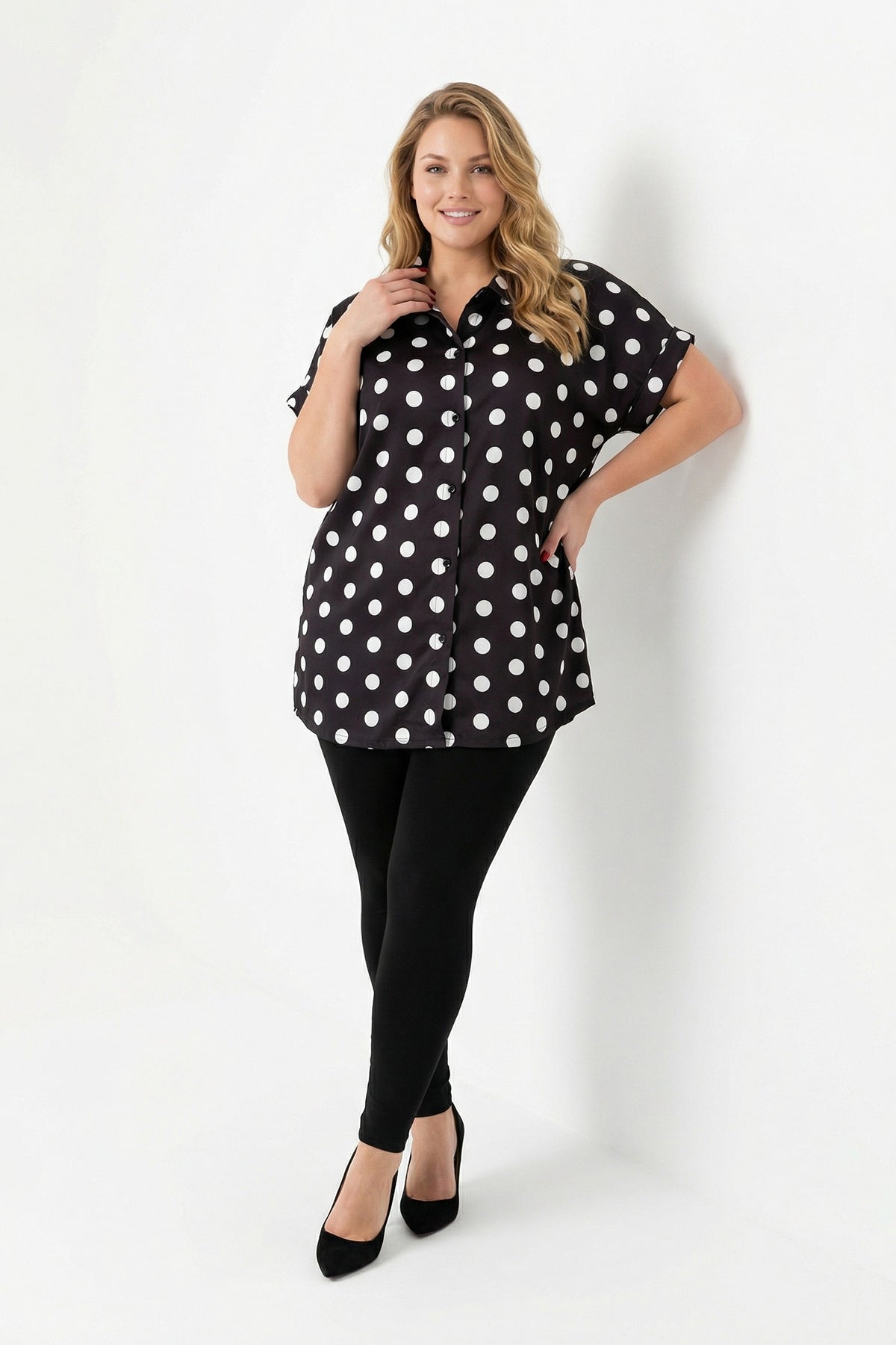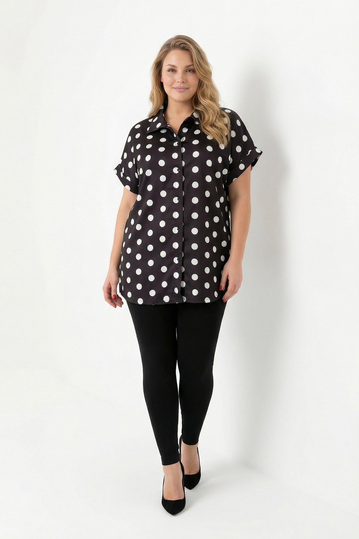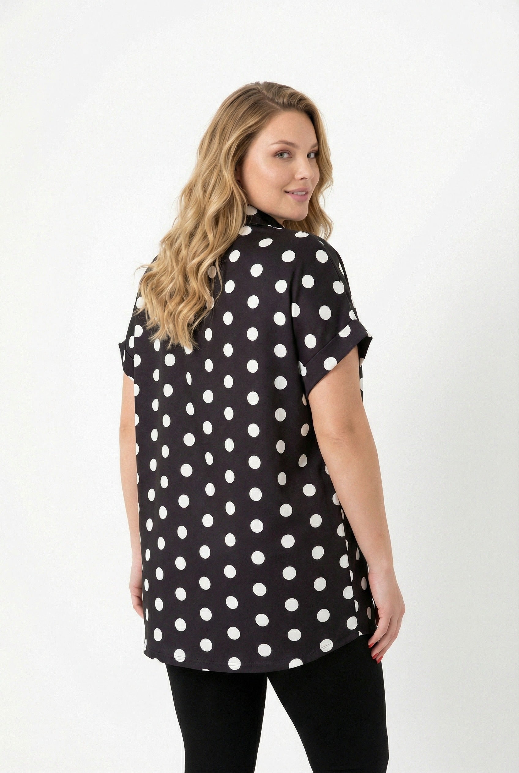חולצה מכופתרת במידות גדולות עם כפתורים שרוול קצר דוגמת נקודות 303460