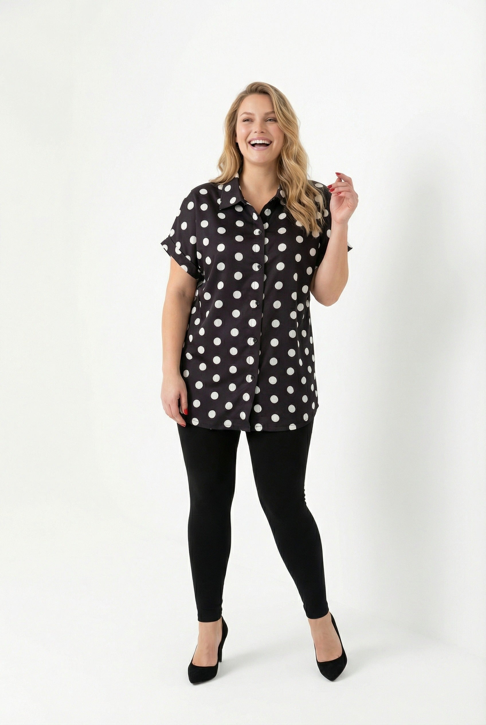 • תיאור מוצר: חולצה דוגמת נקודות עם כפתורים ללבישה יומיומית נוחה.