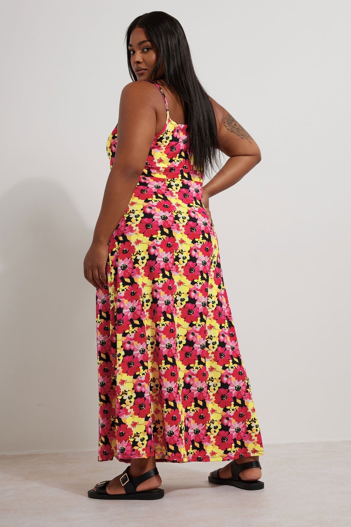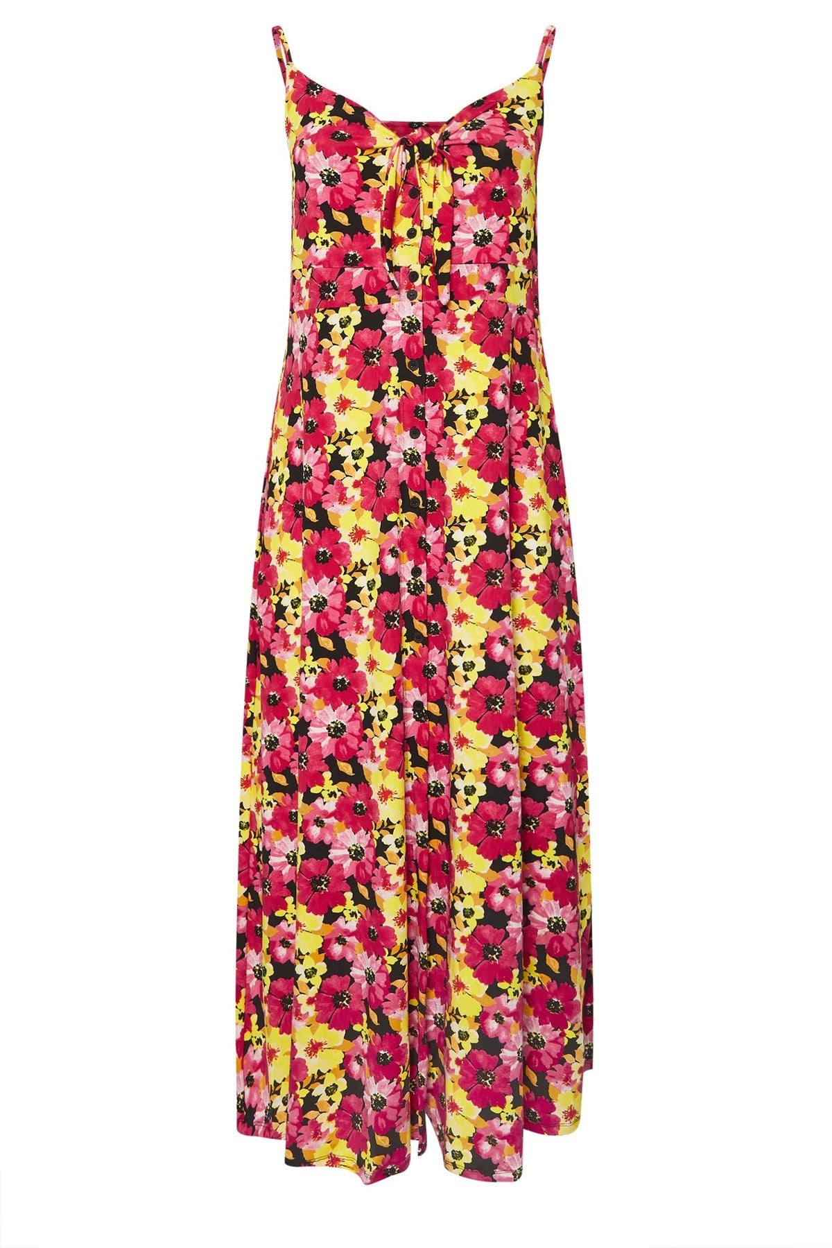 - פרטי הדגם: דוגמת פרחים, מקסי, פרטי כיווץ קדמי, ללא שרוולים, כתפיות מתכווננות, פרטי כפתורים