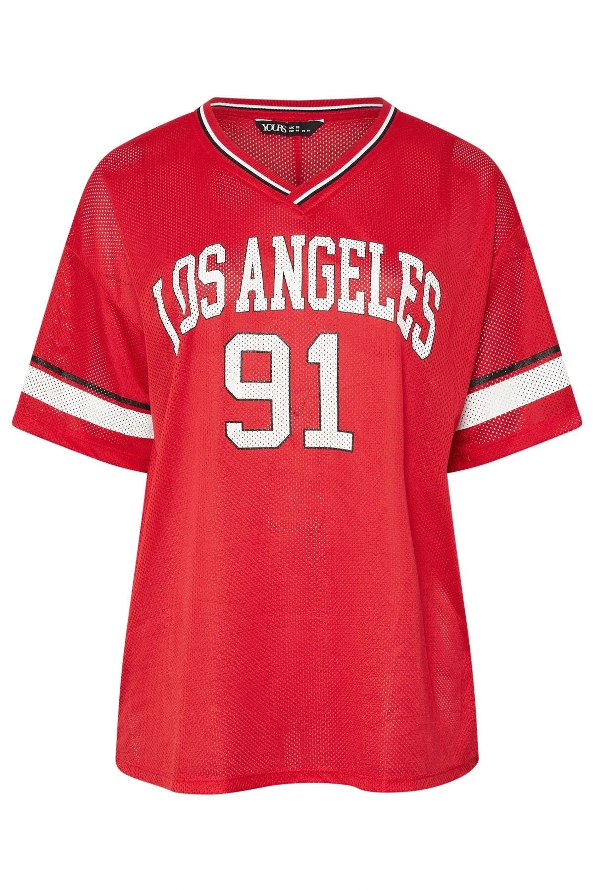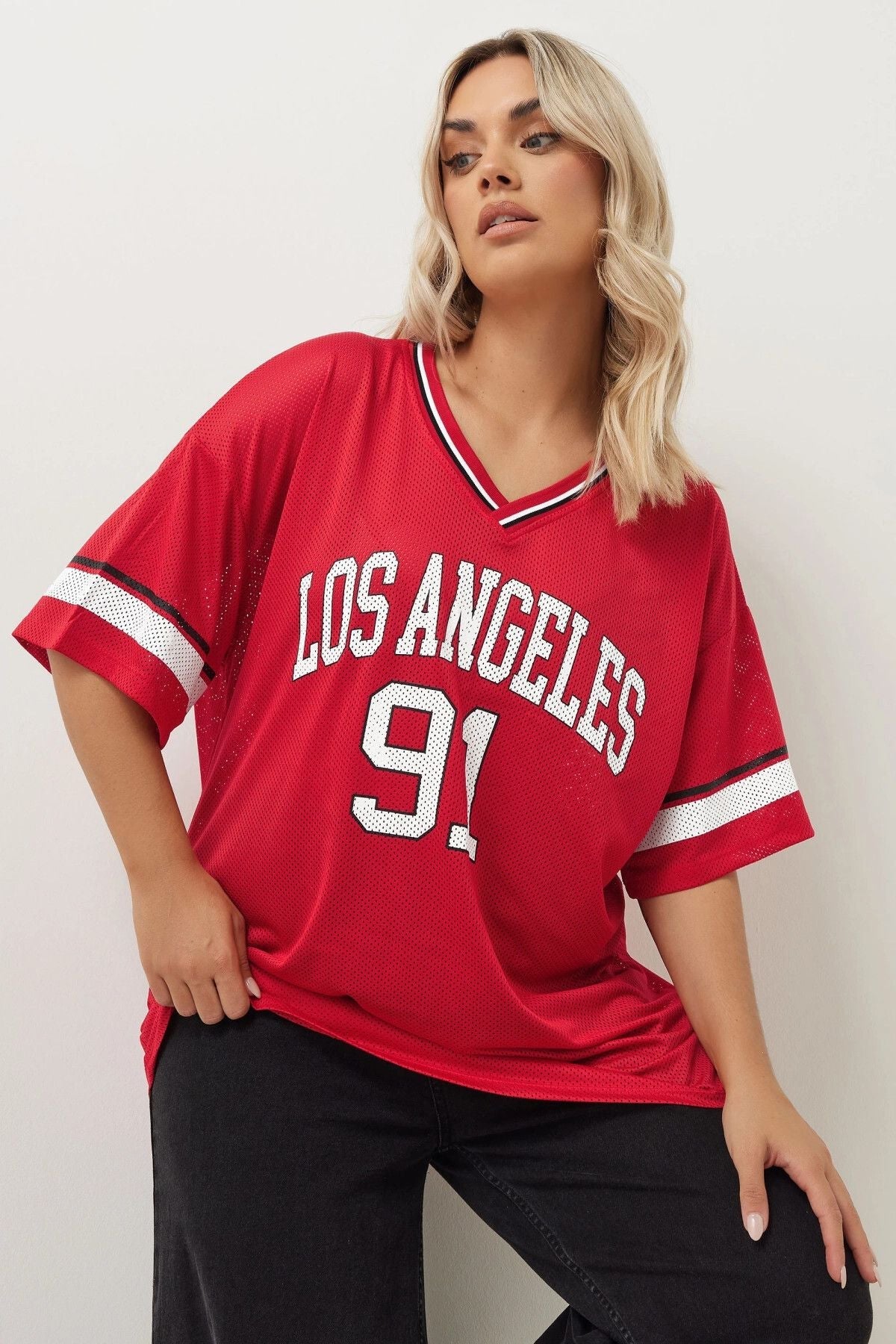 • פרטי הדגם: עיצוב סיסמה Los Angeles, צווארון V, שרוול קצר עם פרטי פסים, גזרה רחבה