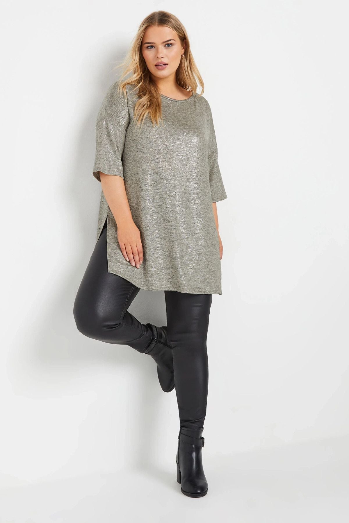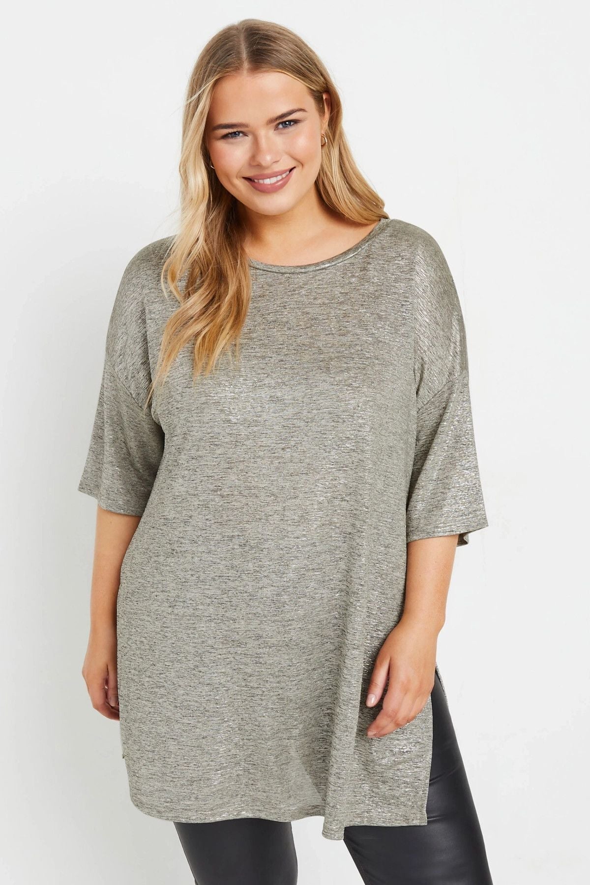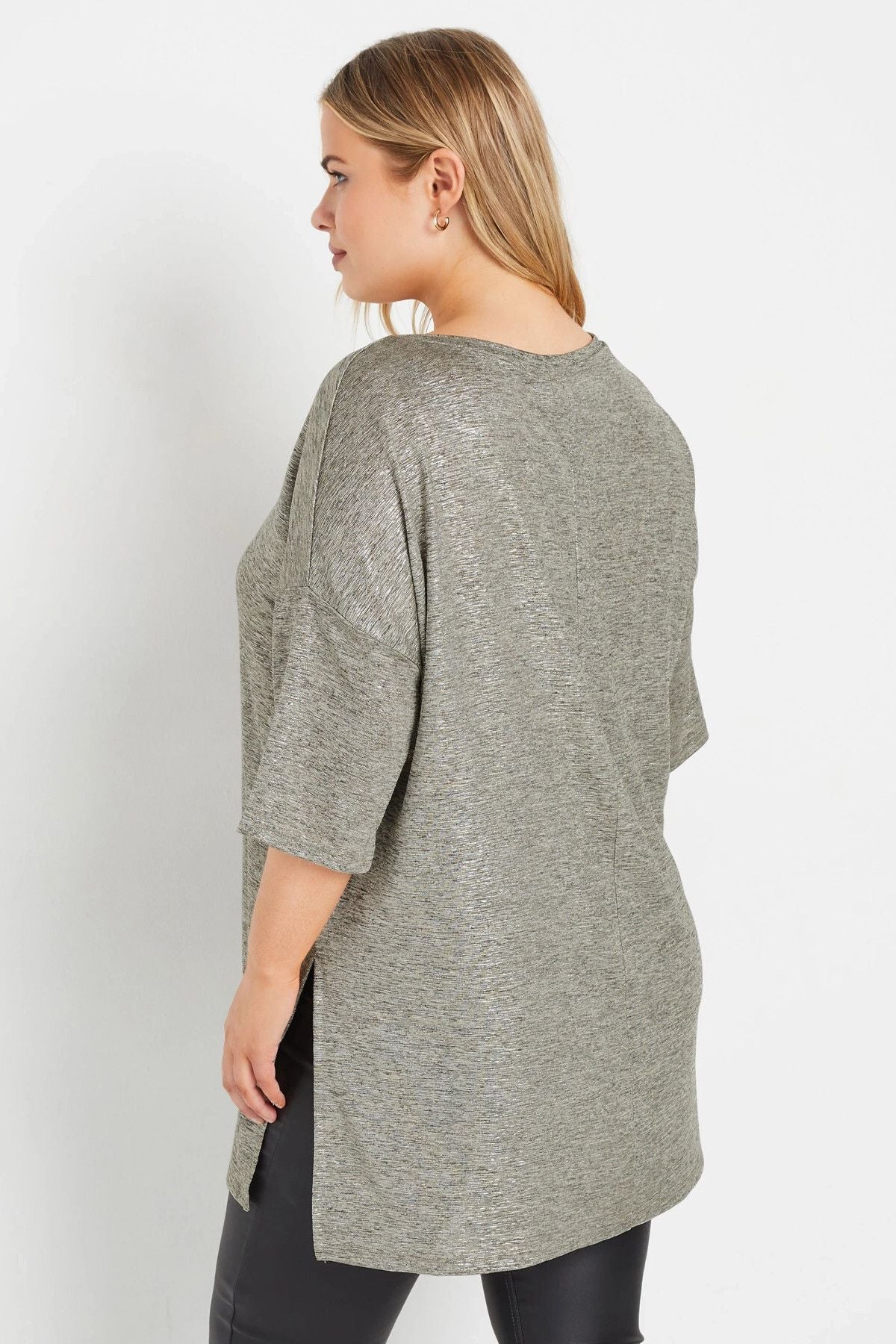 חולצה במידות גדולות עם צווארון עגול שרוולים קצרים שסע צדדי מראה מבריק 303613