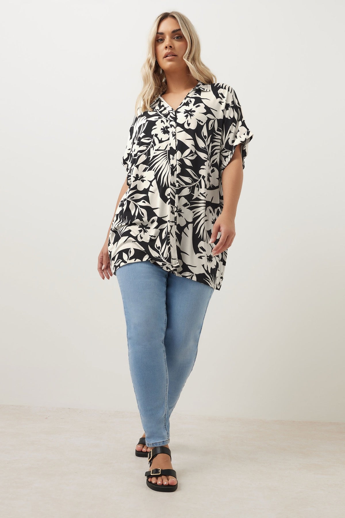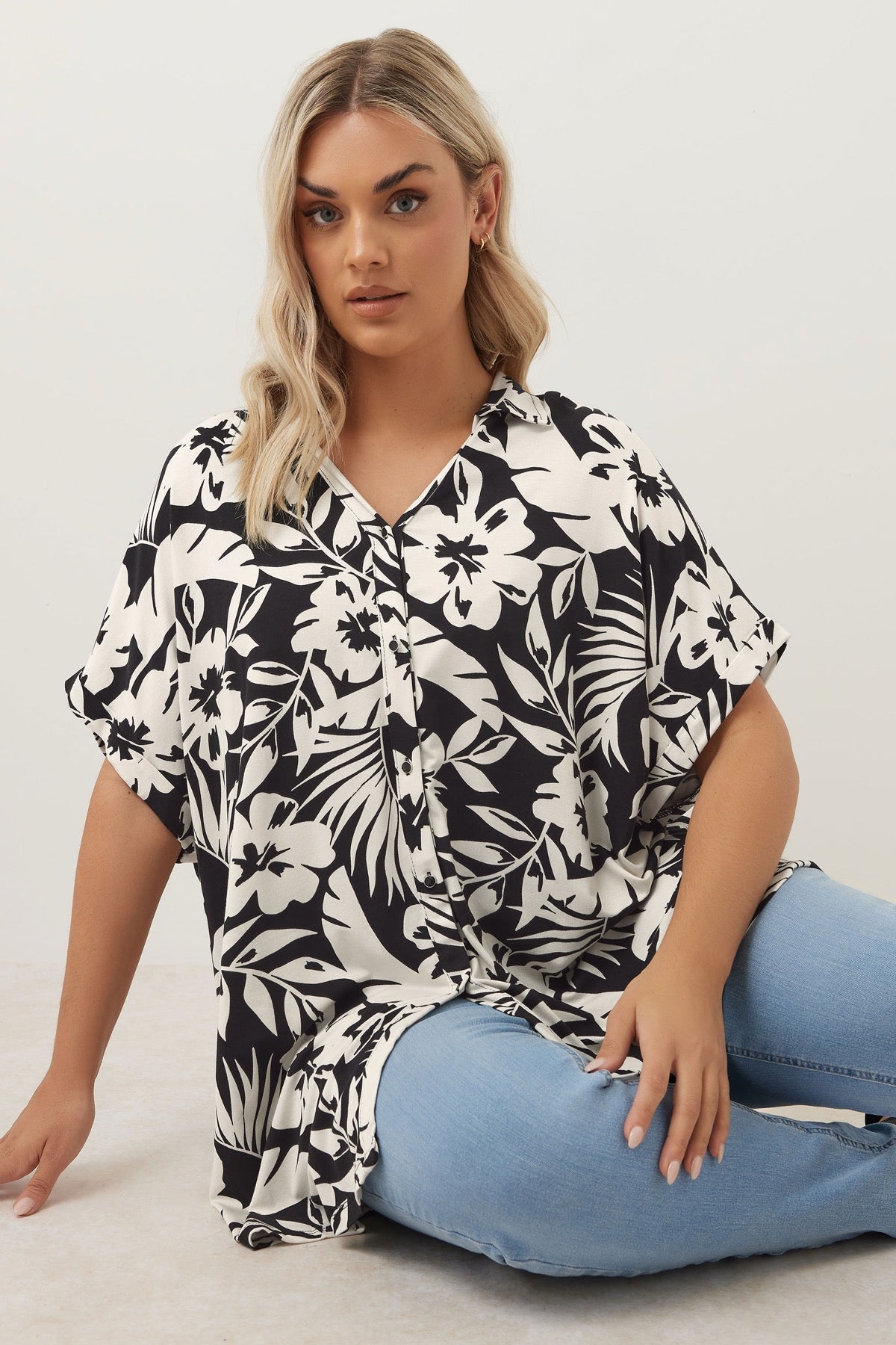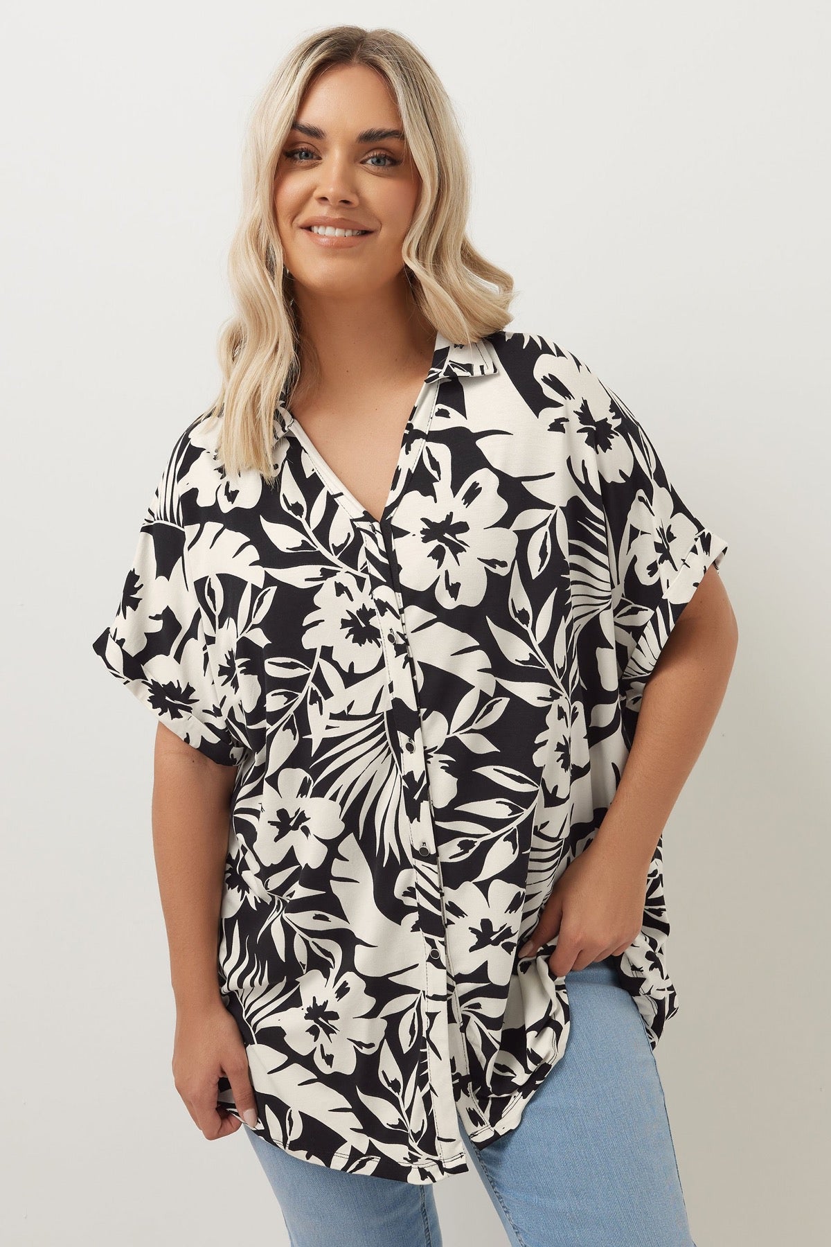 חולצה מכופתרת קצרה במידות גדולות עם דוגמת פרחים 303686