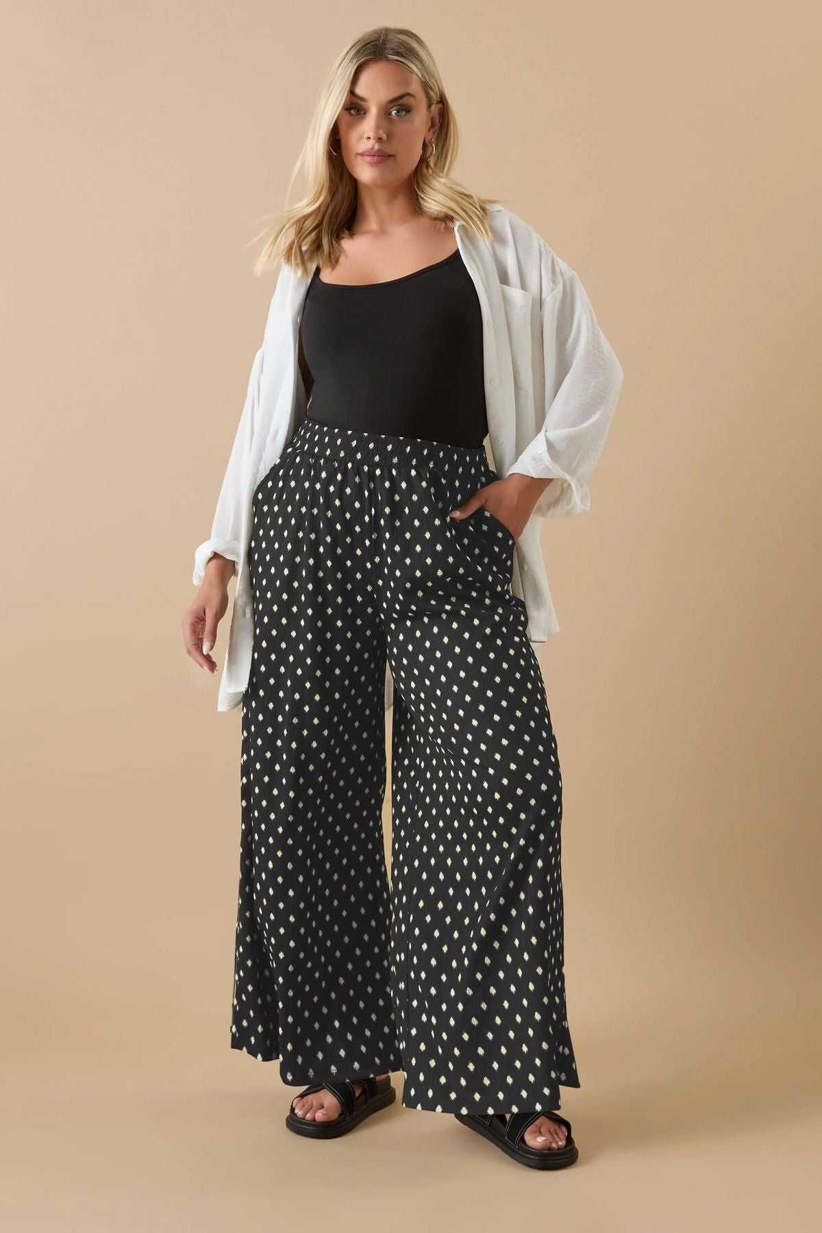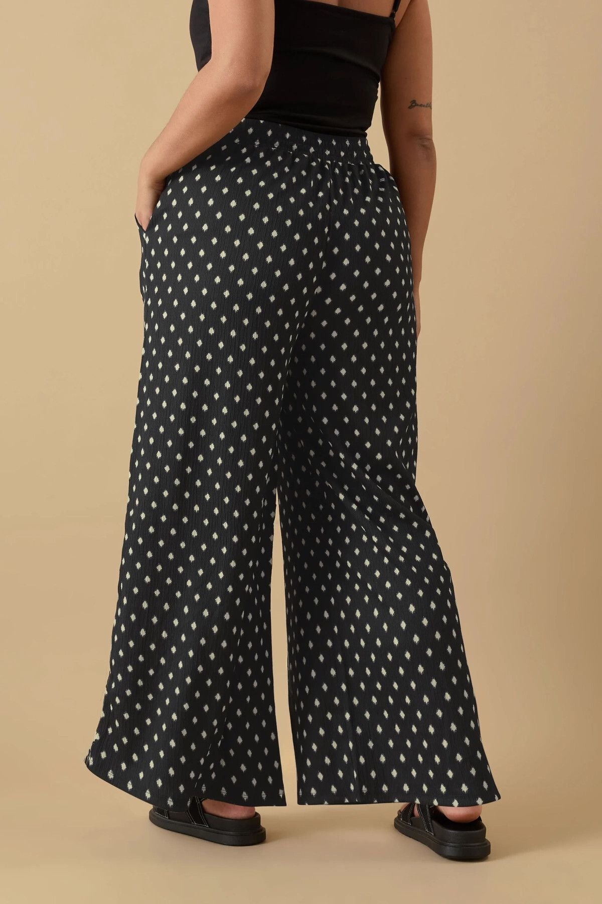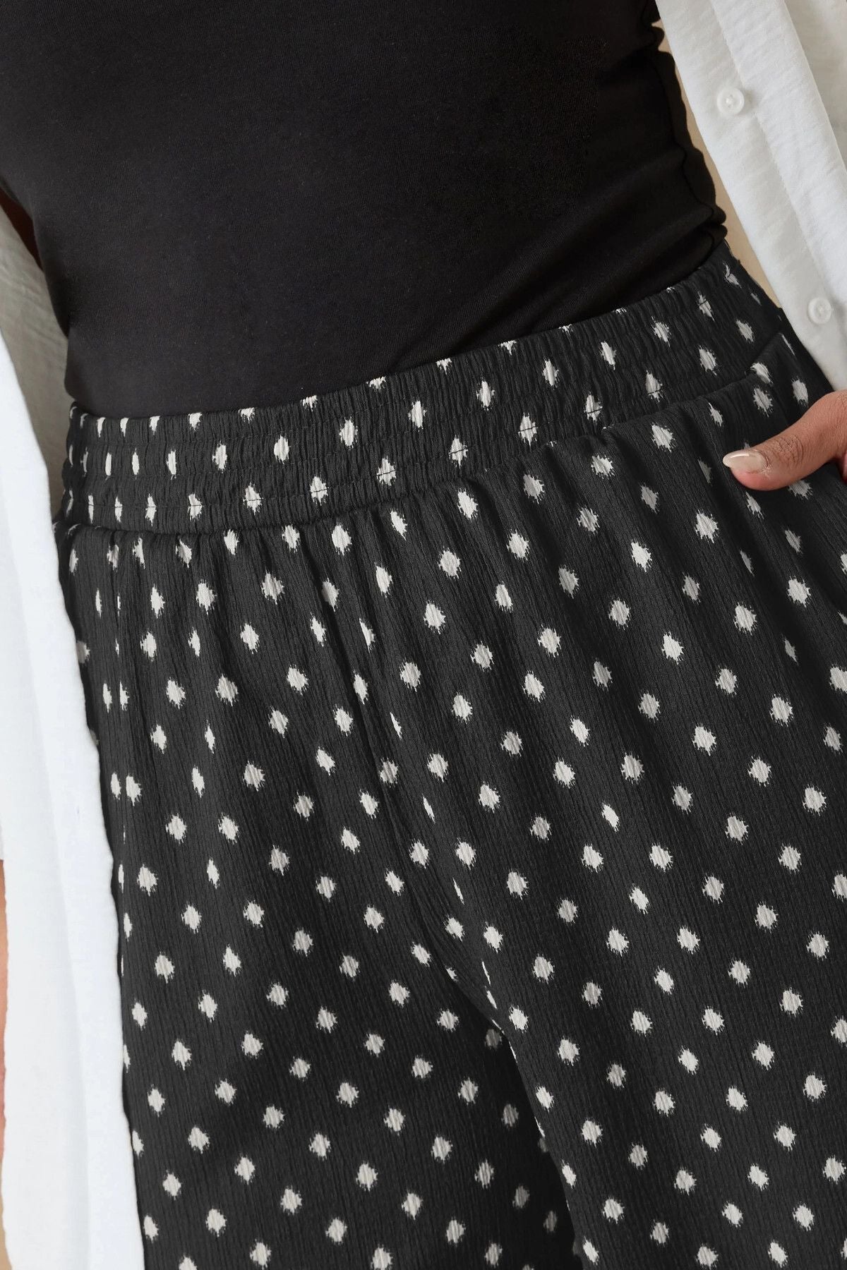 - פרטי הדגם: הדפס פולקה דוט, גזרה רחבה, גומי במותן גבוהה, עם כיסים
