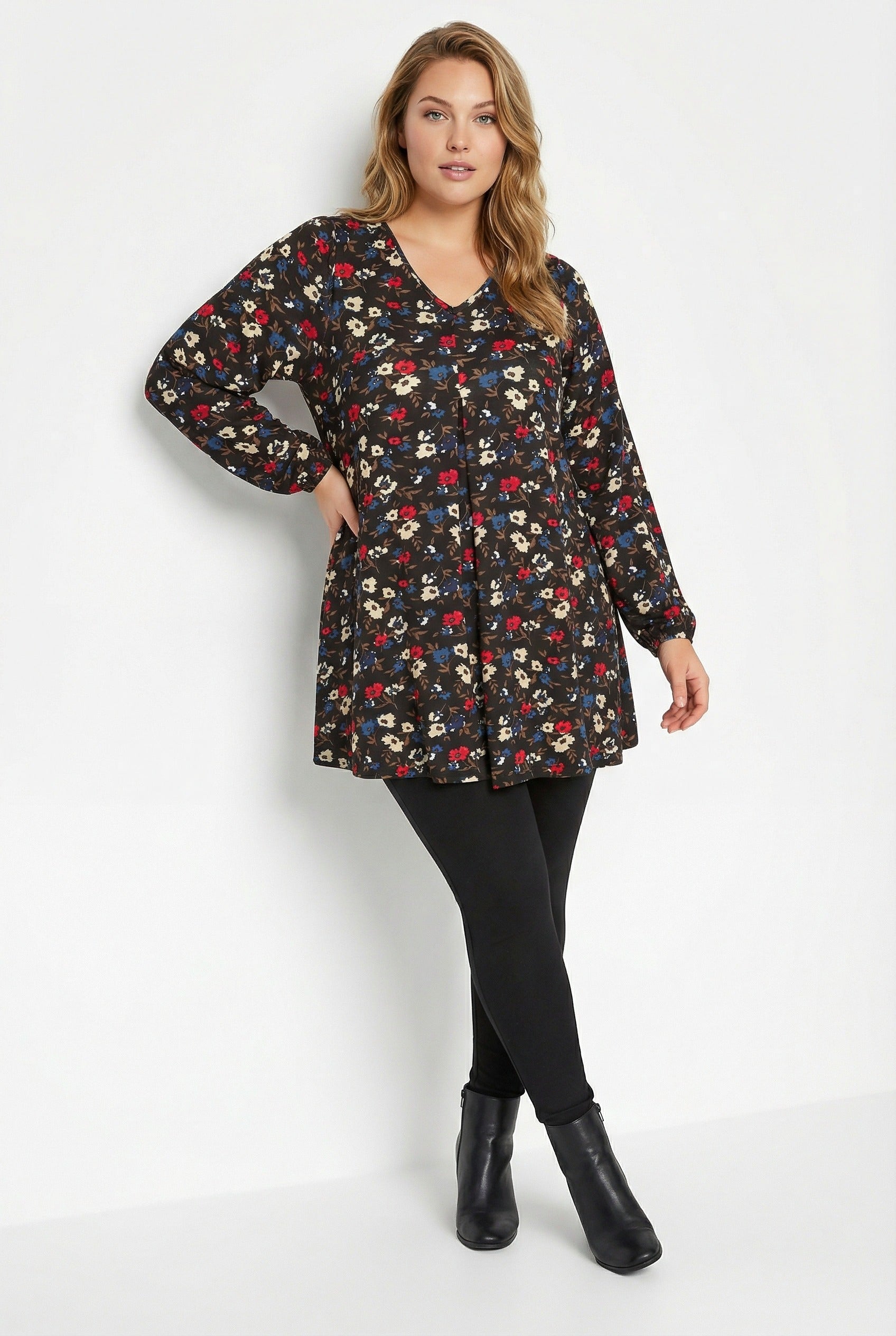 • פרטי הדגם: דוגמת פרחים, חזית עם קפלים, גזרת סווינג, צווארון וי, שרוול ארוך