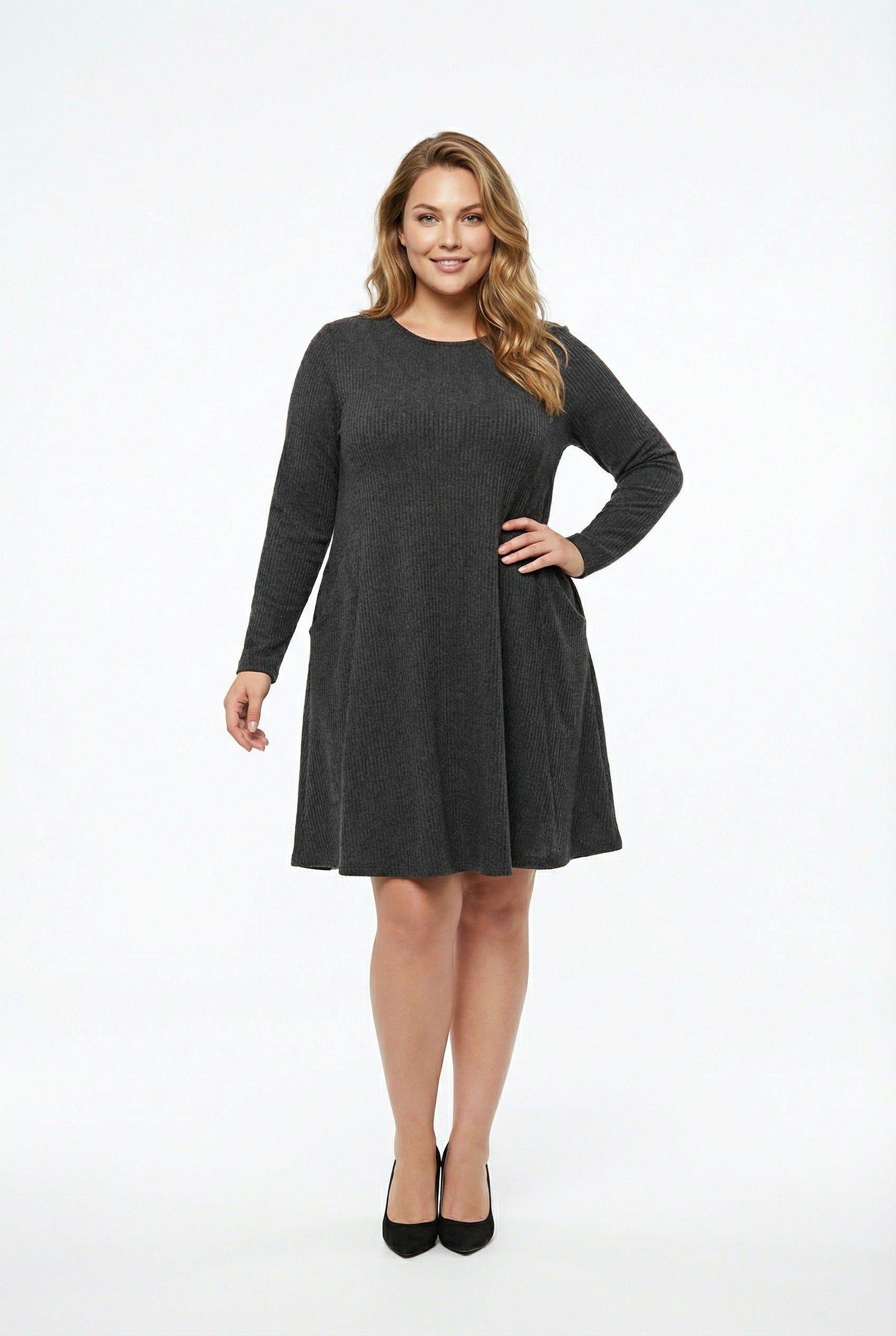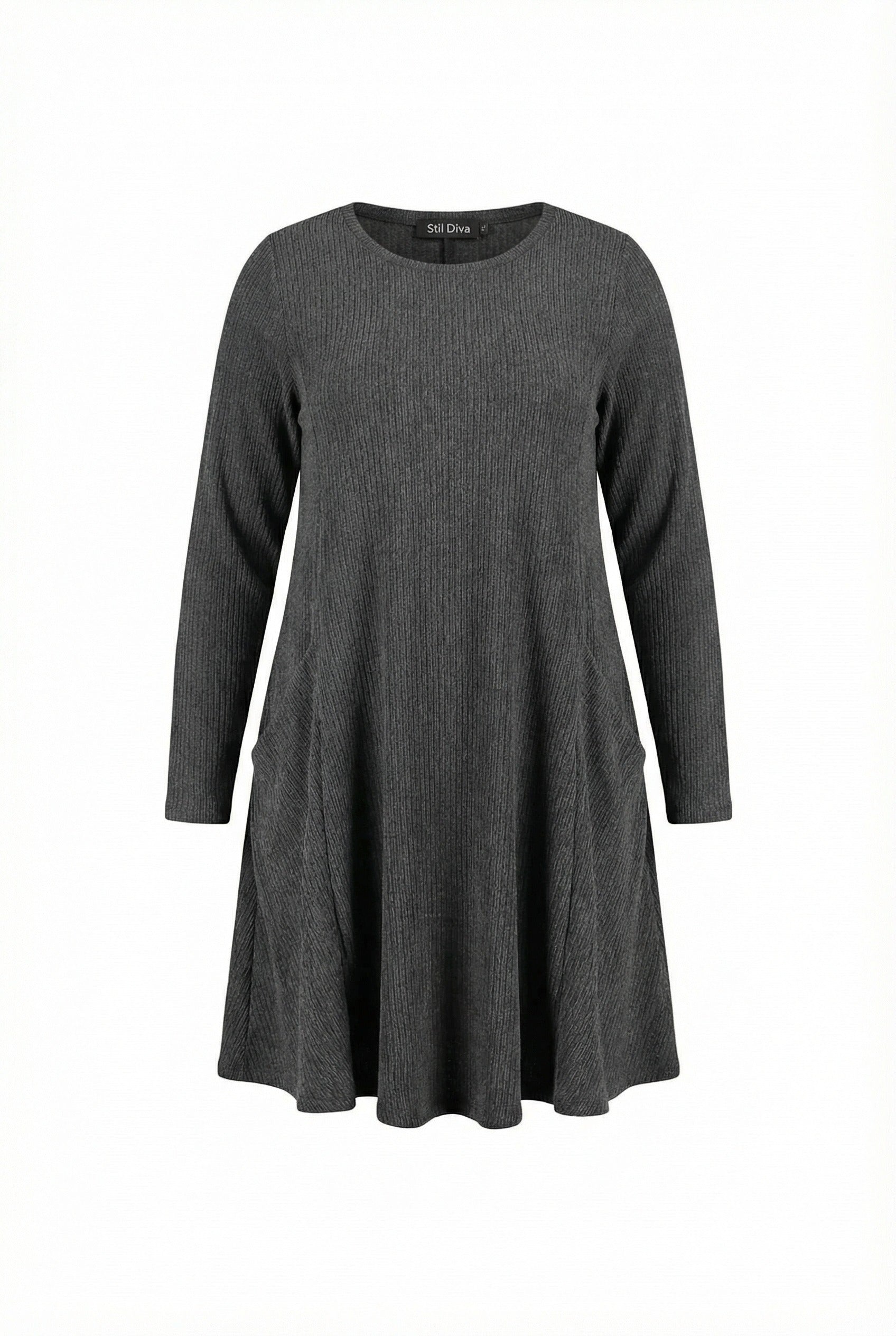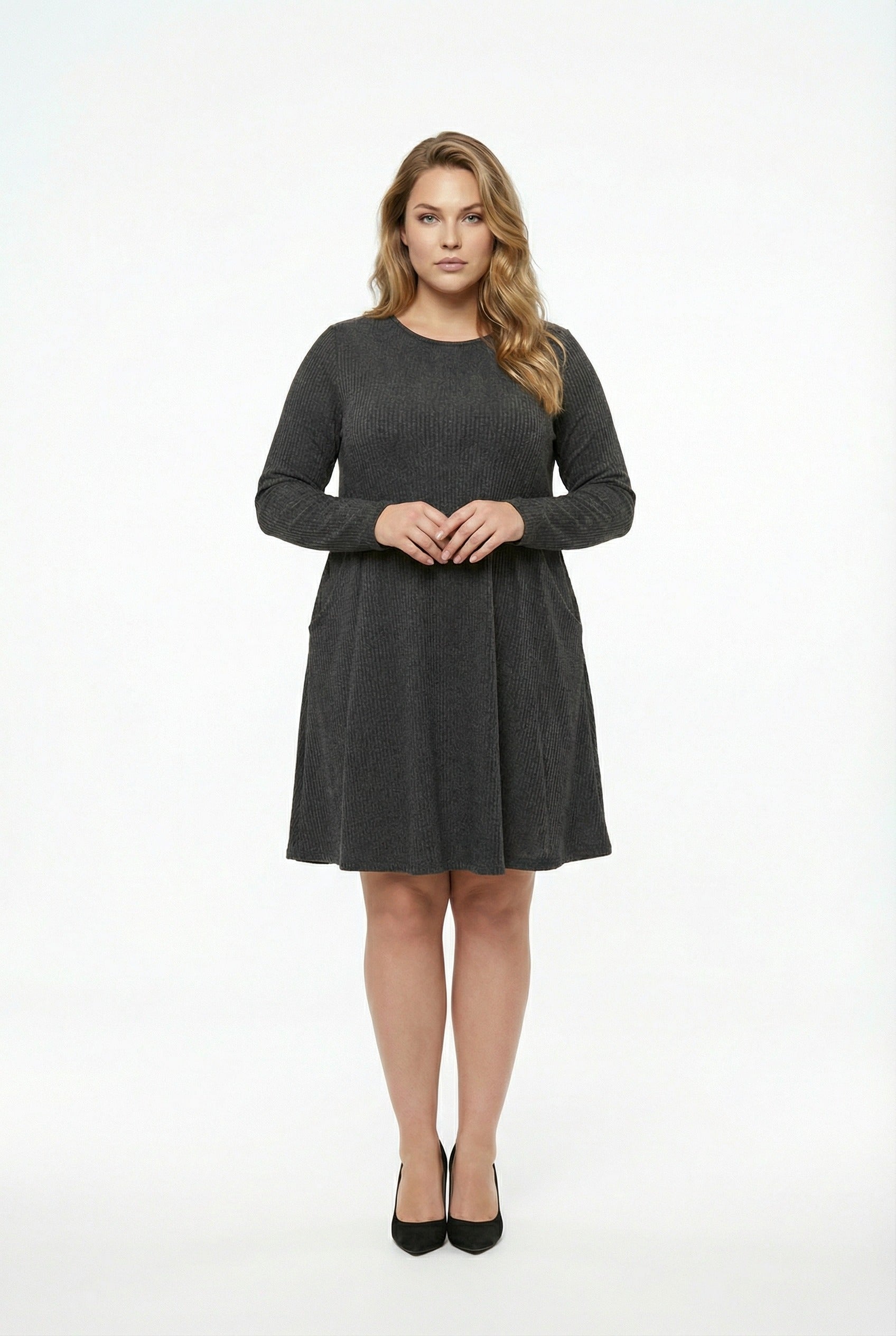 שמלה במידות גדולות שרוול ארוך צווארון עגול עם כיסים בד במרקם מיני 304008