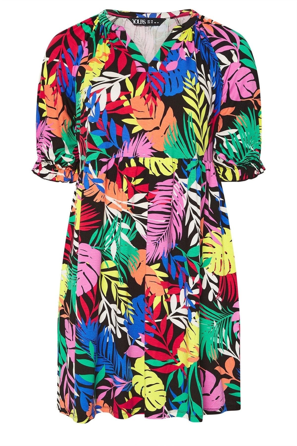 - פרטי הדגם: צווארון פתוח עם חריץ, שרוול קצר עם מלמלה, דוגמת טרופי, מיני