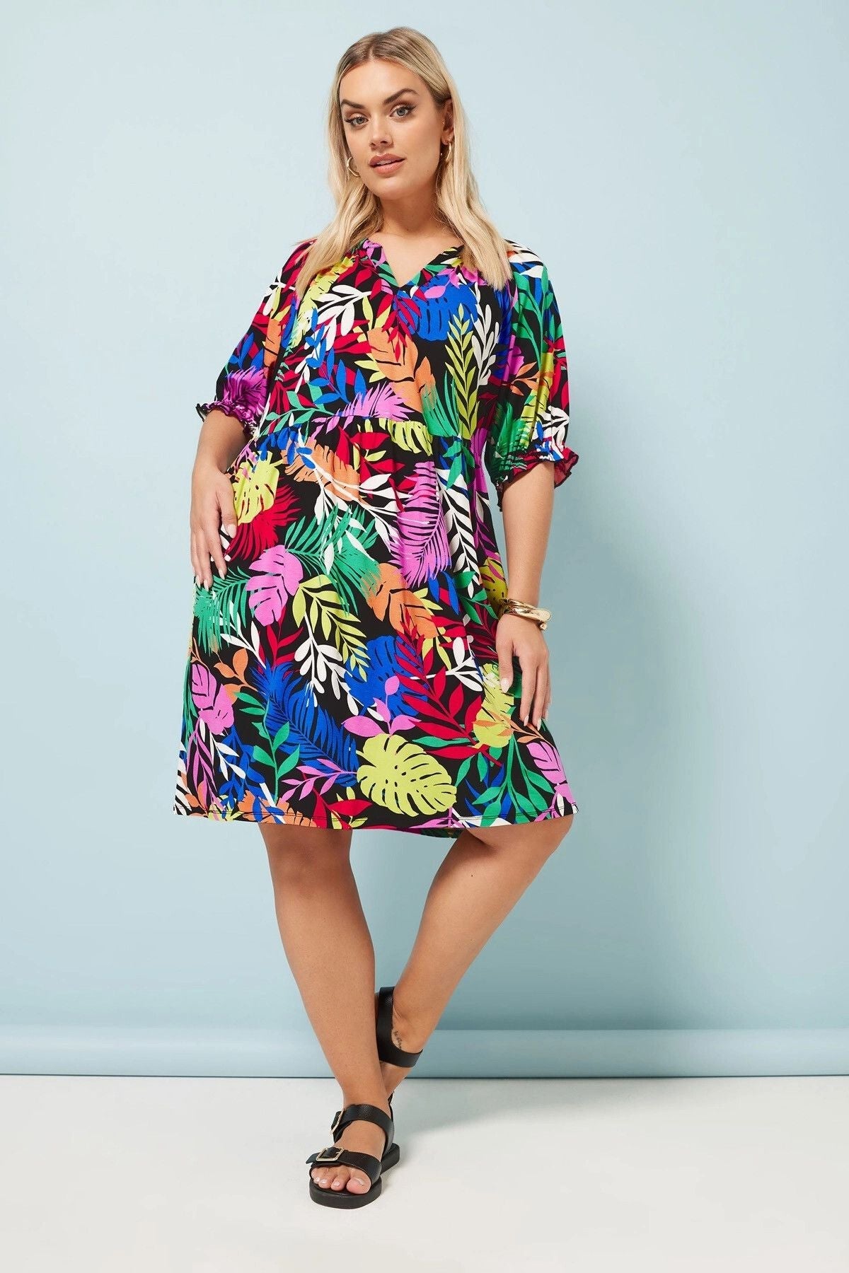 - תיאור מוצר: חווי אווירת חופשה עם שמלת המיני בדוגמת טרופי זו. שמלה זו, המיוצרת מבד ג'רסי נוח, מעניקה מראה נשי עם שרוולים קצרים עם מלמלה ועם צווארון פתוח עם חריץ. דוגמת הטרופי הבולטת מאפשרת ליצור מראה מושלם לטיול החופשה הבא שלך בשילוב סנדלים. פריט שיהפוך לאחד ההכרחיים בארון שלך.