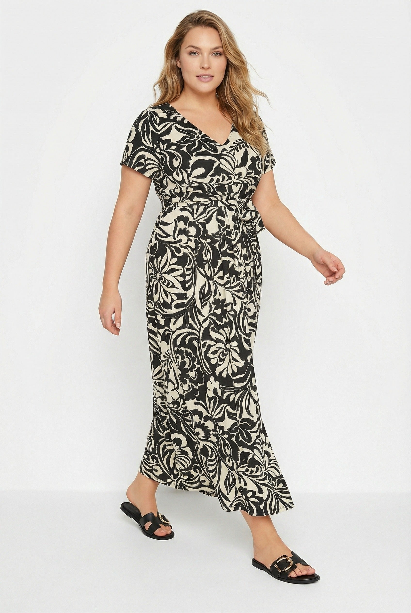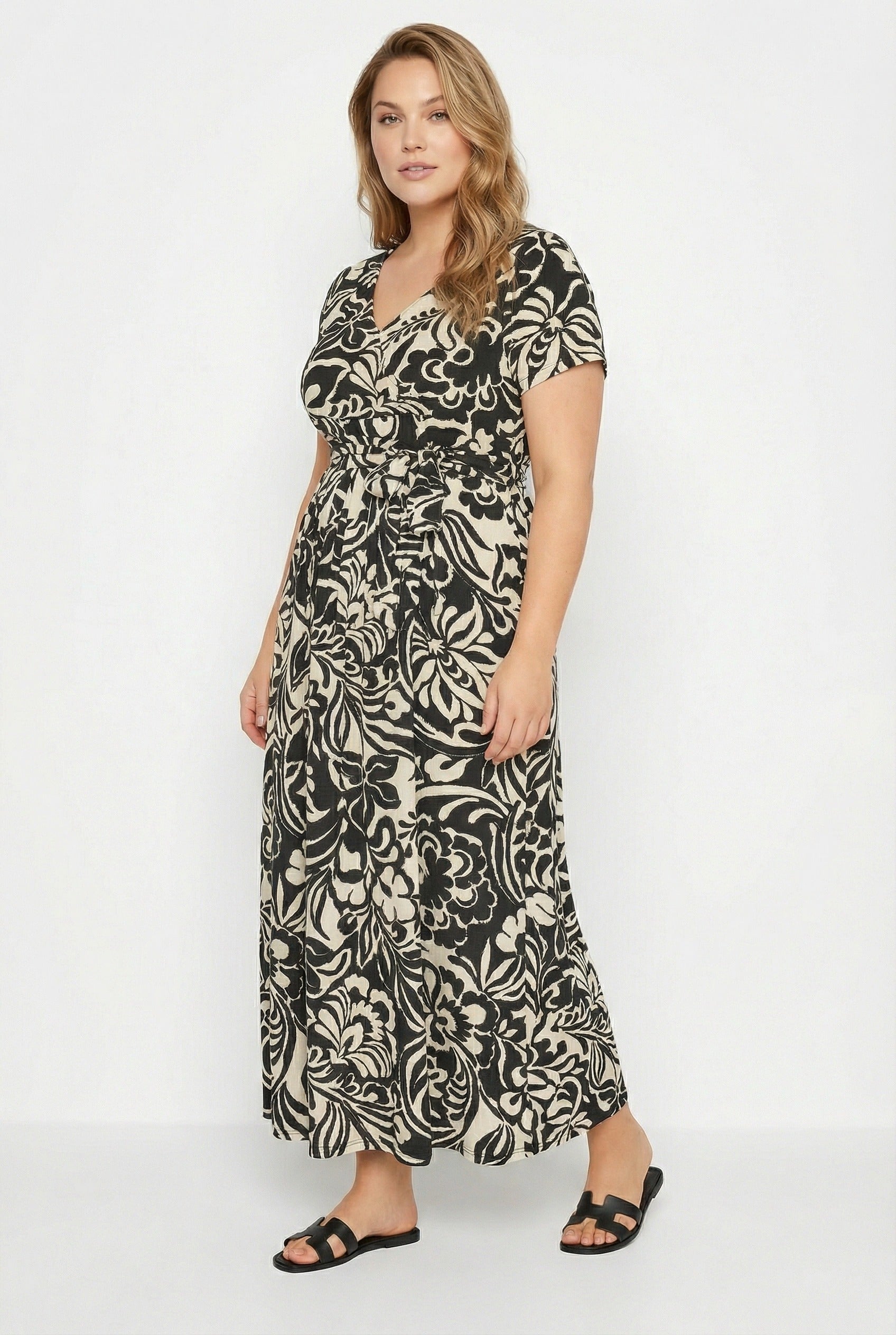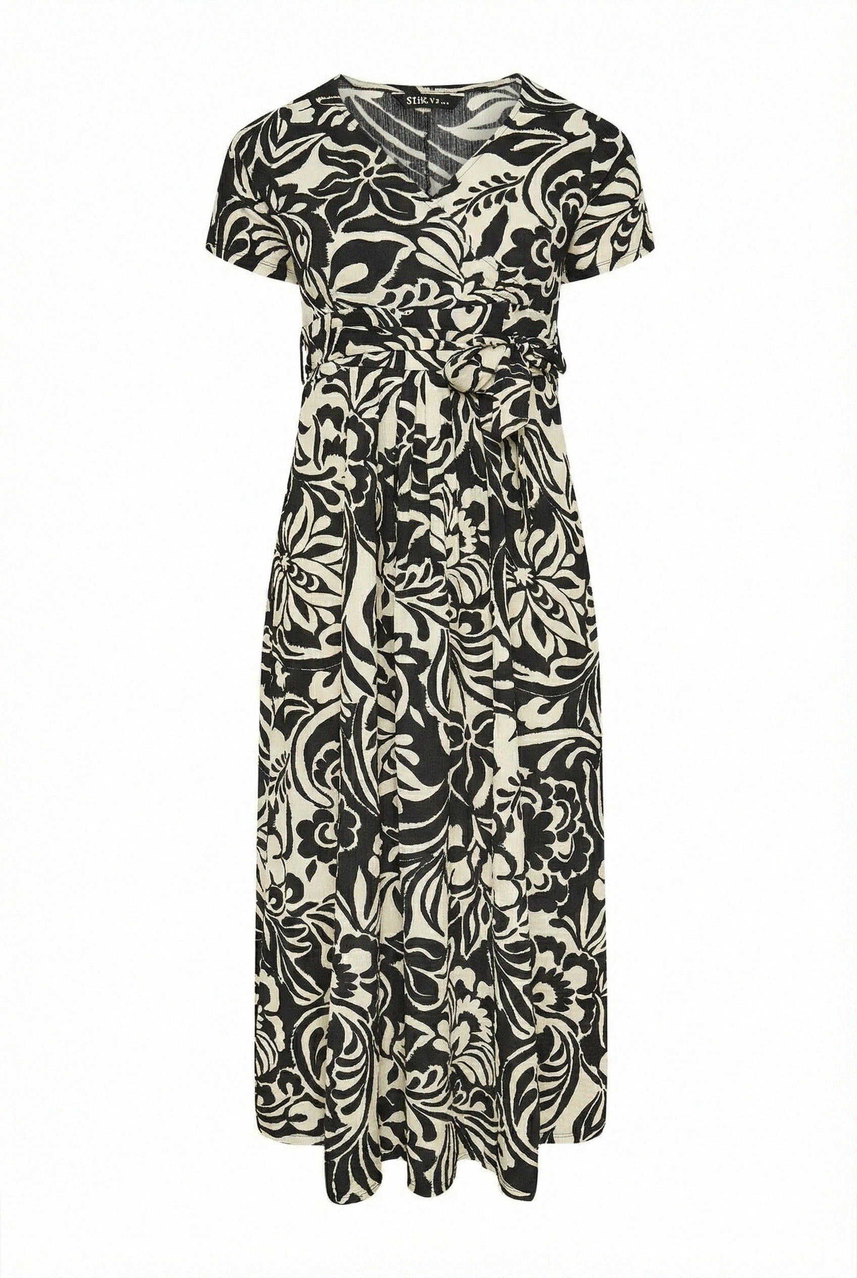 - פרטי הדגם: דוגמת פרחים, גזרת מעטפת, קשירה במותן, צווארון וי, שרוול קצר, מקסי