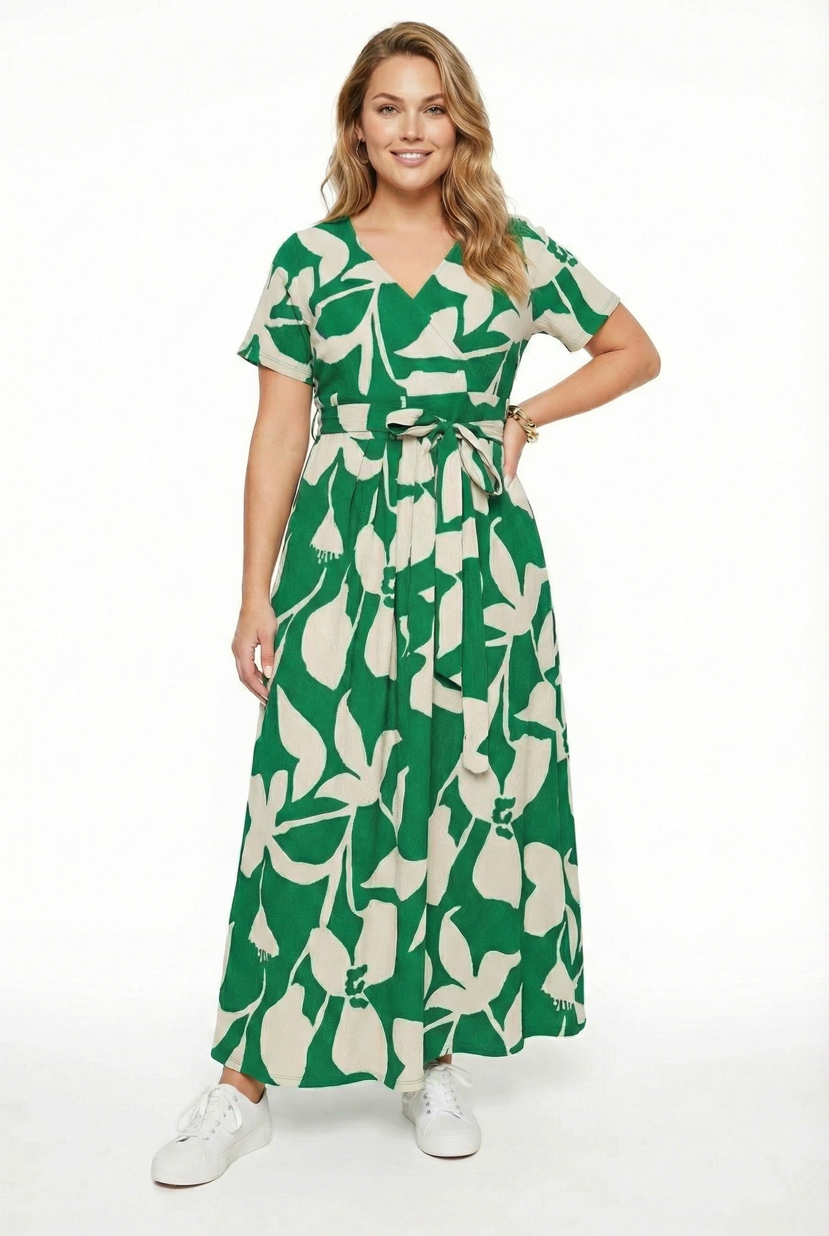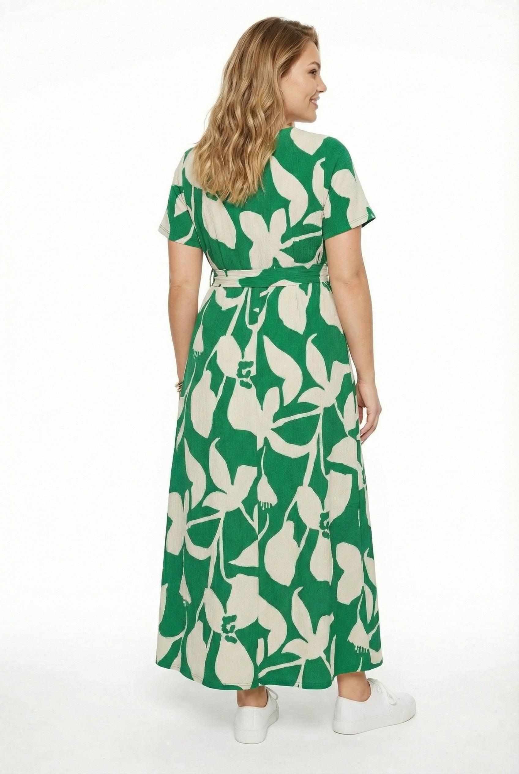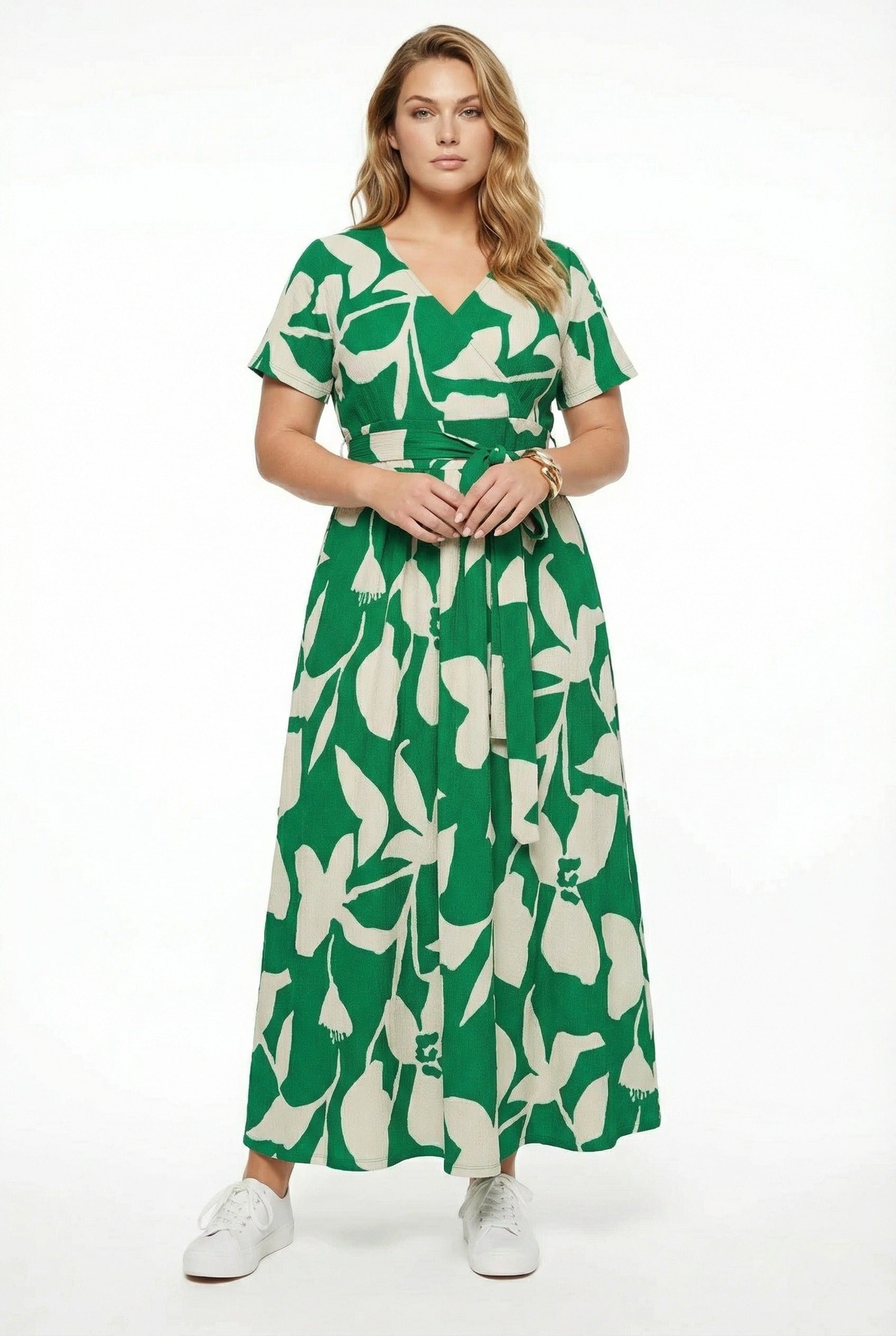 • פרטי הדגם: דוגמת פרחים מופשטת, צווארון מעטפת, חגורה במותן, שרוול קצר
