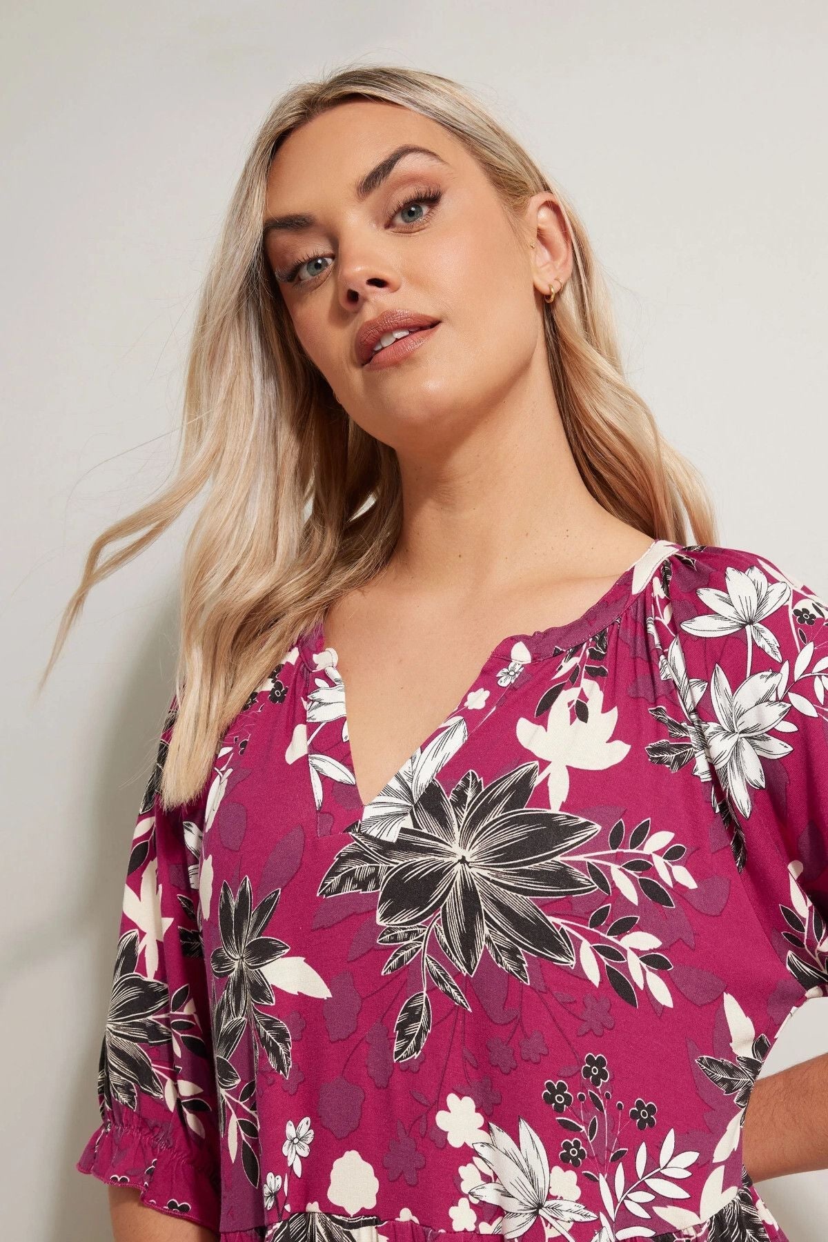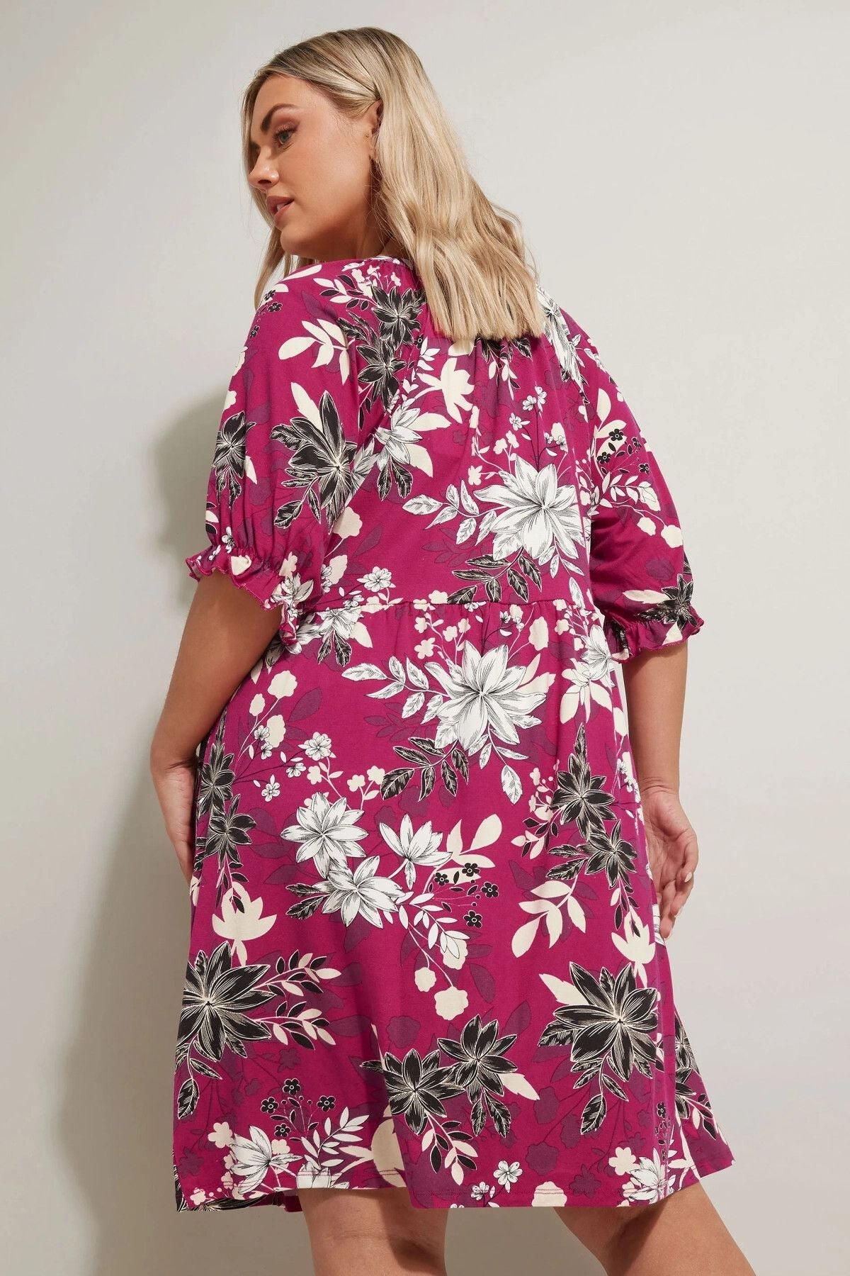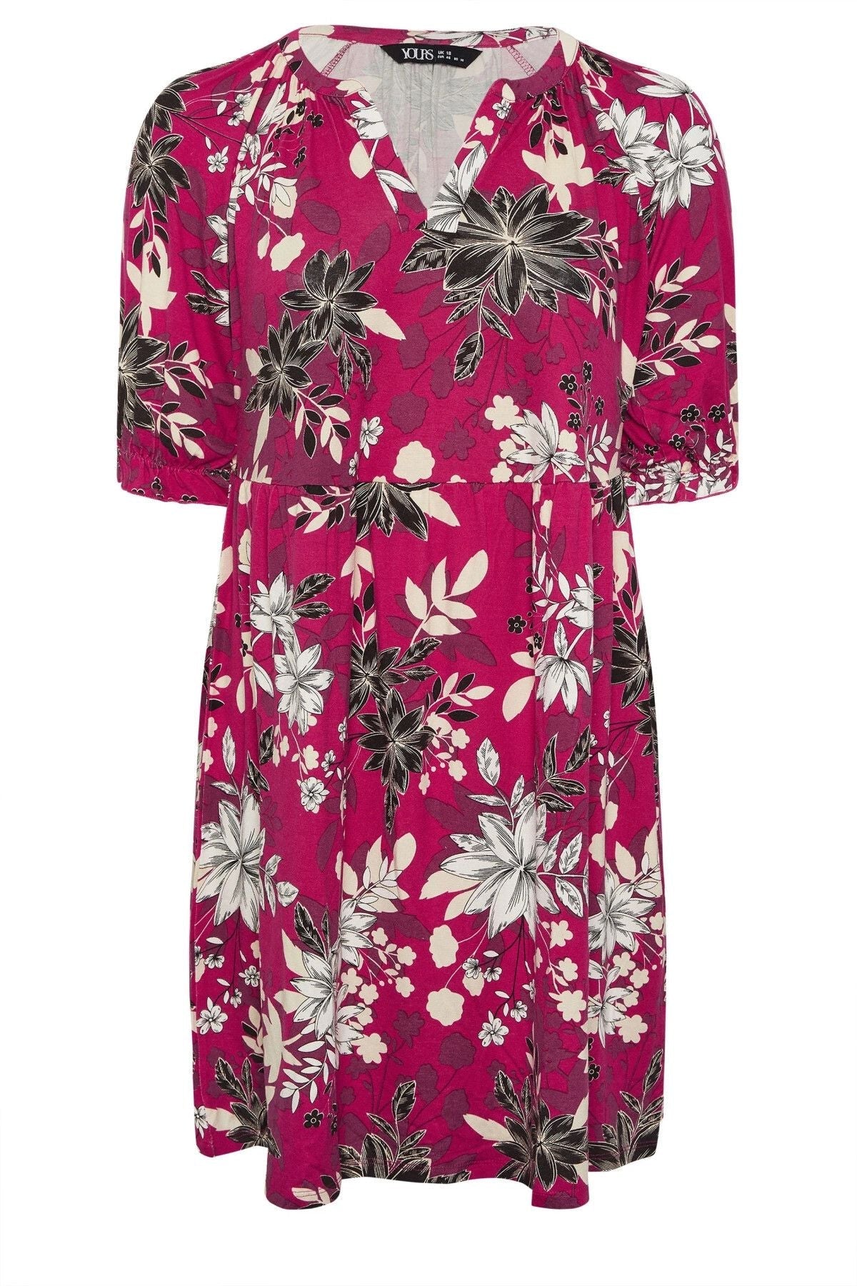 - פרטי הדגם: דוגמת פרחים, צווארון עם חריץ, שרוול בלון קצר, מיני