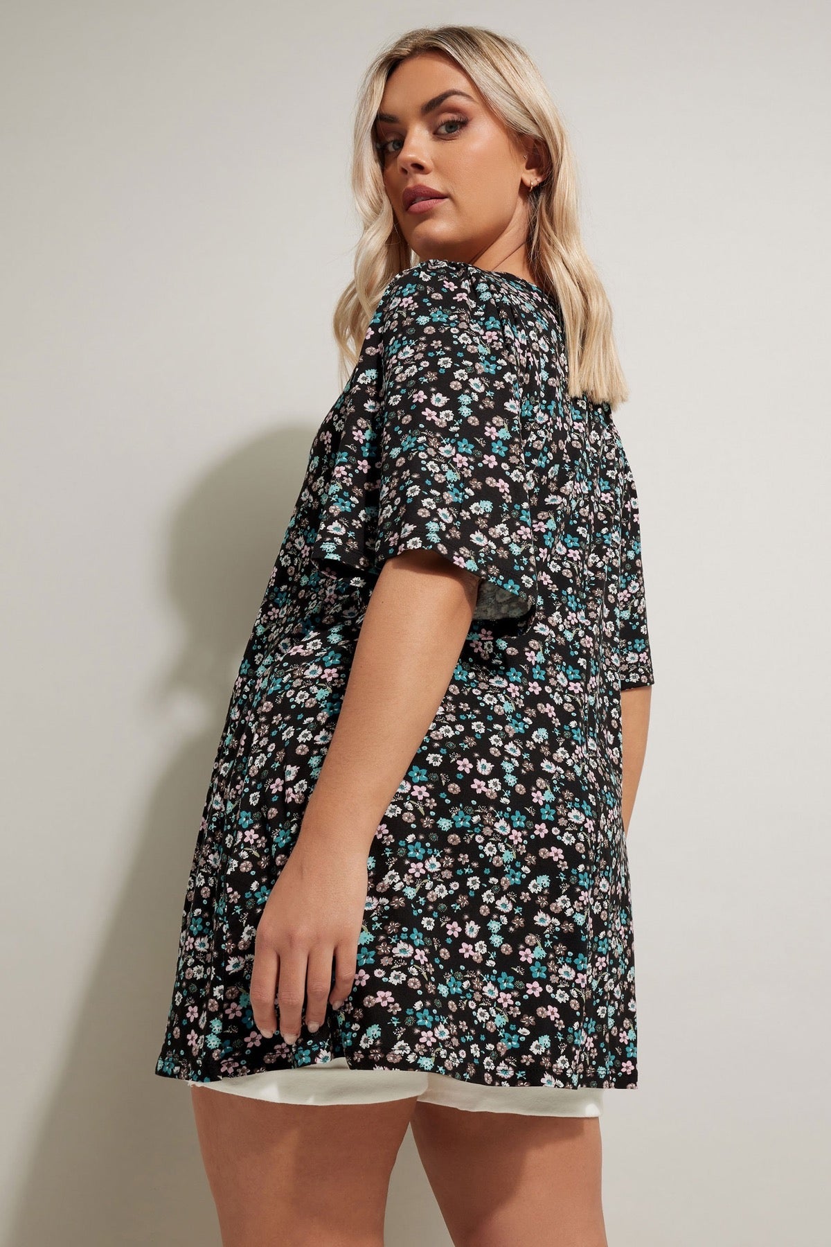 טישירט במידות גדולות ללא שרוולים צווארון V דוגמת פרחים גזרה א-סימטרית קפלים בחזית 304084